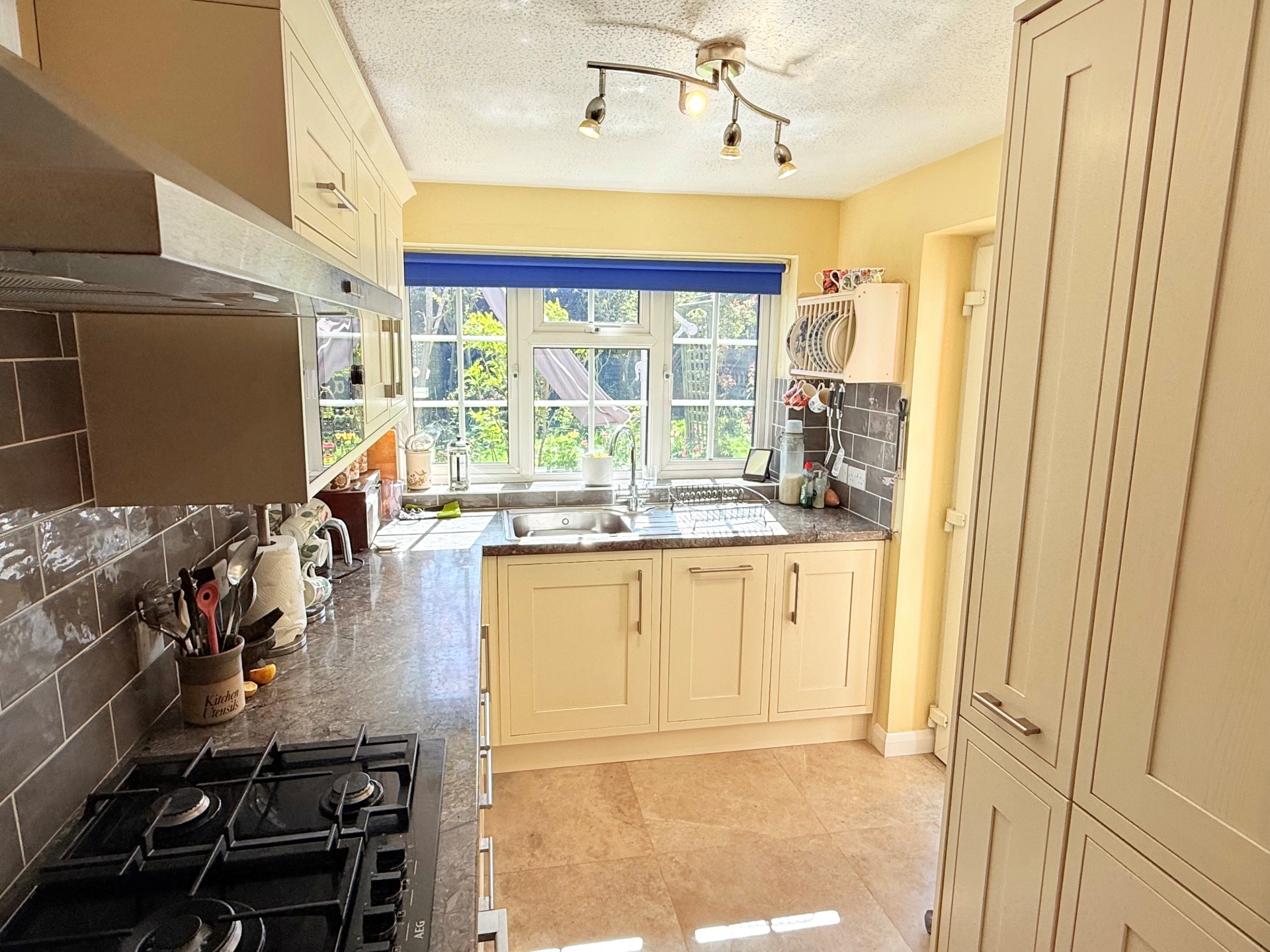 uPVC double glazed window to side and rear elevation. uPVC double glazed door to rear garden. Wall mounted and base units. Five ring gas hob with chimney style extractor over. Integral oven and grill. Fridge and freezer. Integrated dishwasher. Tiled floor. Stainless sink. Pantry cupboard.