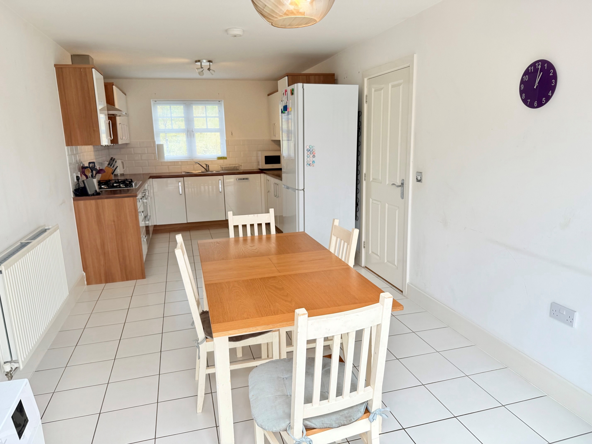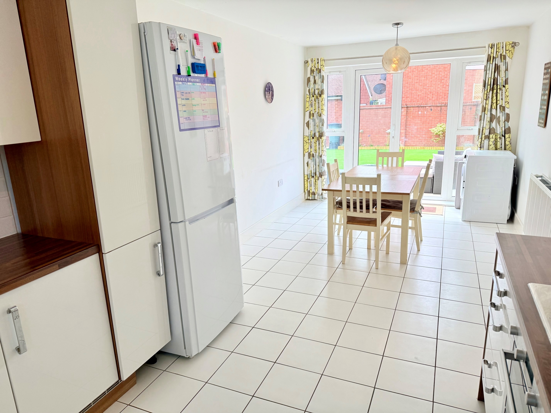 uPVC double glazed window to front elevation and uPVC double glazed French doors to rear elevation. Radiator. Wall and base units. One and a half bowl stainless steel sink unit. Integrated dishwasher. Space for upright fridge/freezer. Five ring gas hob, oven and grill with extractor over.