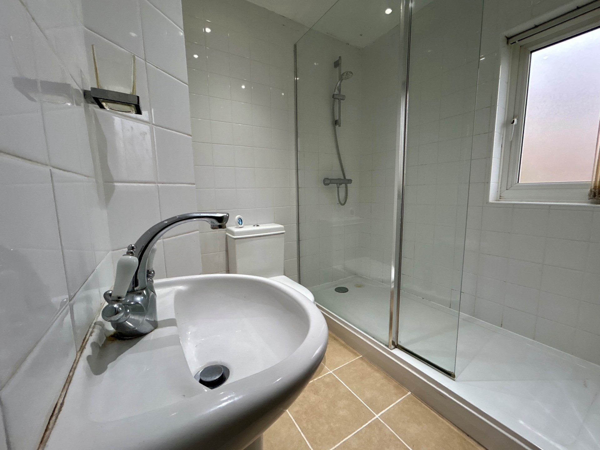 uPVC double glazed window to front elevation. Double shower cubicle. Tiled flooring and full height tiled walls. Low level WC. Pedestal wash hand basin. Chrome heated towel rail.