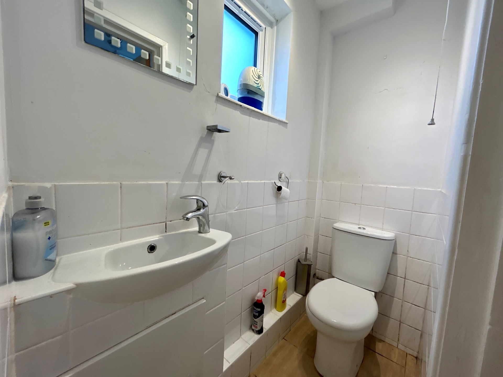 Obscure uPVC double glazed window to side elevation. Radiator. Wash hand basin. Half height tiling. Low level WC.