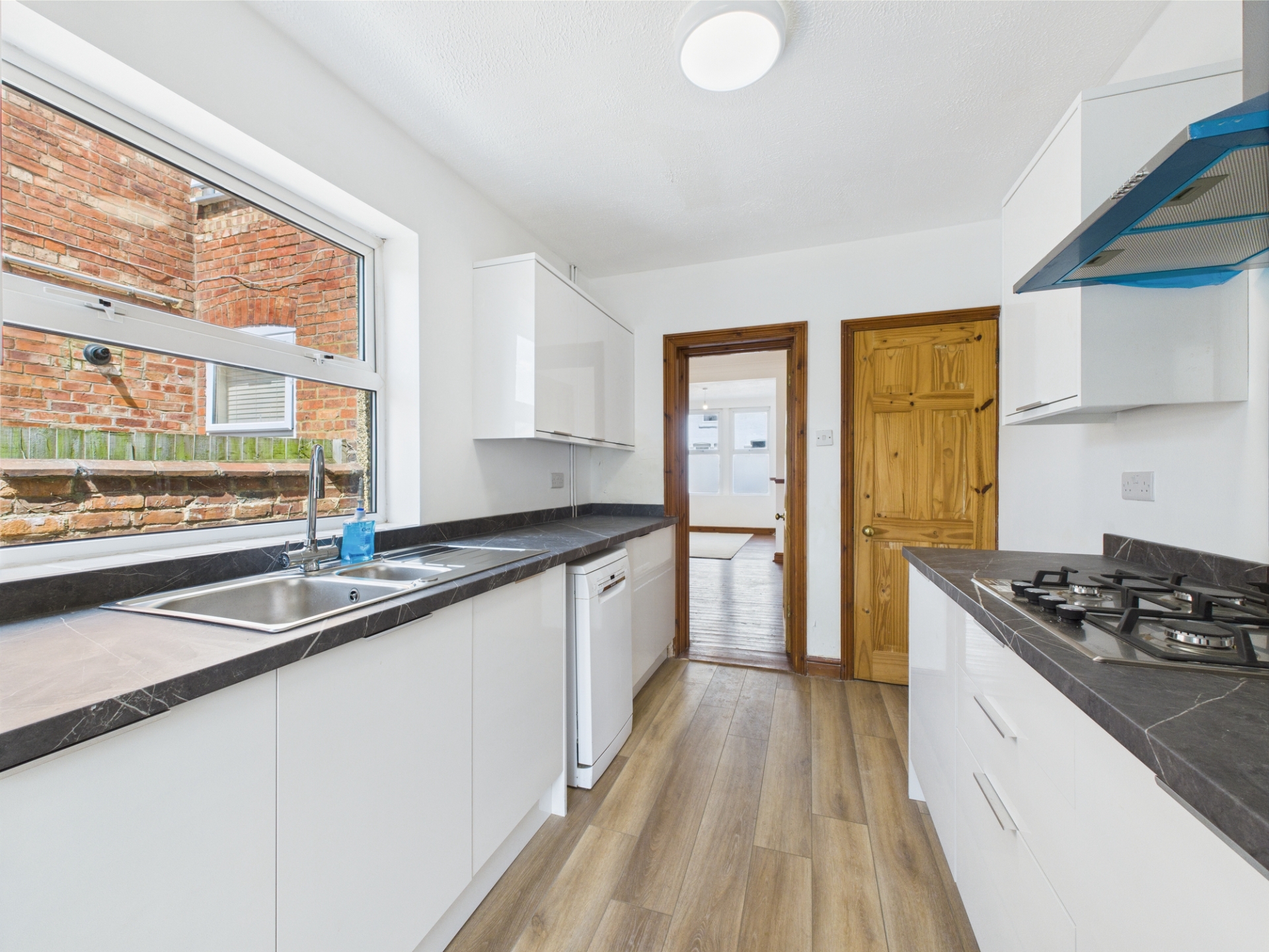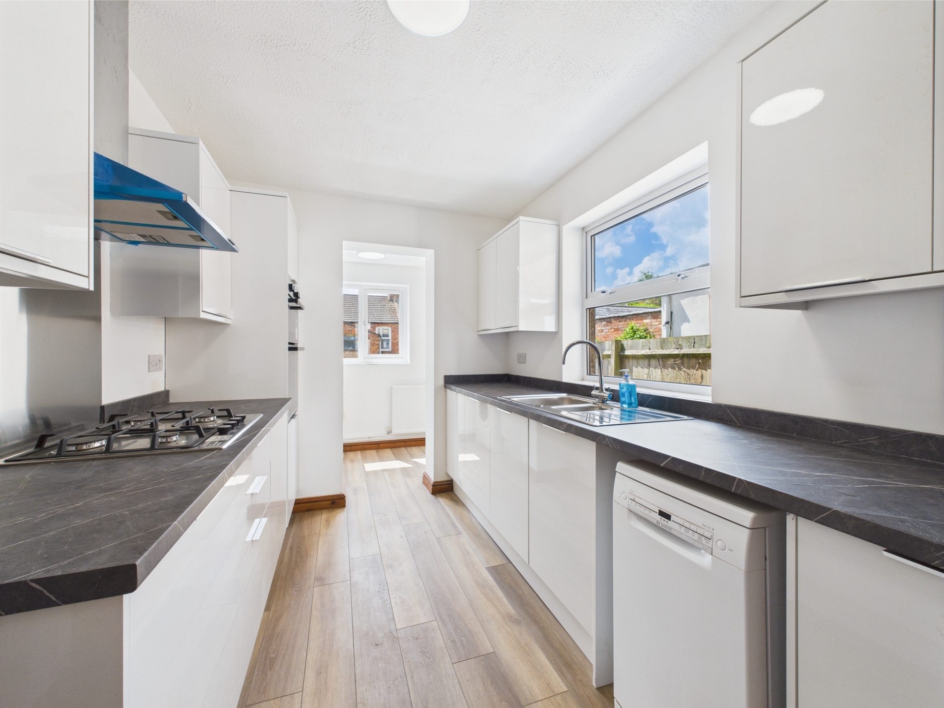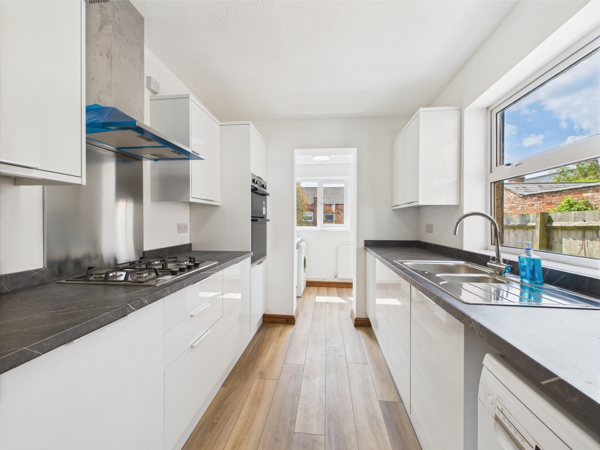 UPVC double glazed window to side elevation. Fitted with a range of base level and wall mounted gloss units with work surface over. Stainless steel sink and drainer with mixer tap over. Integrated appliances to include double oven, gas hob and extractor canopy. Space for further white goods. Opening to;