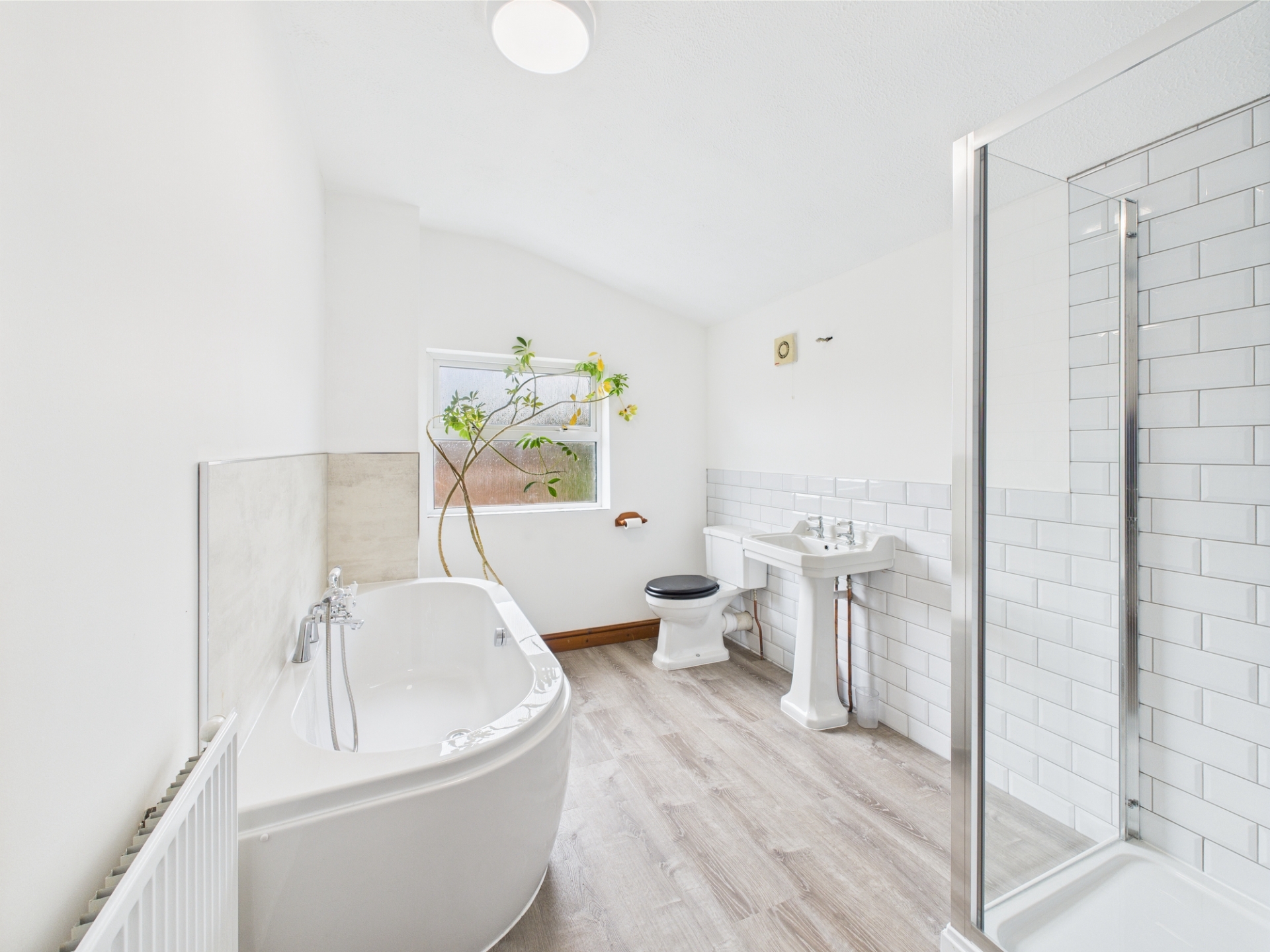 UPVC obscure glazed window to rear elevation. Radiator. Fitted four piece suite comprising freestanding bath tub, walk in double shower cubicle, low level WC and pedestal hand wash basin. Extractor fan.
