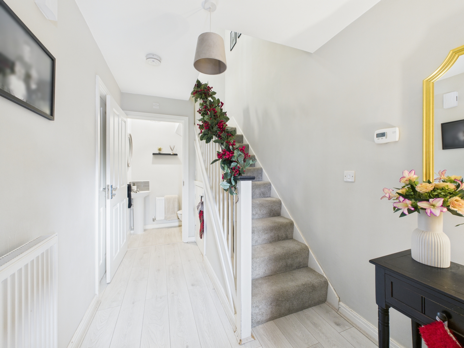 Upstairs, there are two double bedrooms and one single size plus a bathroom with shower over the bath.