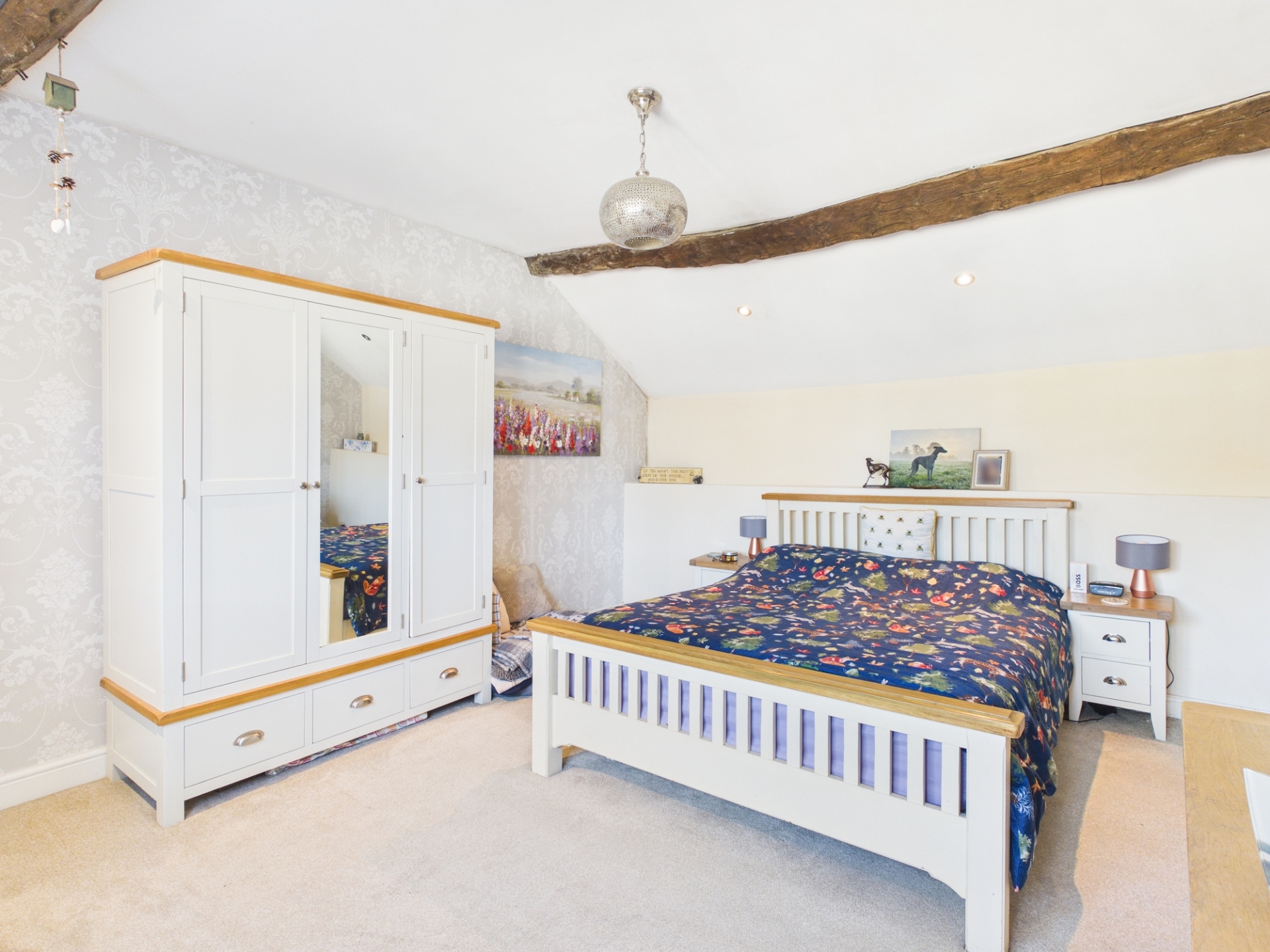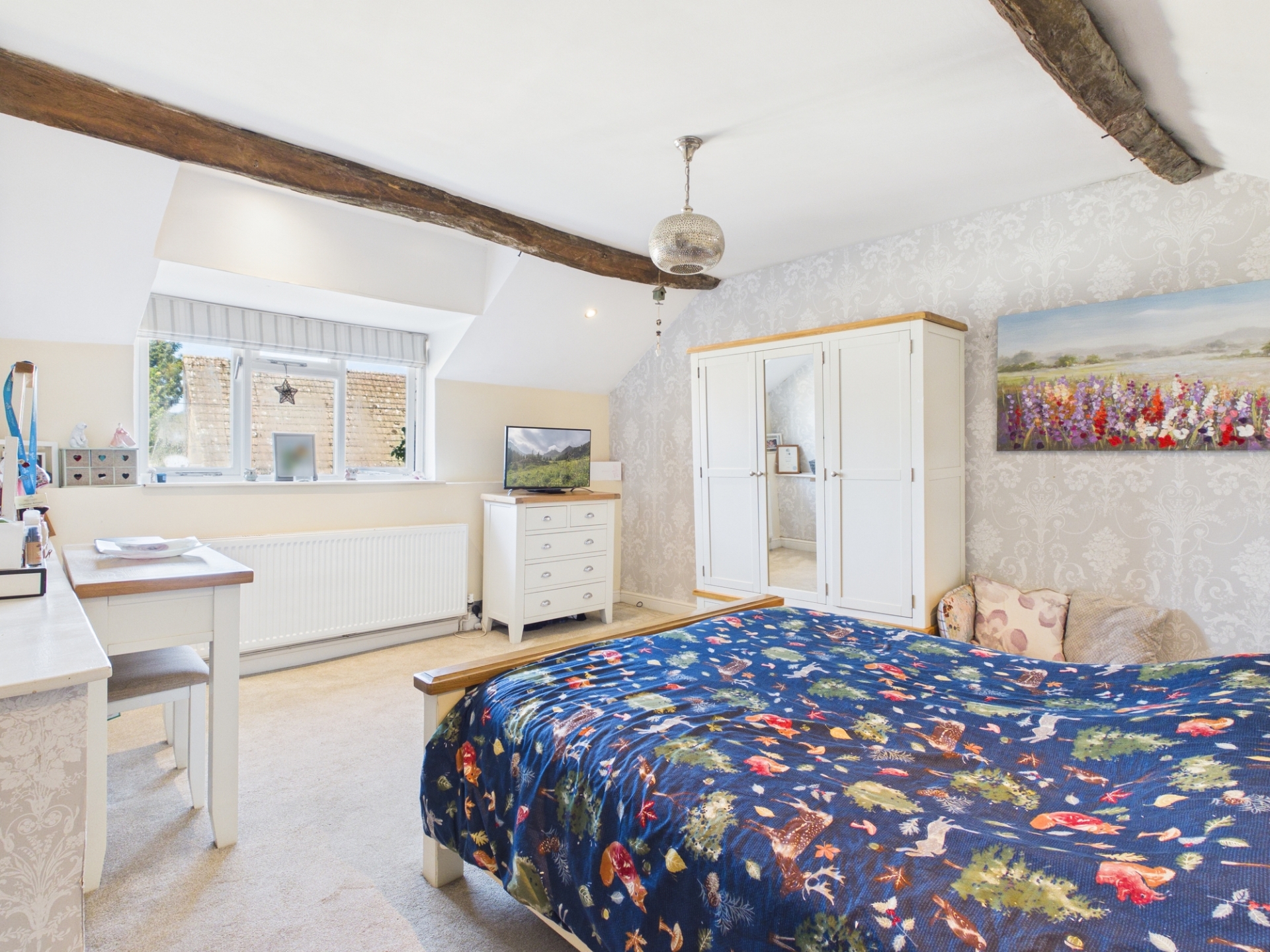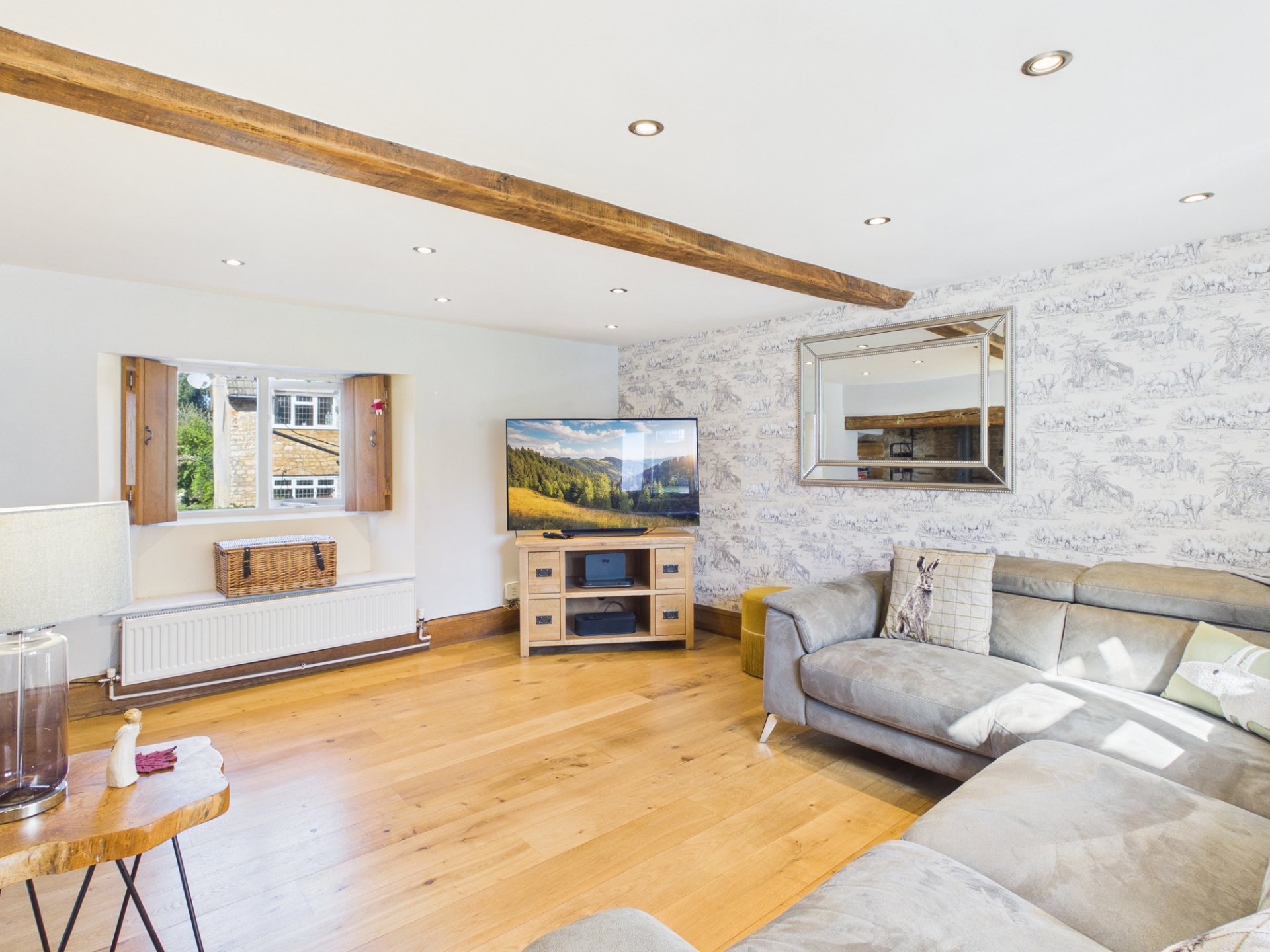 Upstairs, the landing leads to all bedrooms, including a spacious principal bedroom with exposed beams and delightful views over the village. There are three further well proportioned bedrooms, two of which benefit from fitted wardrobes. The family bathroom has been tastefully renovated, featuring an exposed brick wall, a roll top bath, a separate shower, and stylish character tiling.