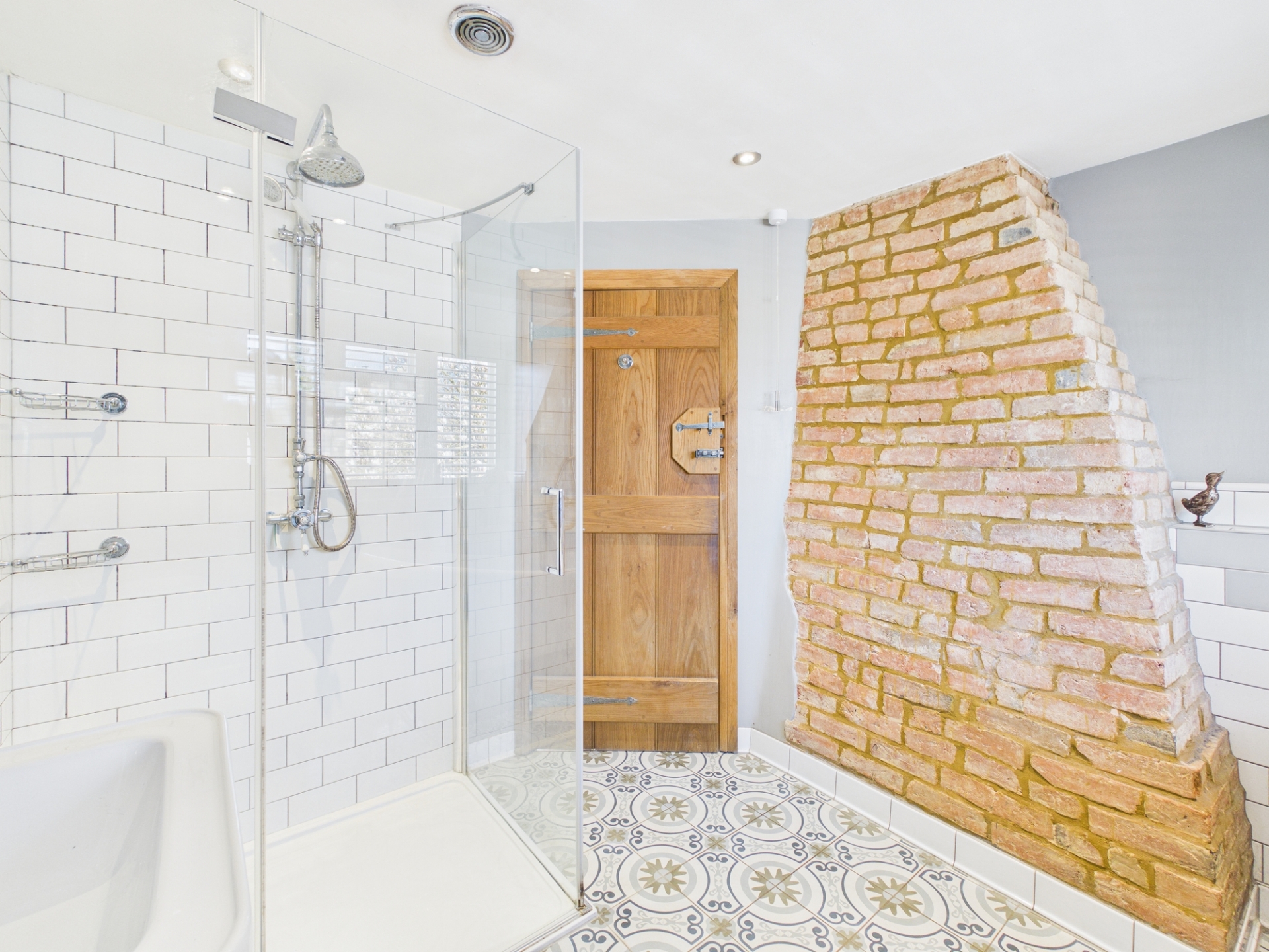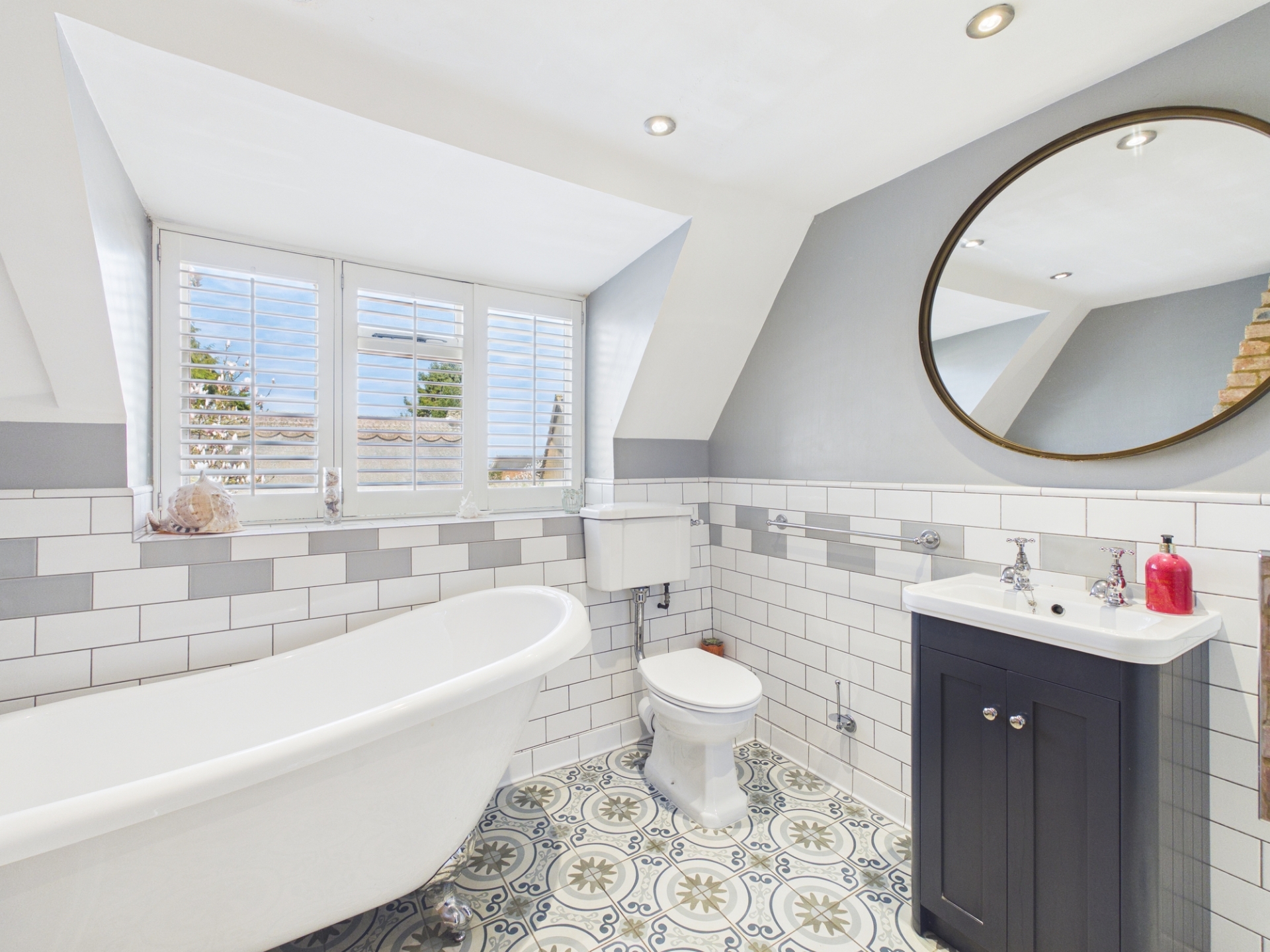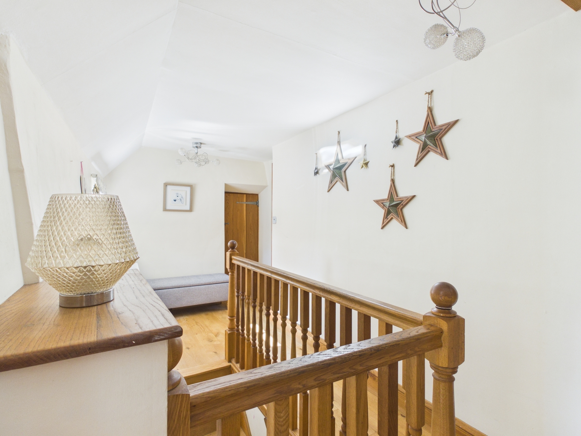 Upstairs, the landing leads to all bedrooms, including a spacious principal bedroom with exposed beams and delightful views over the village. There are three further well proportioned bedrooms, two of which benefit from fitted wardrobes. The family bathroom has been tastefully renovated, featuring an exposed brick wall, a roll top bath, a separate shower, and stylish character tiling.