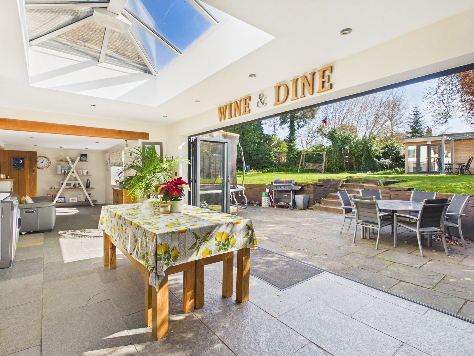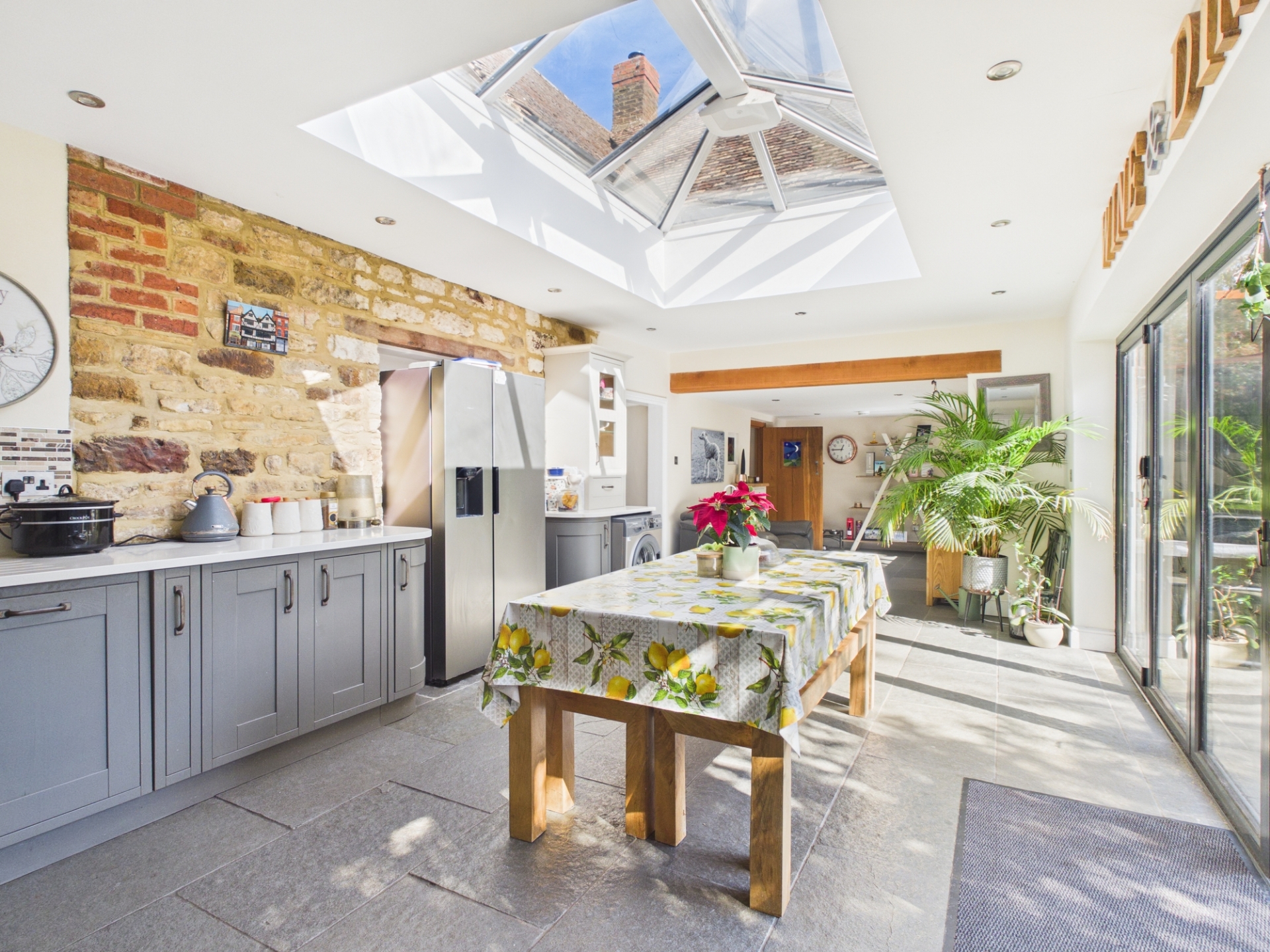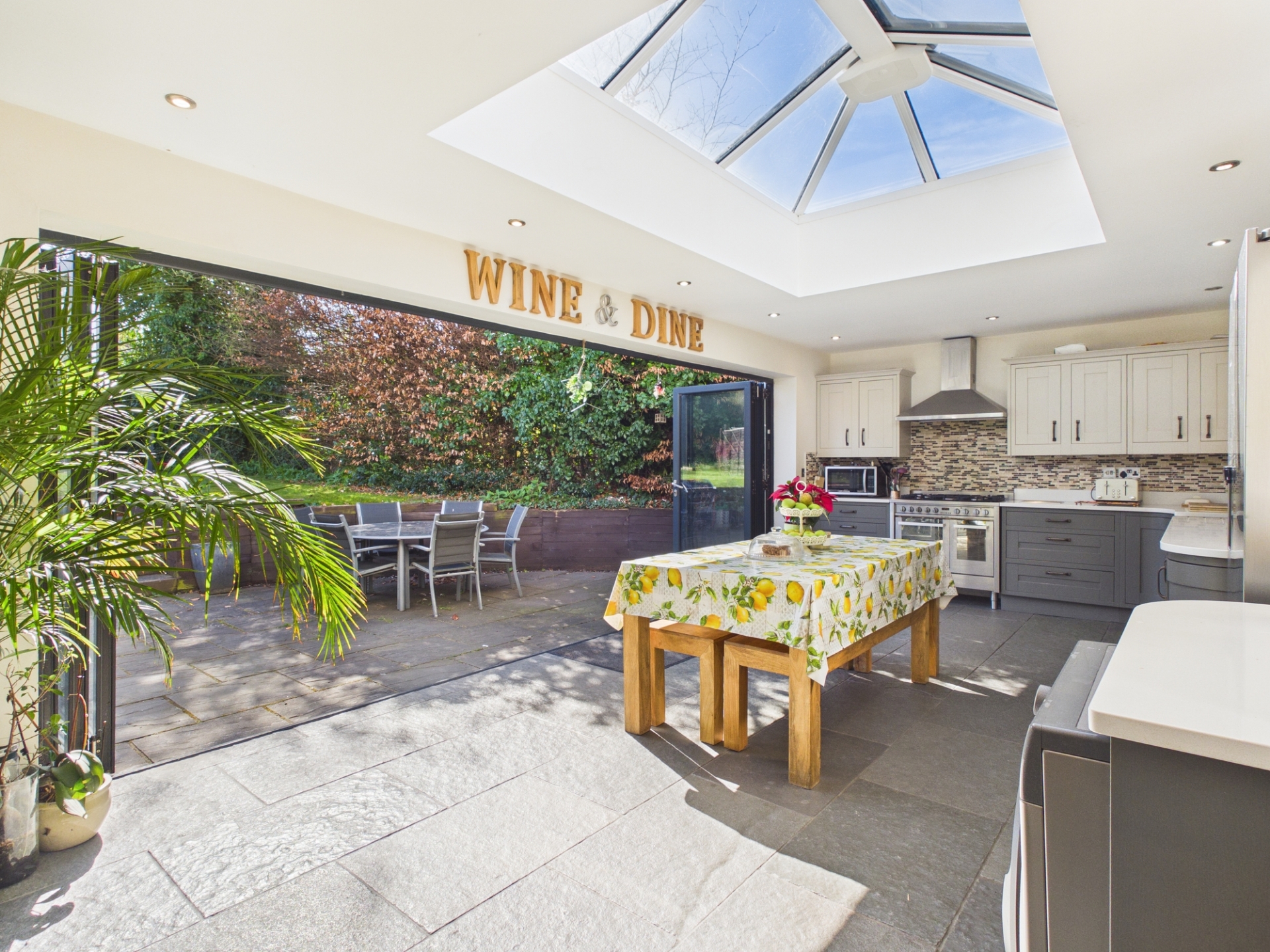 To the rear, the stunning kitchen / dining / family room is the true heart of the home. Flooded with natural light from a large roof lantern and bi-fold doors that open directly onto the patio, this space is ideal for both everyday living and entertaining. The kitchen is beautifully appointed with quartz worktops, a range cooker, Belfast sink, and ample space for dining and relaxed seating areas.