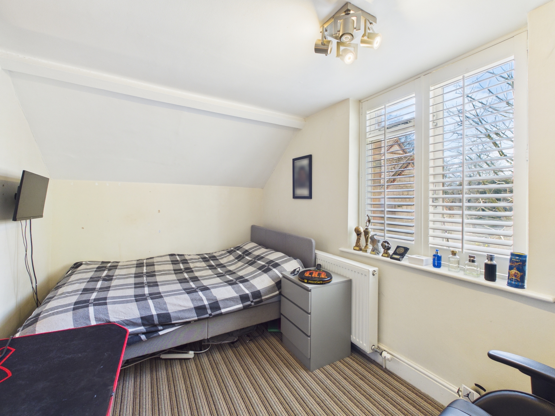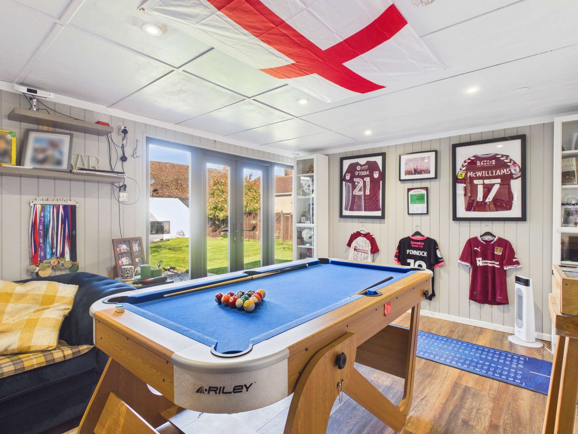 The front garden is set behind a natural shrub border and includes a lawn, a mature magnolia tree, and a side patio area. The private, south facing rear garden has been thoughtfully landscaped, offering a generous patio ideal for entertaining, with steps leading to a large lawn. At the far end sits a garden room, currently arranged as a leisure space complete with a pool table, darts area, and bar.