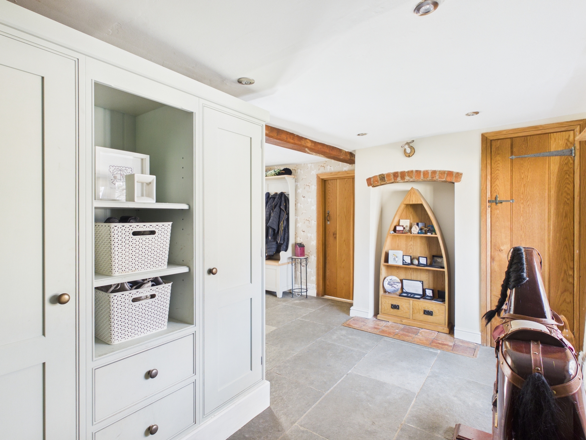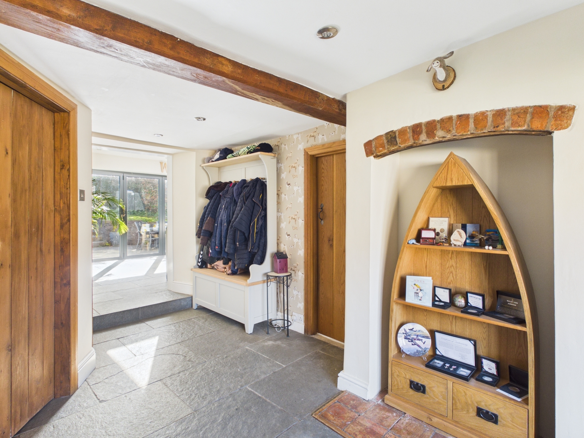 Upon entering, you are welcomed into a spacious reception hall featuring a charming window seat, bespoke storage for coats and shoes, an alcove where the original fireplace once stood, and a hidden door leading to the cellar. Stairs rise to the first floor, while doors lead to all principal ground floor rooms.
