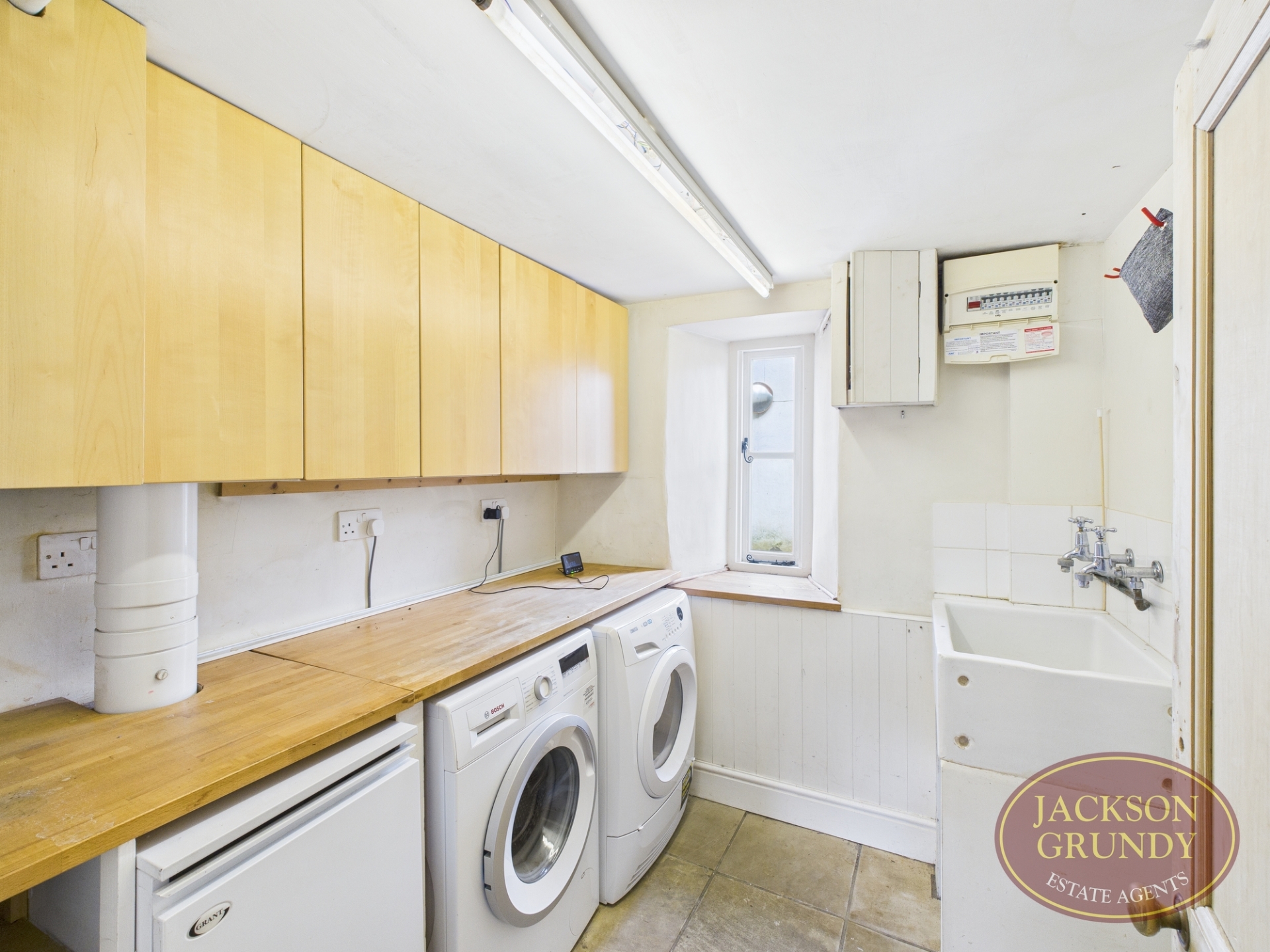 The kitchen / breakfast room has a four oven Aga, a range of traditional units, ceiling beams and flagstone floor which continues into the utility room with a Belfast sink.