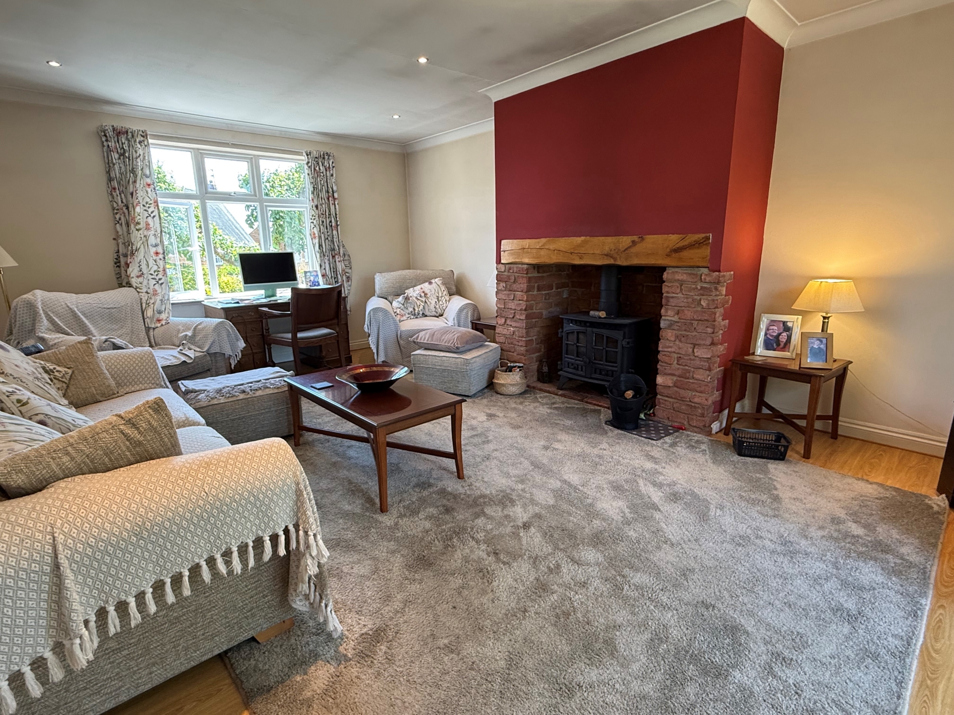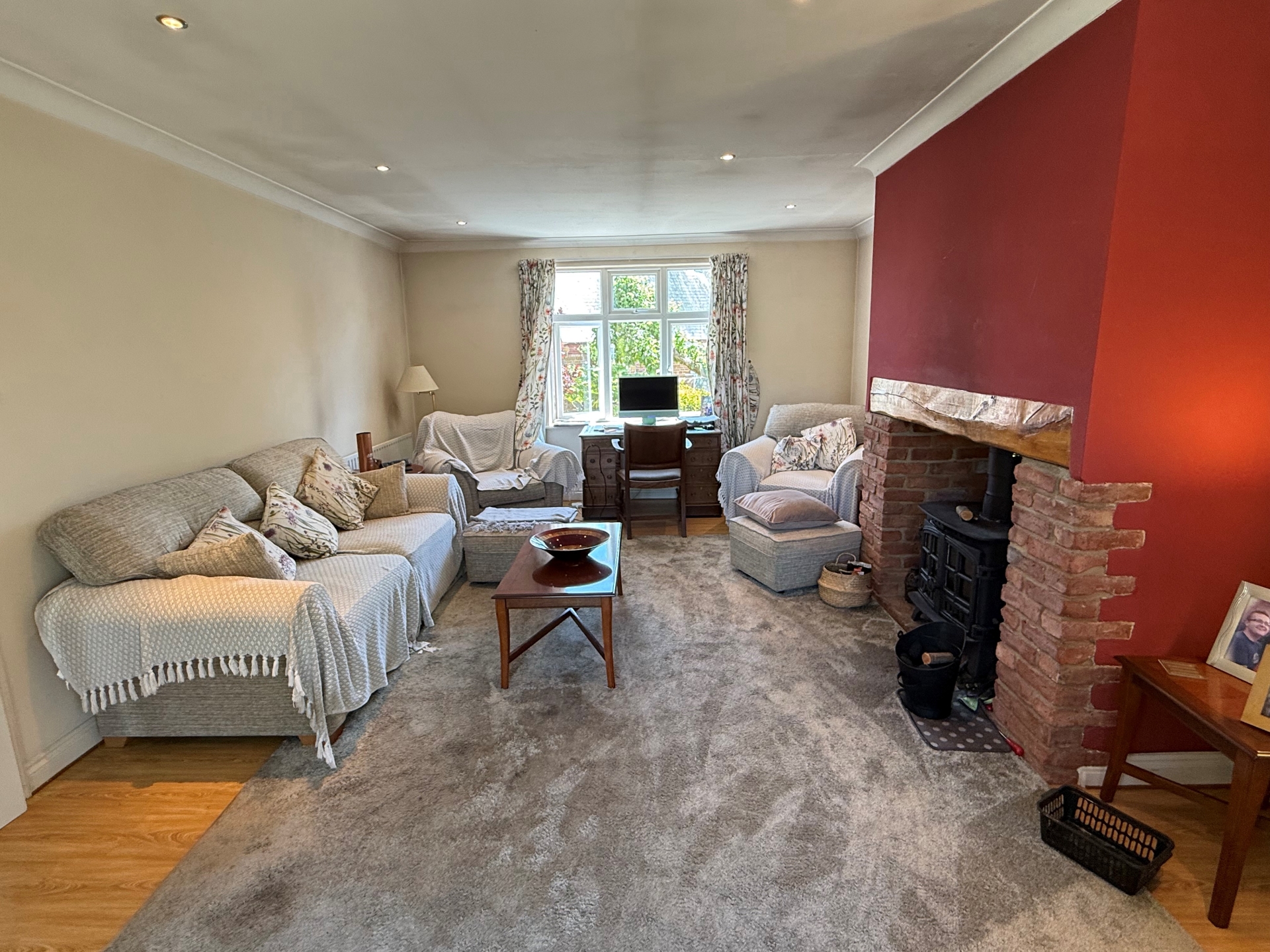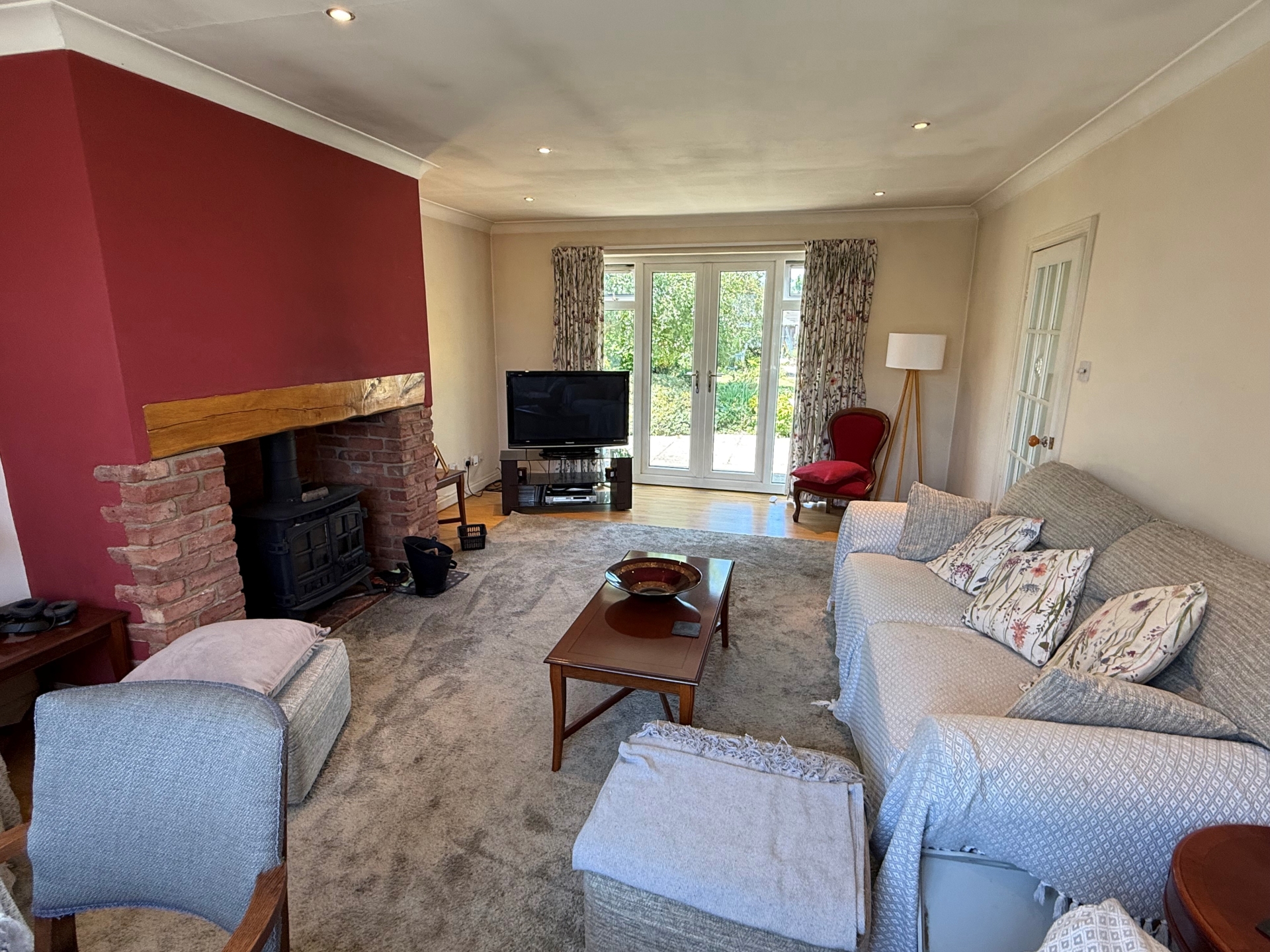 uPVC double glazed window to front elevation and French doors to rear elevation. Radiator. Chimney breast with large wood burning stove. Coving. Spotlights. Wood effect flooring.