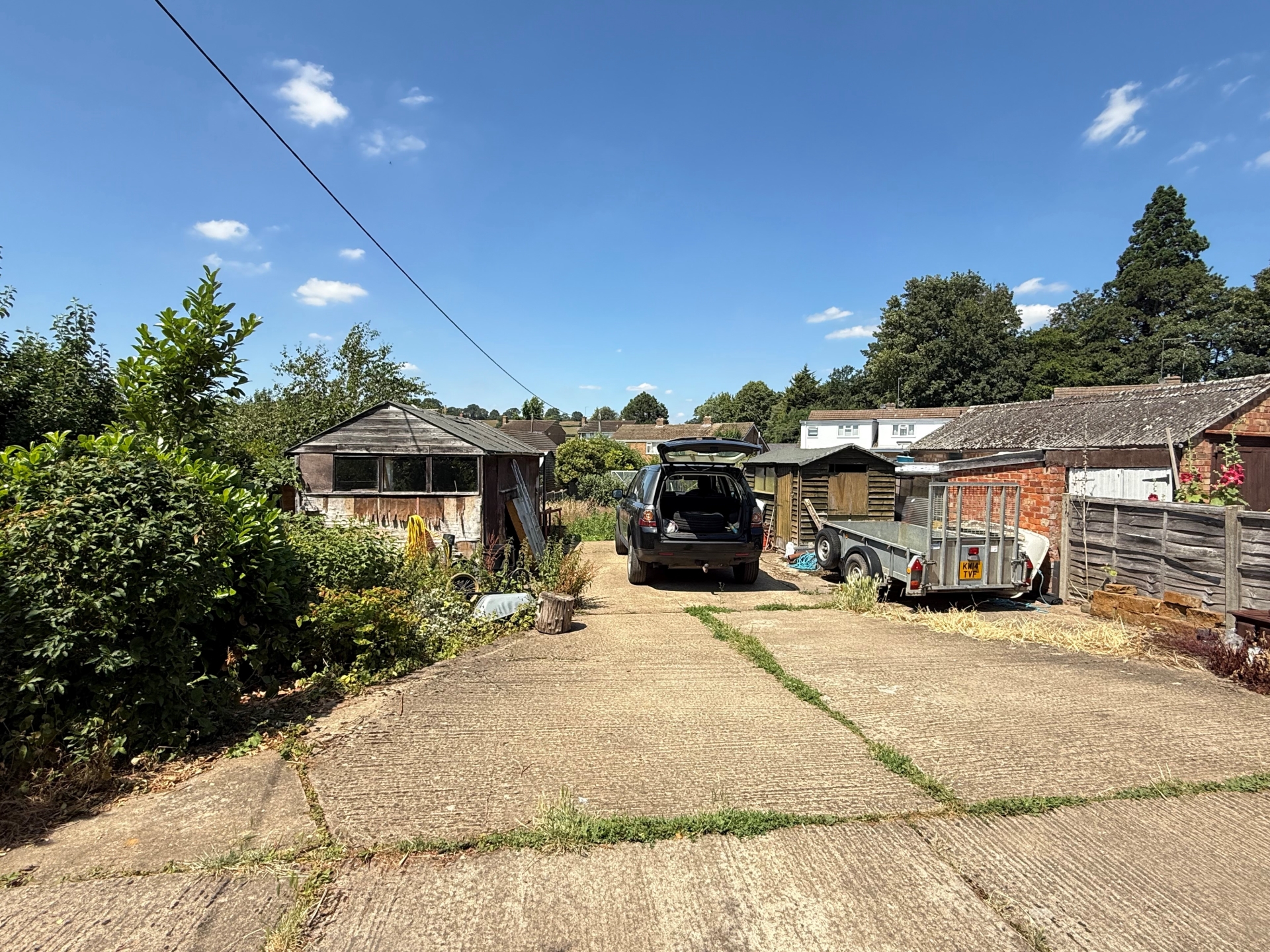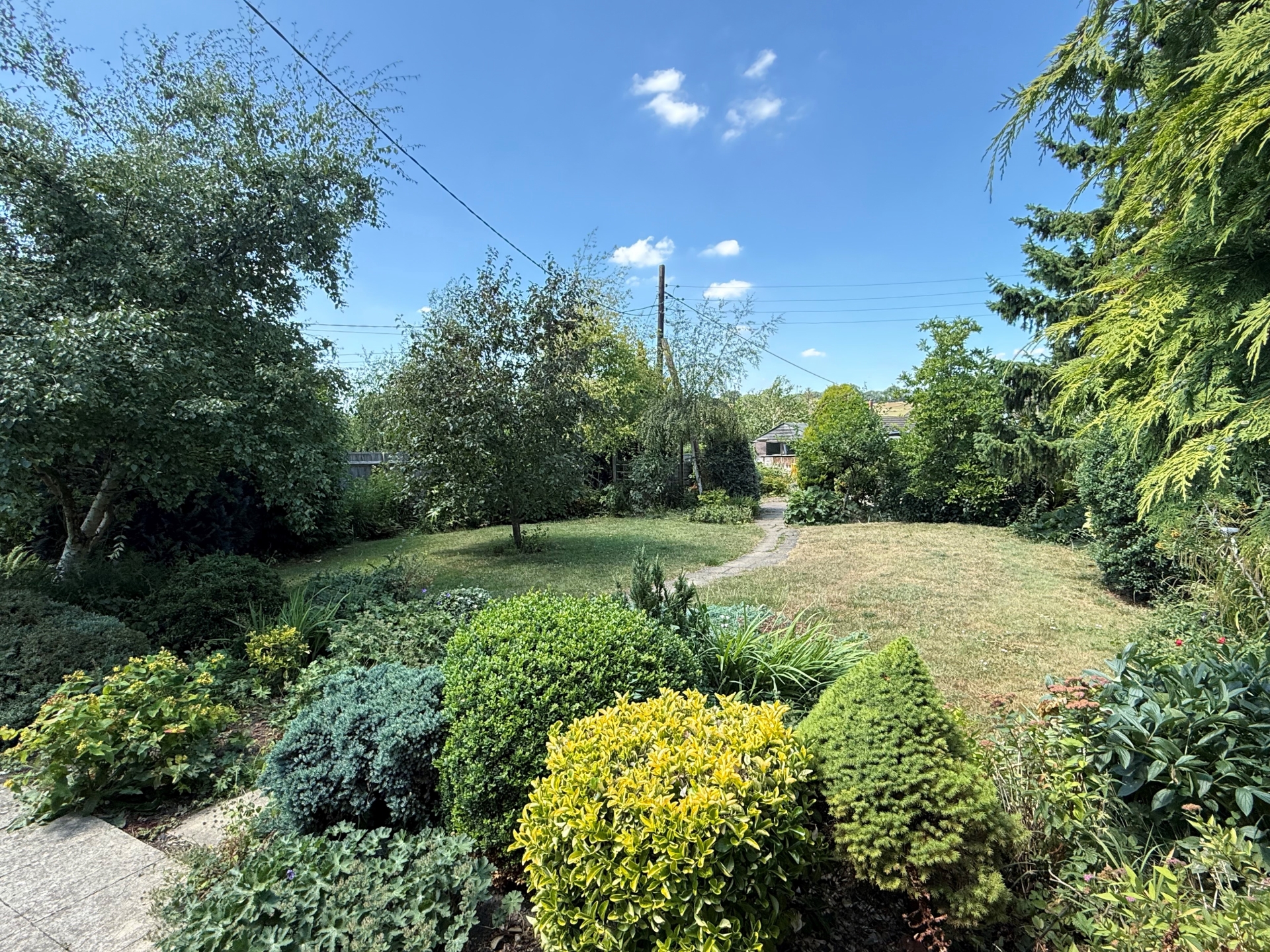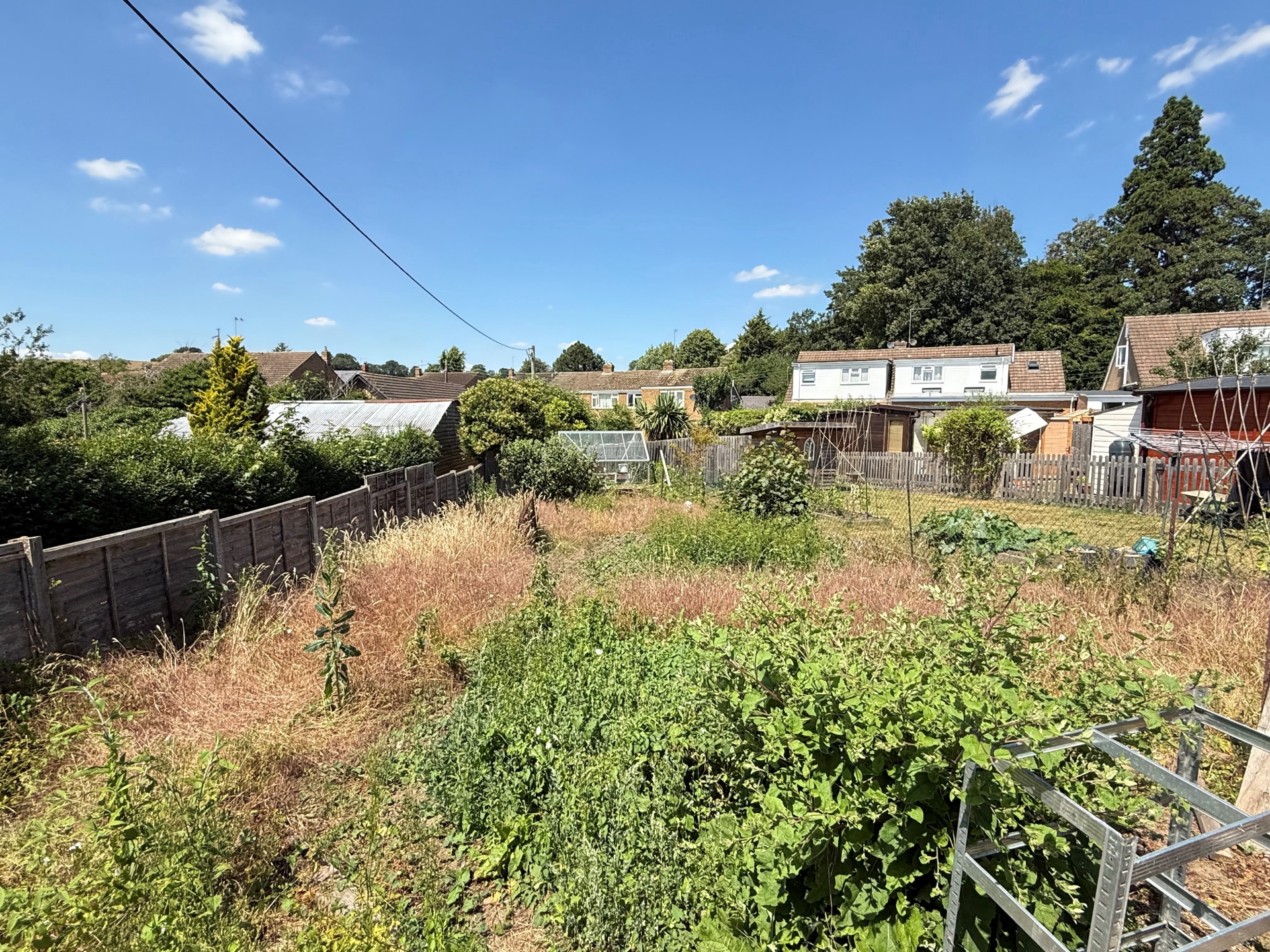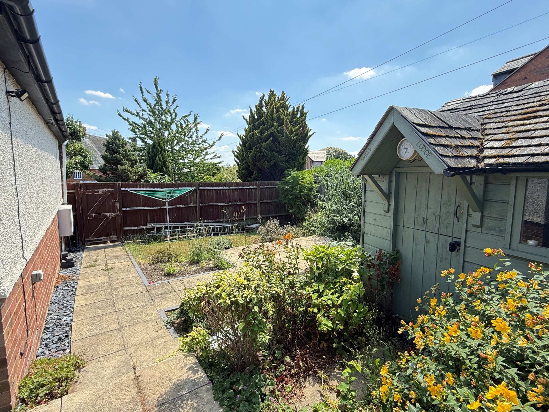Enclosed by fencing. Patio. Side gate. Summerhouse. Mature borders. Path to rear. Lawn to sides. Rear hardstanding. Outbuilding. Allotment.