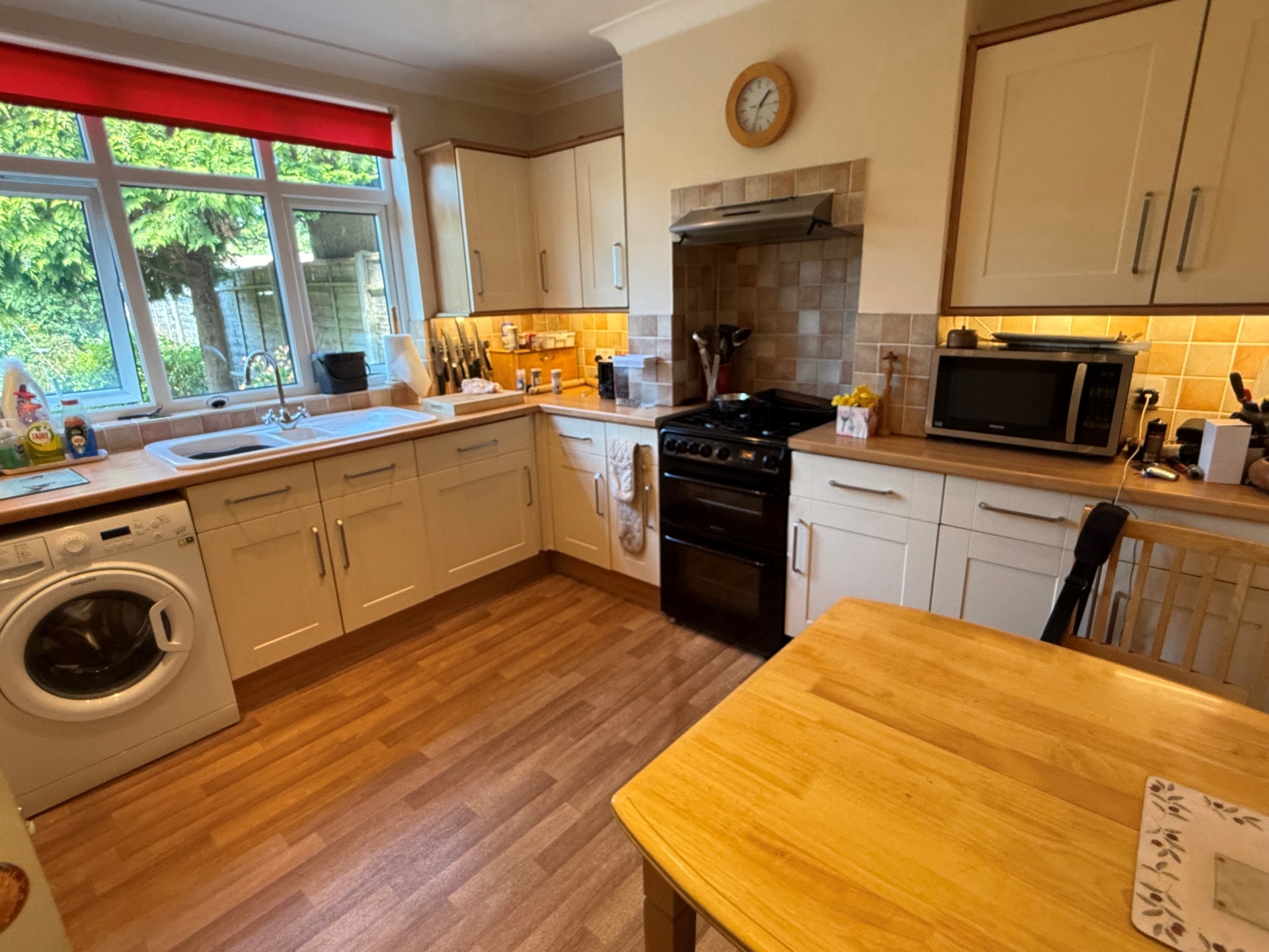uPVC double glazed window to rear elevation. Wall and base units. Ceramic one and a half bowl sink. Integrated fridge/freezer and dishwasher. Space for cooker and washing machine. Splash back tiling. Wood effect flooring.