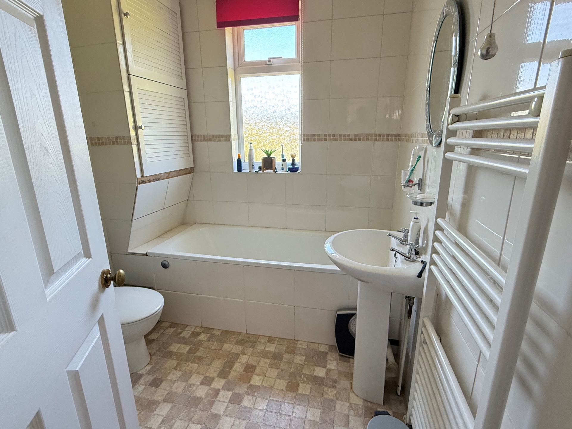 Obscure uPVC double glazed window to rear elevation. Heated towel rail. Suite comprising bath, pedestal wash hand basin, WC and corner shower cubicle. Fully tiled. Cupboard housing Ideal boiler.