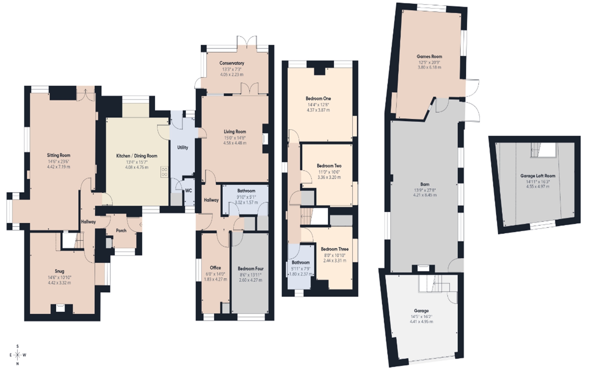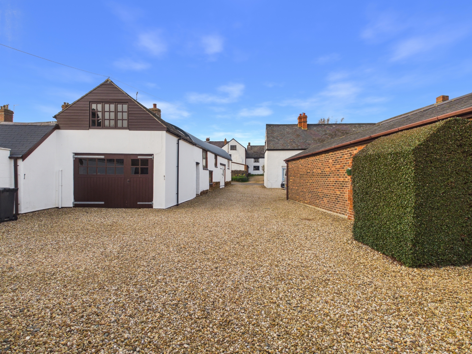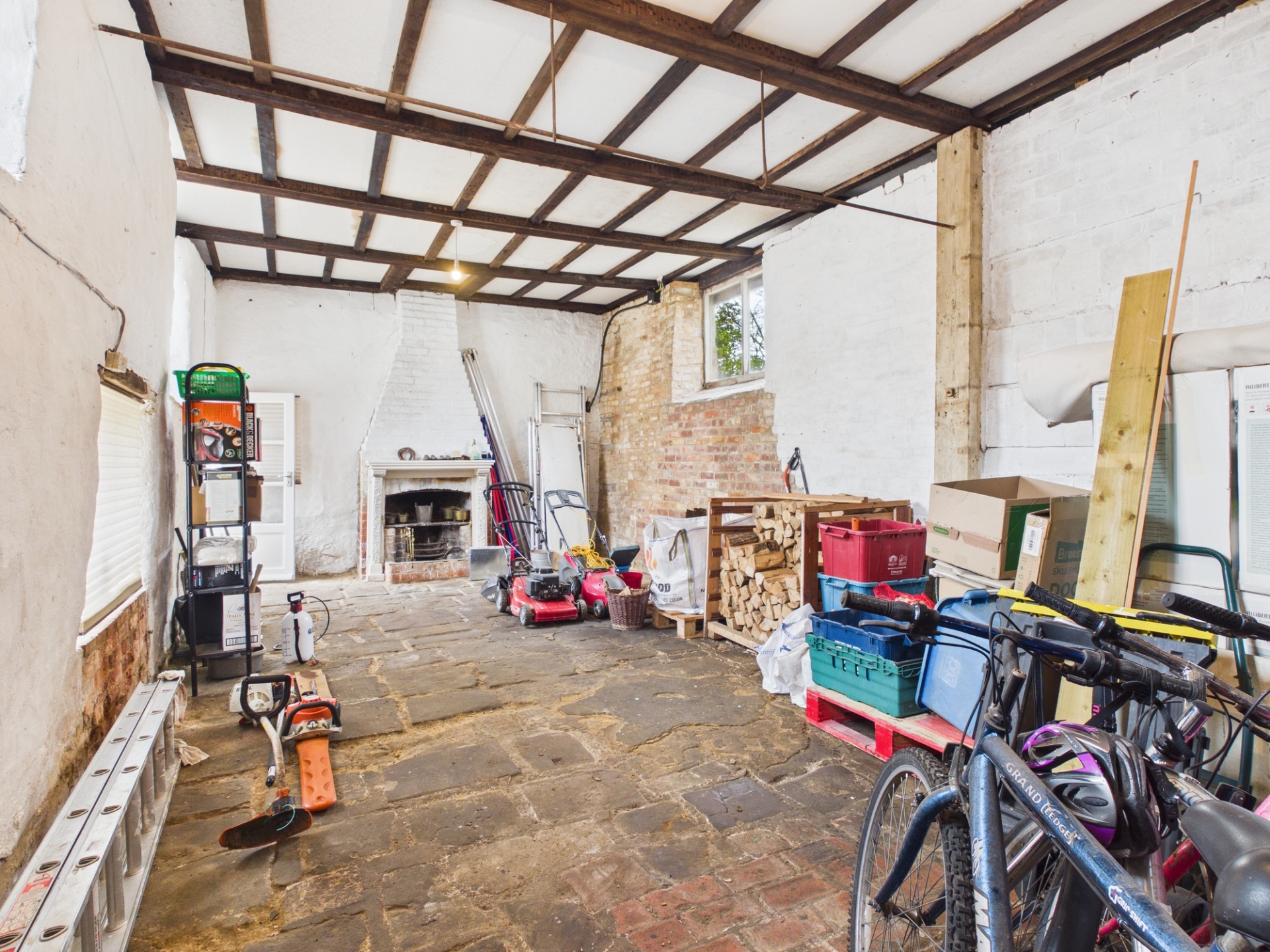Outside, to the front, a gravel driveway provides parking and turning space for several vehicles. The barn is divided into two large rooms with double doors opening onto the driveway, and there is also a garage with a storage room above. A brick built store provides additional storage.