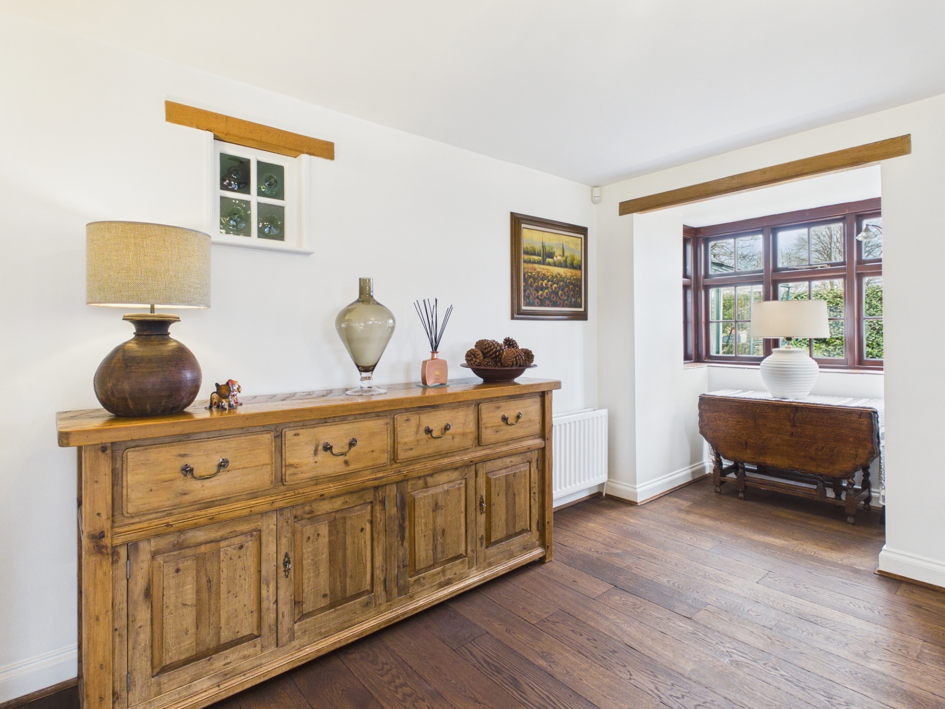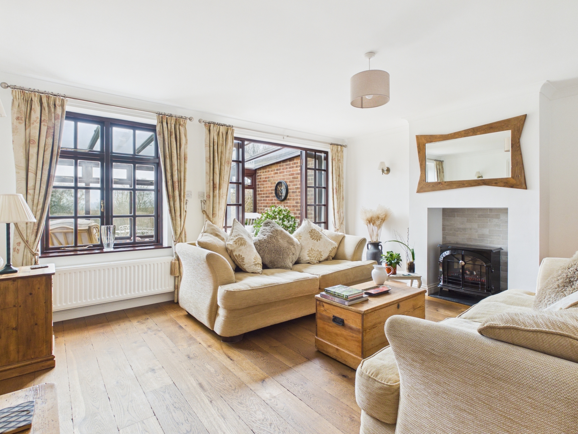 The property is entered via a welcoming entrance hall with space for furniture and a coat cupboard, leading to an inner hall with stairs rising to the first floor. The sitting room features a log burner and French doors opening onto the garden. There is also a cosy snug, also with a log burner, built-in cabinets and shelving.