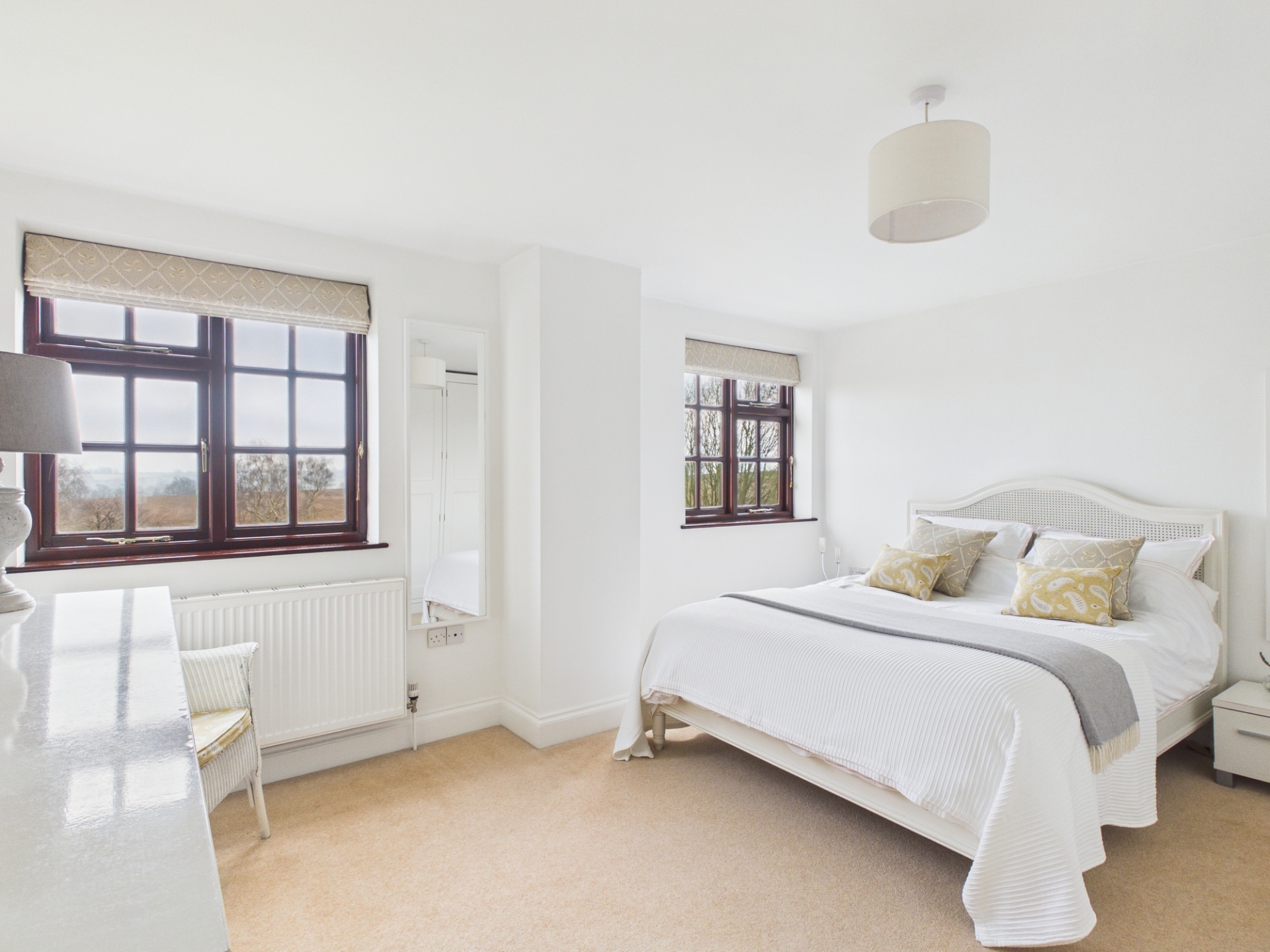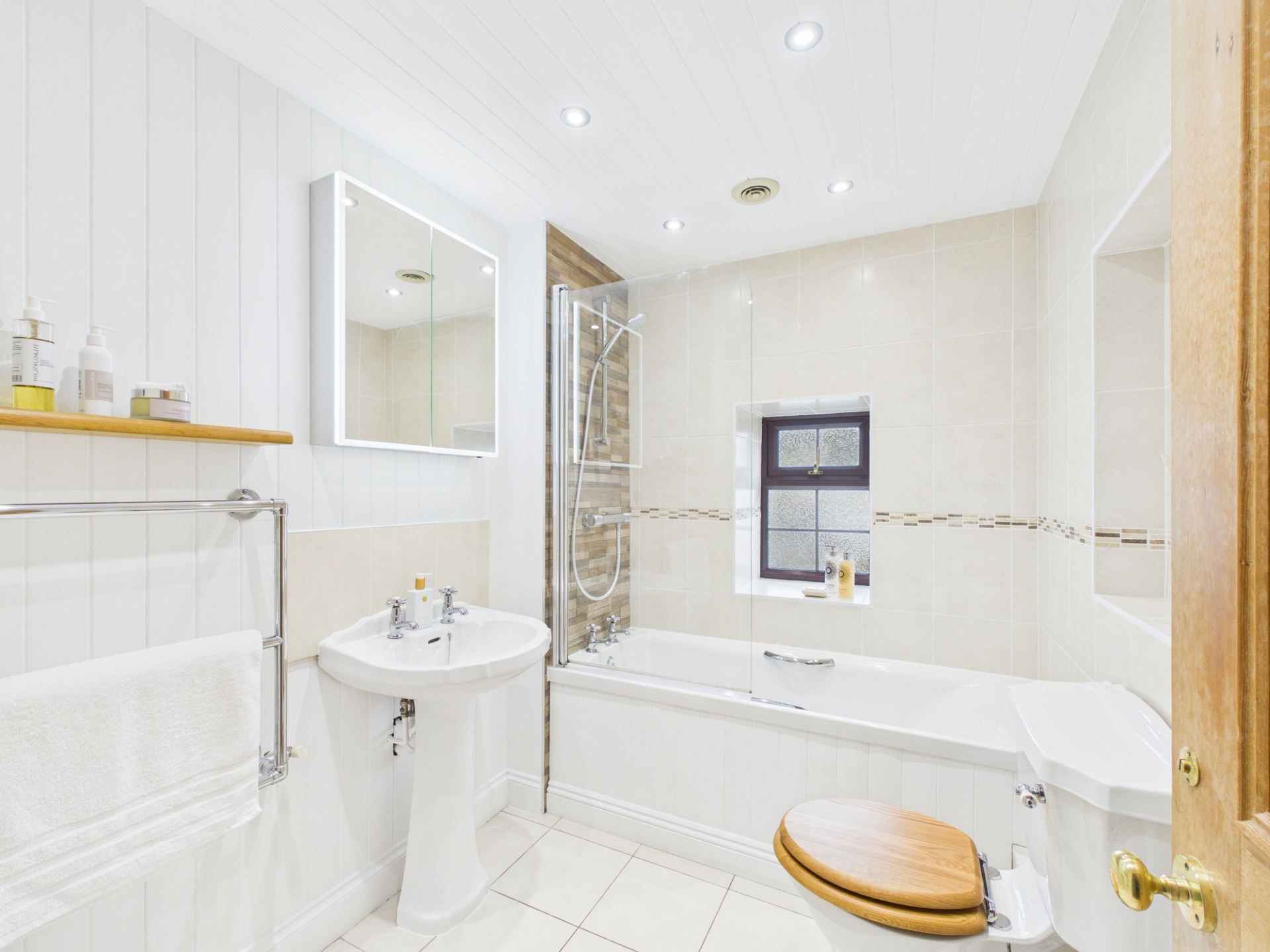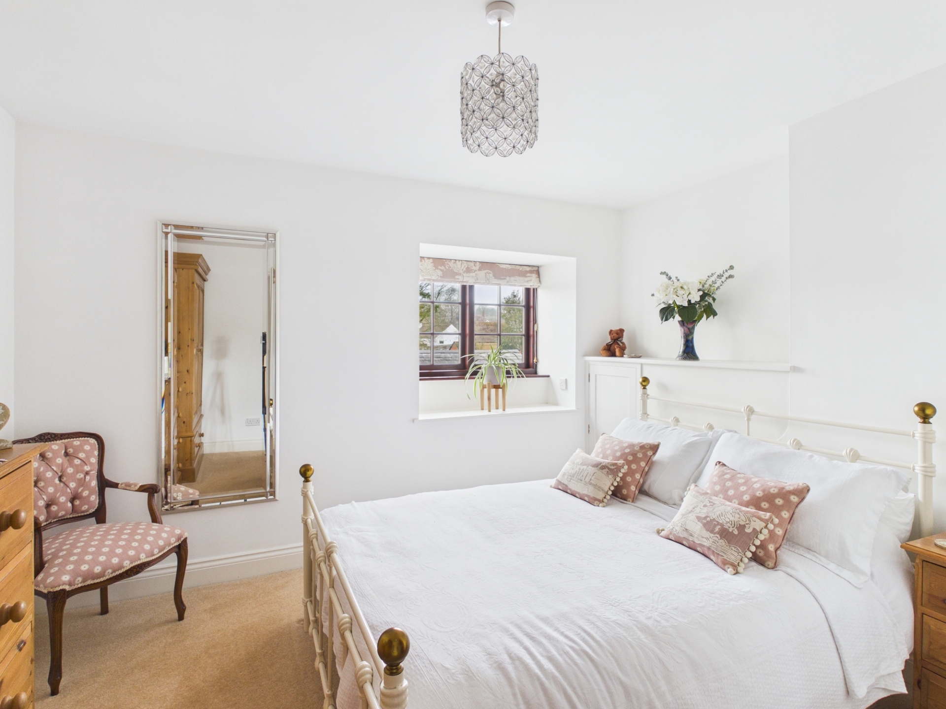 On the first floor of the main house, the principal bedroom has built in wardrobes and enjoys stunning views across the garden and surrounding countryside. Bedroom two is a double, while bedroom three is also a comfortable double with built in wardrobe and cupboards. There is also the main family bathroom.