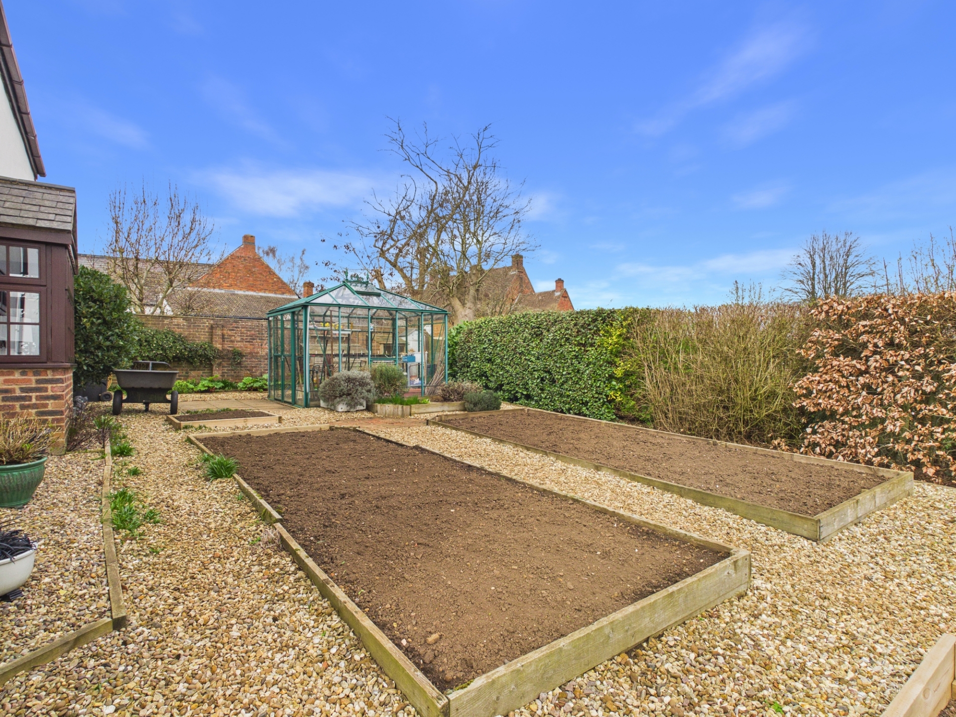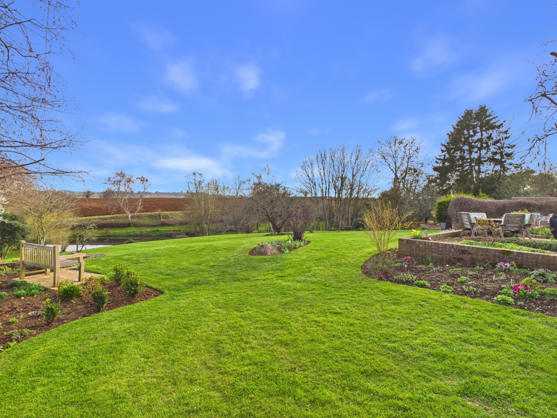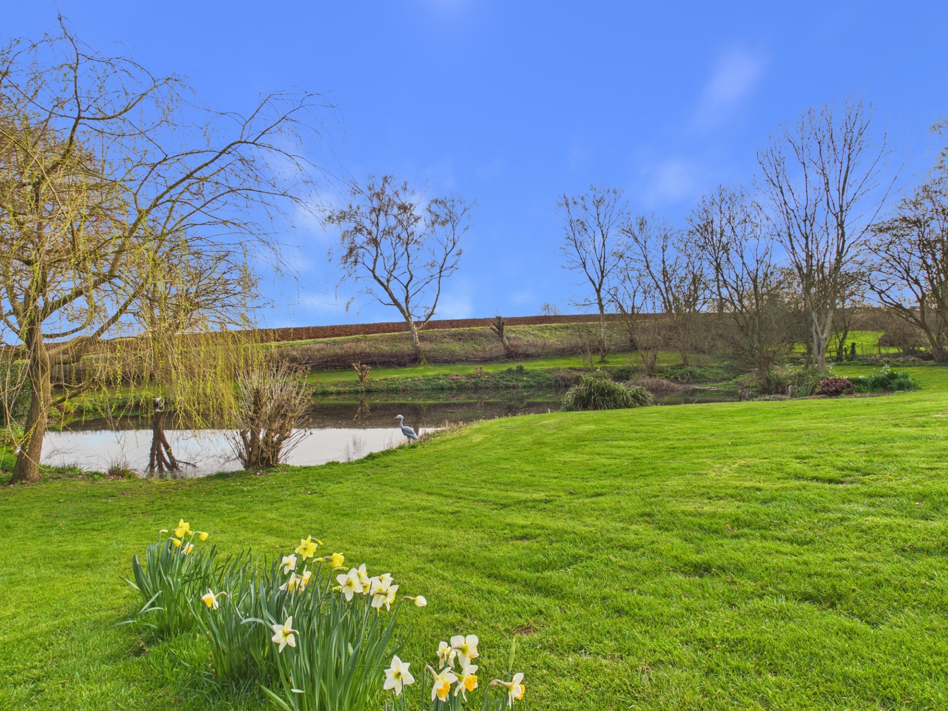 To the rear, a paved terrace overlooks the garden, pond and countryside beyond, with further seating areas positioned to enjoy the sun from dawn until dusk. The lawn is bordered and interspersed with established trees, and to the side of the property there is a vegetable garden and greenhouse.