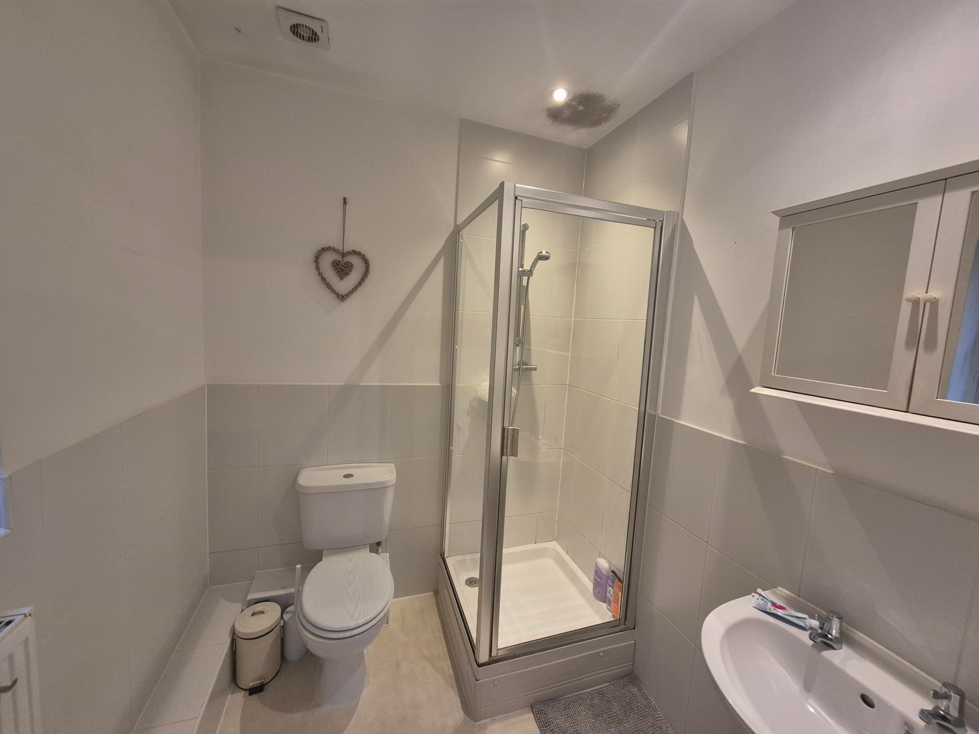 Obscure uPVC double glazed window to side elevation. Radiator. Extractor fan. Shower. Wash hand basin. WC.
