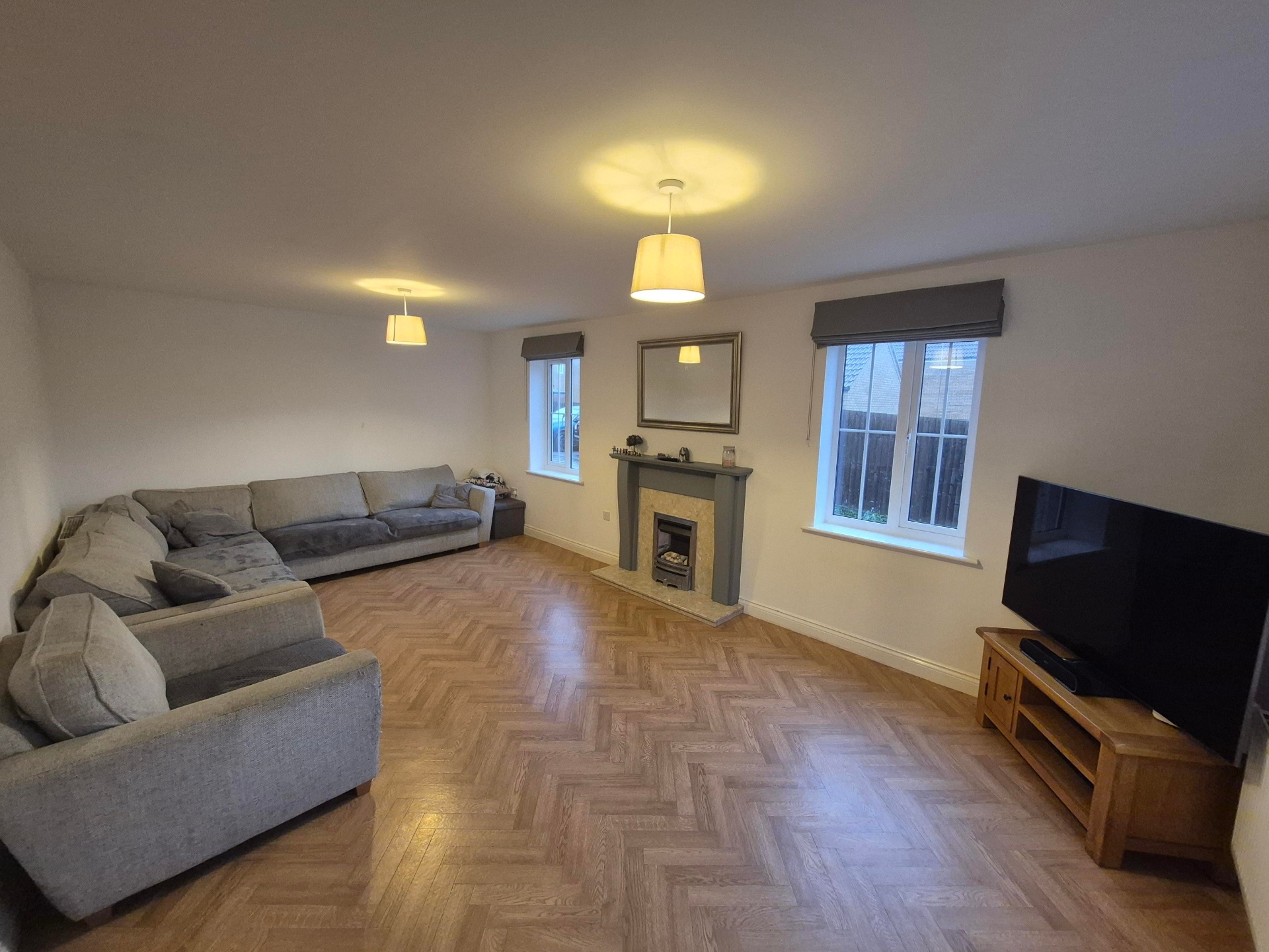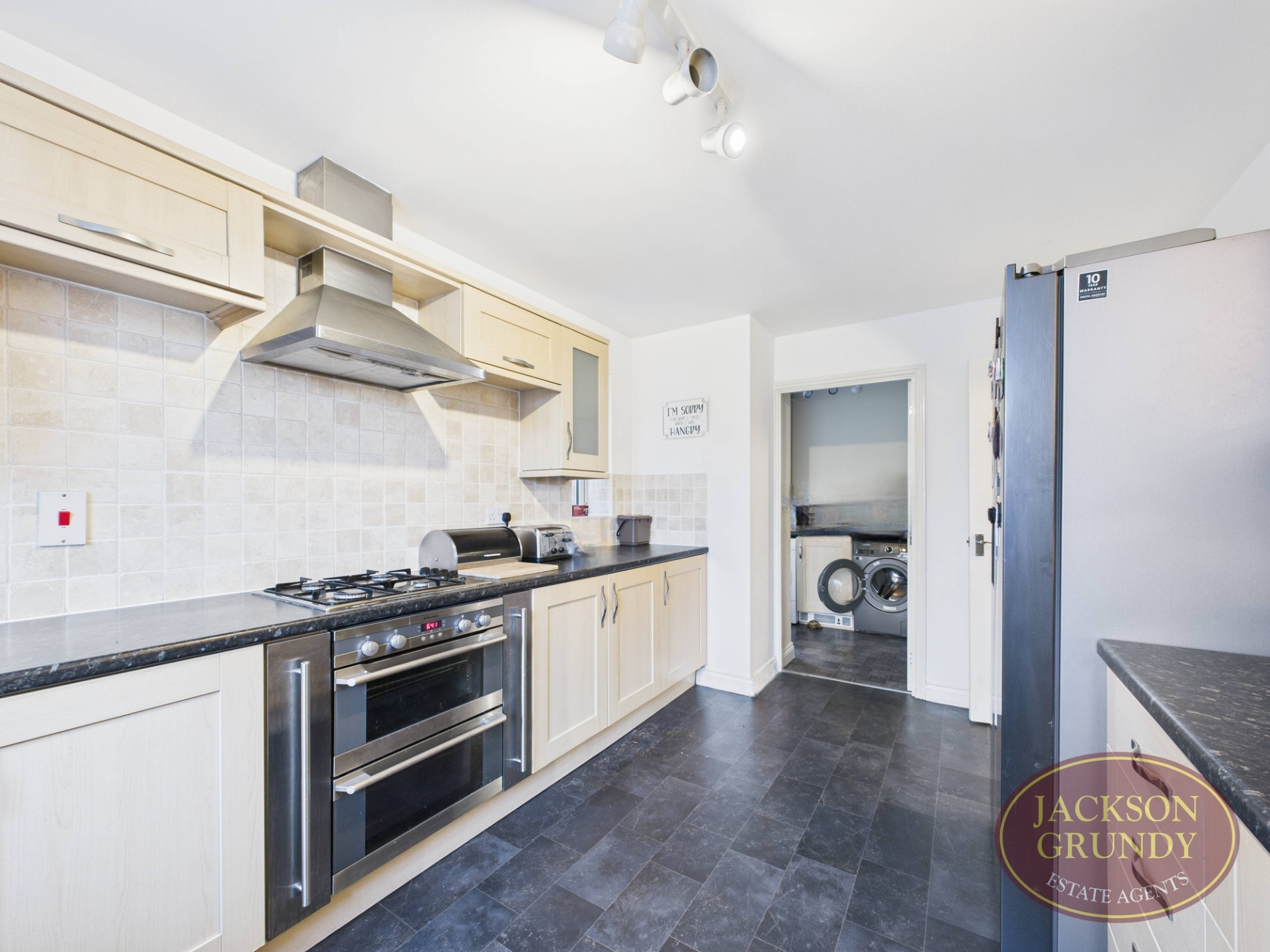 uPVC double glazed windows to rear and side elevations. Wall mounted and base level units. Access to utility room. Plumbing for dishwater. Sink with mixer tap over. Four ring gas hob burner. Electric oven.