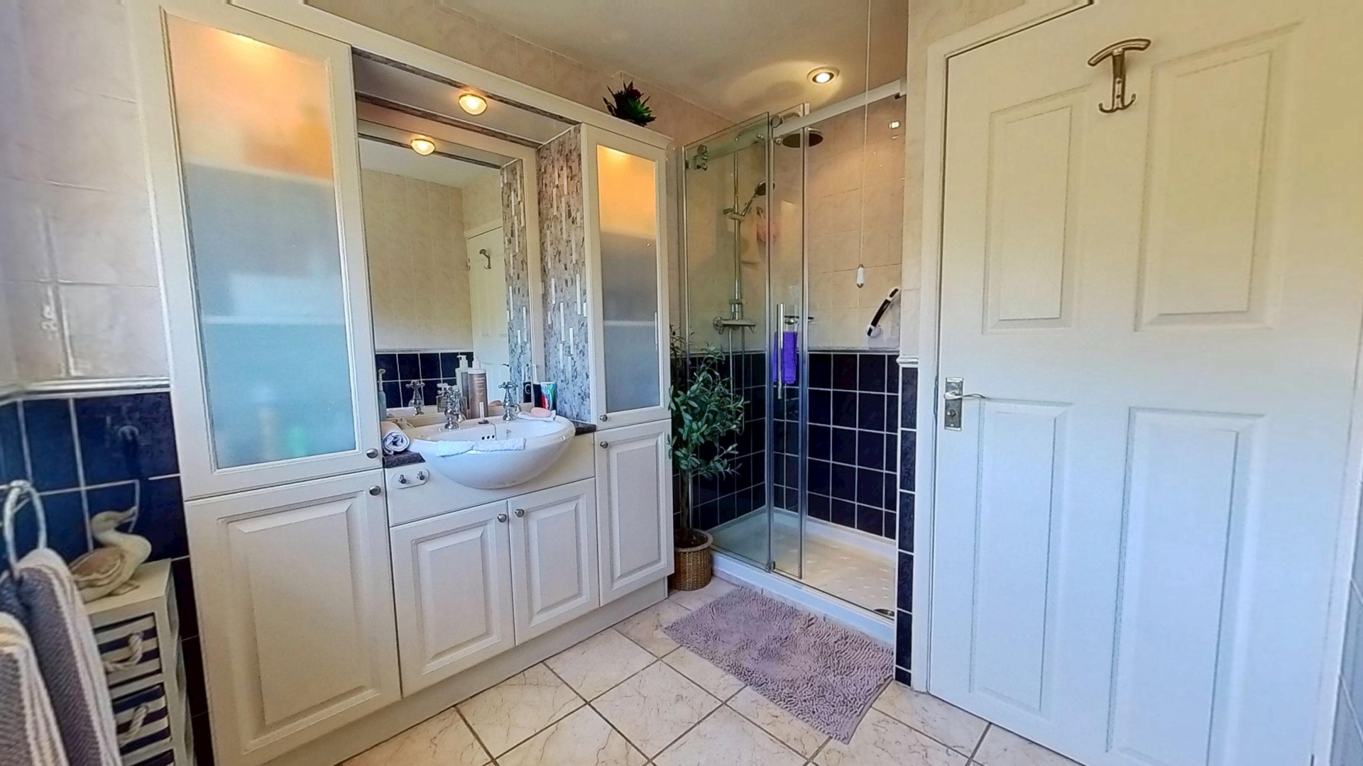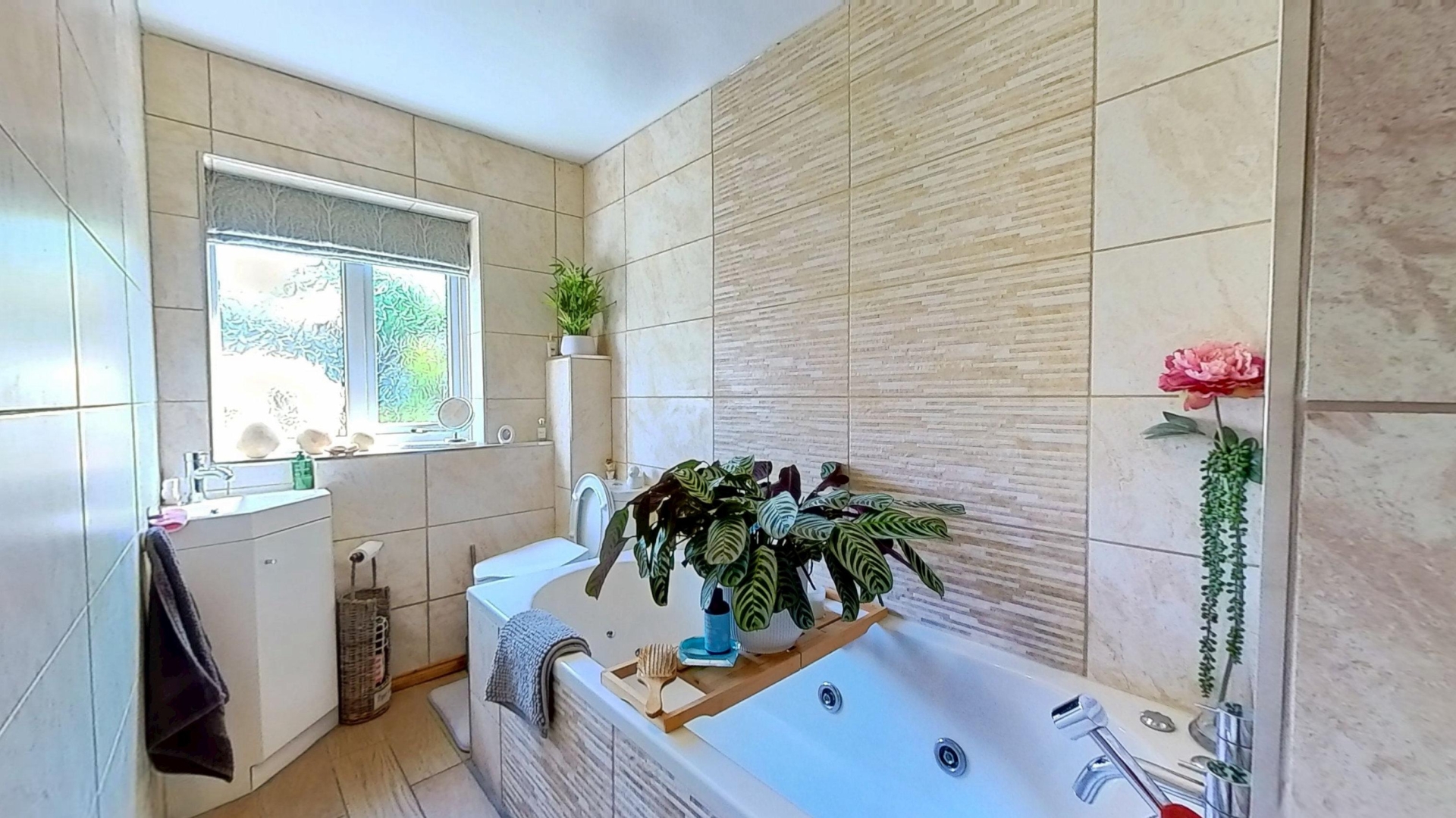 Frosted uPVC double glazed window to rear elevation. Suite comprising low level WC, wash hand basin with cupboard under and Jacuzzi bath with mixer tap and shower. Tiled floor to ceiling. Under floor heating.