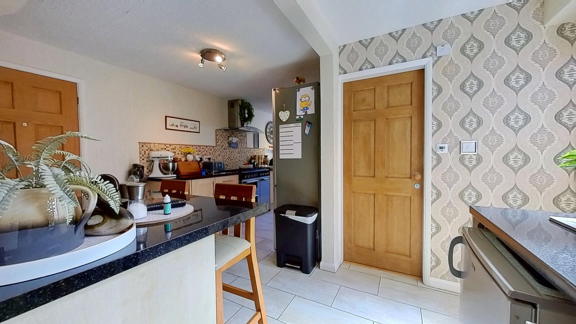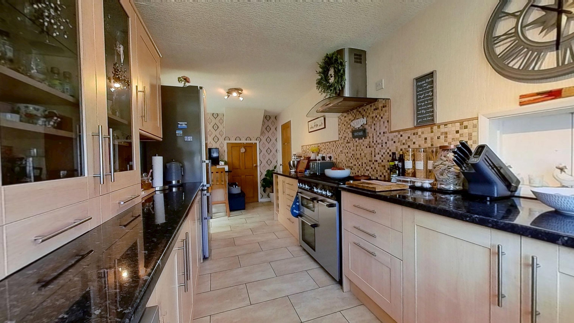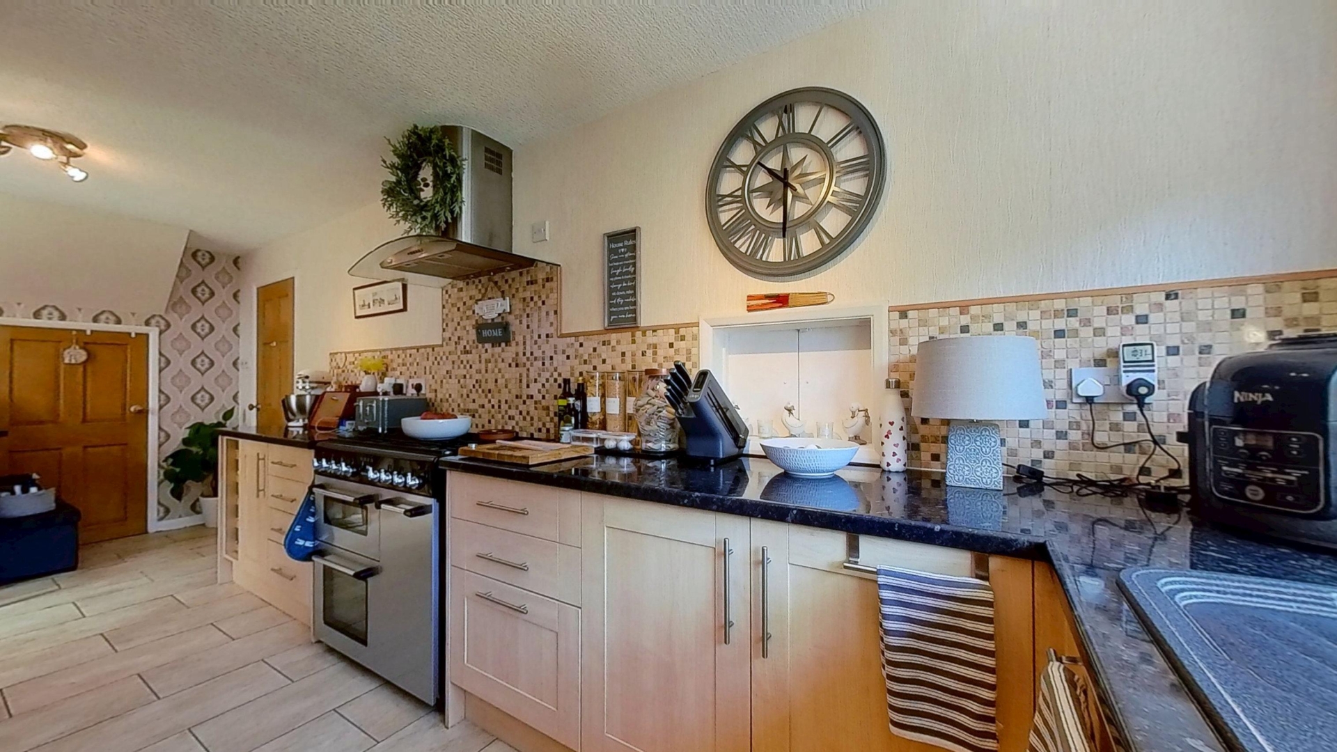 uPVC double glazed window to rear elevation. Wall and base units. Roll top work surfaces. Composite sink and drainer. Smeg Range style cooker with extractor over. Space for white goods. Tiled floor. Tiling to splash back areas. Understairs storage. Frosted uPVC door and window to side elevation. Thermostat for underfloor heating in bathroom.