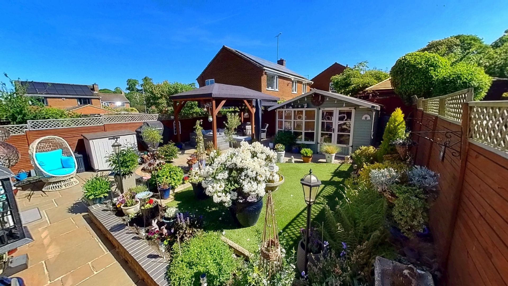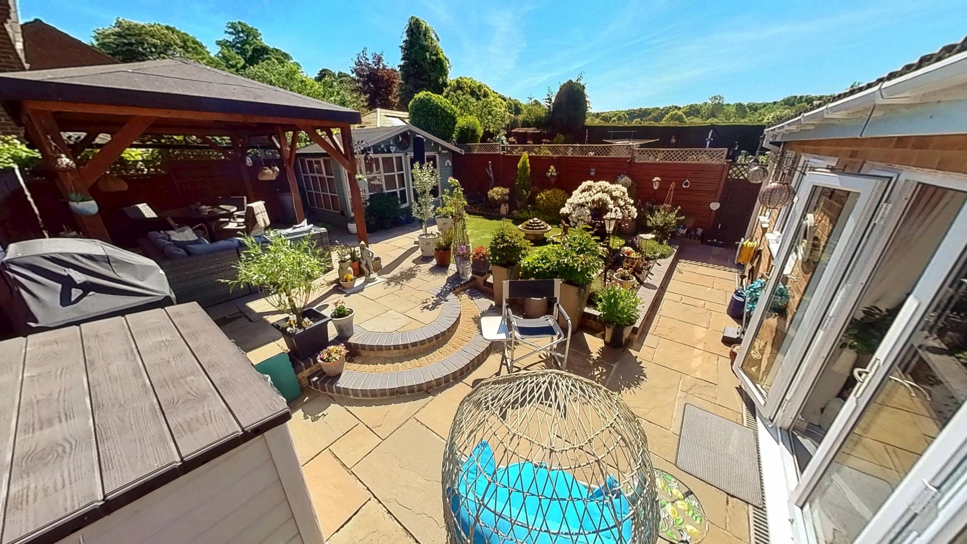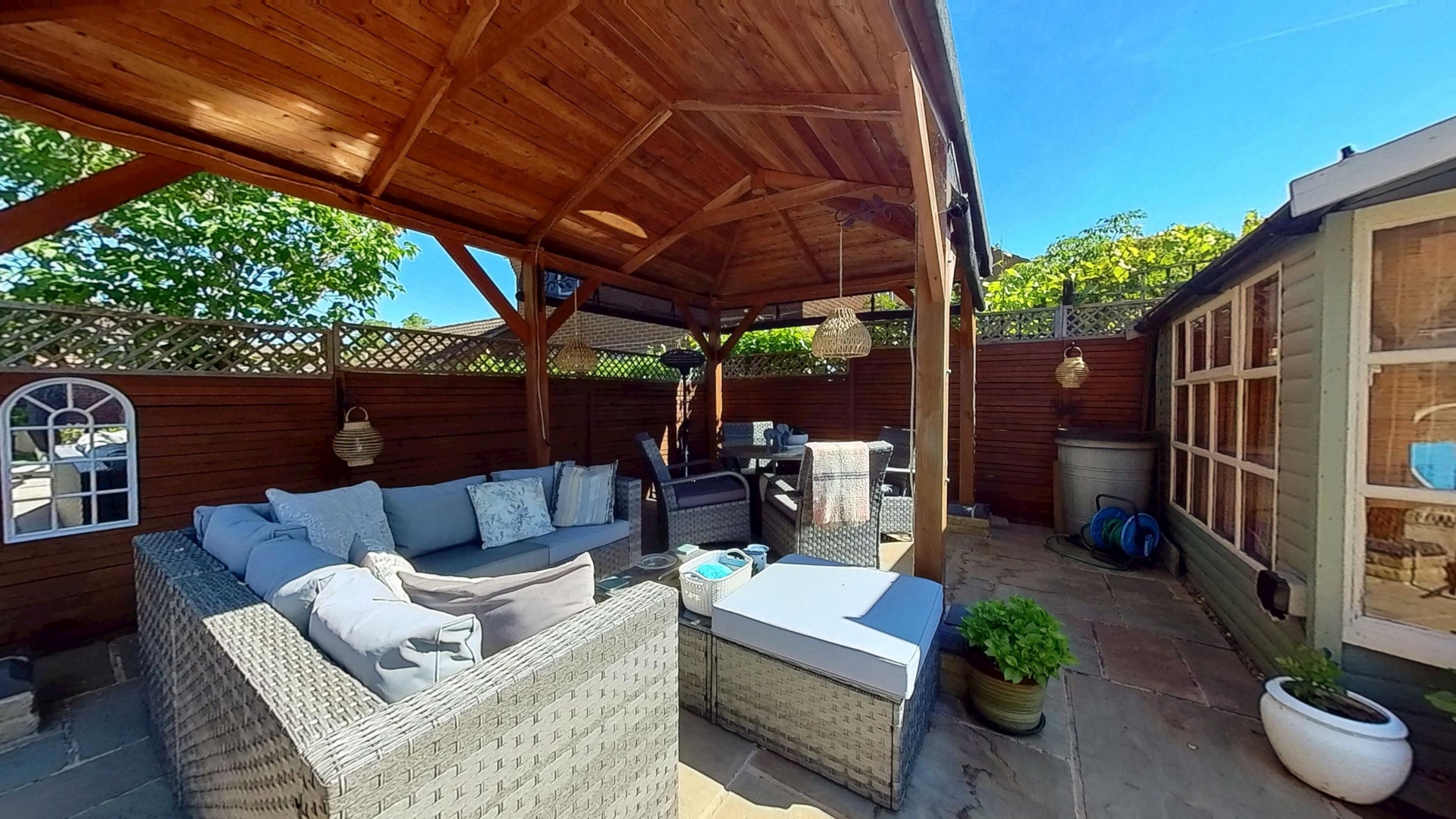 Patio area with covered pergola and summerhouse. Artificial lawn. Raised flower beds. Security light. Water tap.