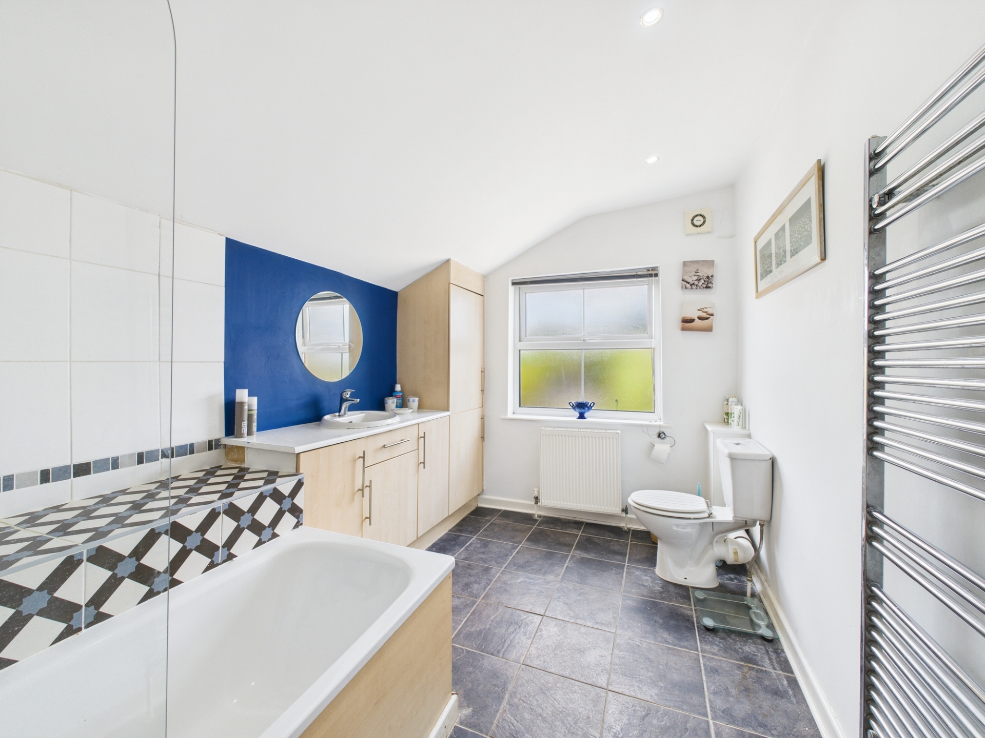 Obscure UPVC double glazed window to rear elevation. Fitted suite of low level WC, wash hand basin with fitted vanity unit, panelled bath with shower over. Radiator. Heated towel rail. Tiled floor.
