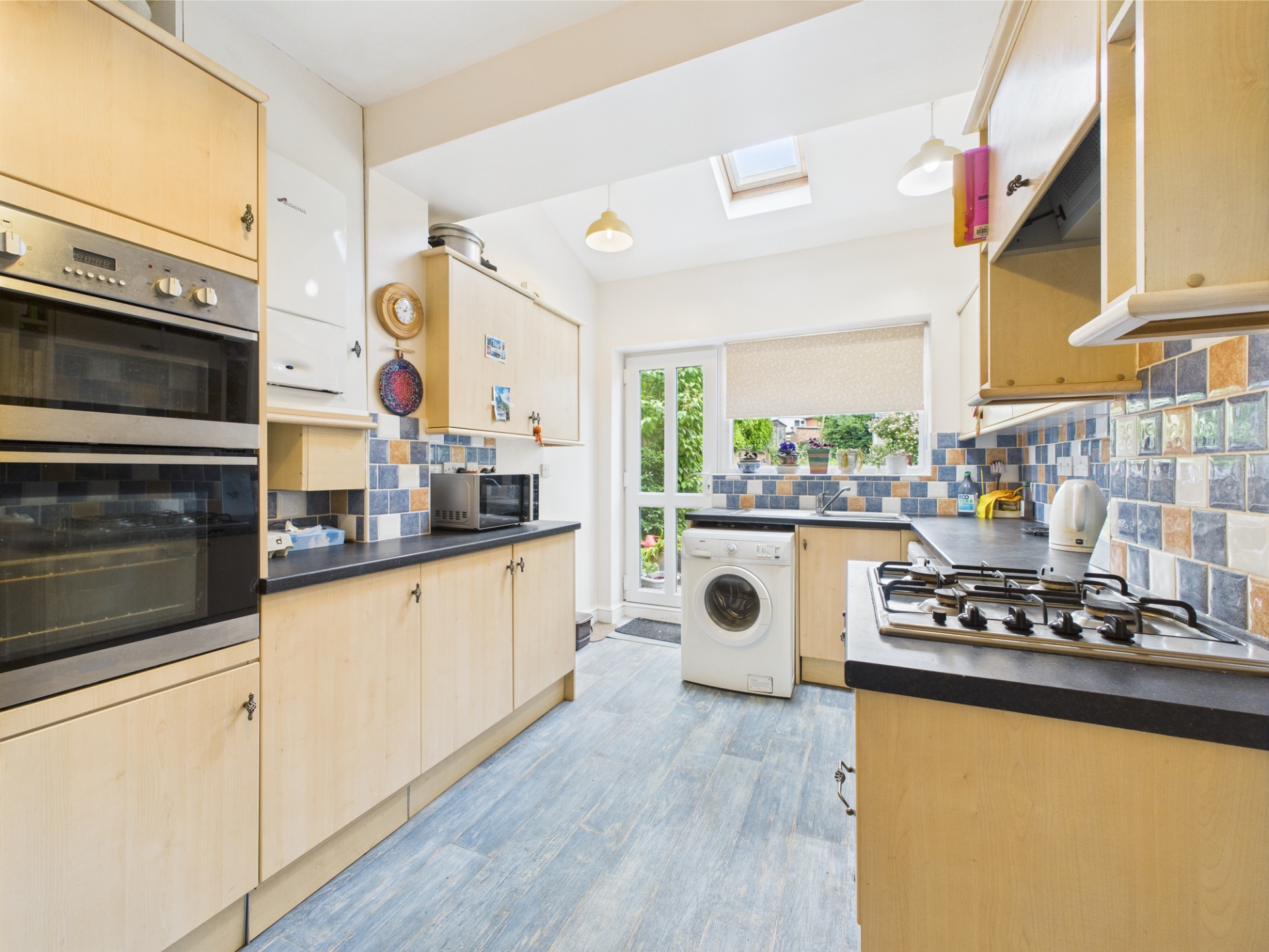 uPVC double glazed window to rear elevation. uPVC glazed door to rear garden. Velux window to ceiling. Range of wall mounted and base level units with work surface over. Integrated appliances to include oven, gas hob and extractor. Space for white goods. Stainless sink and drainer. Worcester gas combination boiler. Extractor fan.