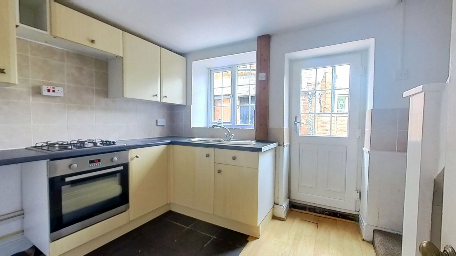 Window and door to rear elevation. Radiator. Fitted with a range of wall, base and drawer units with work surfaces over. Built in oven and hob. Stainless steel sink unit. Tiled splash backs. Stairs rising to first floor landing.