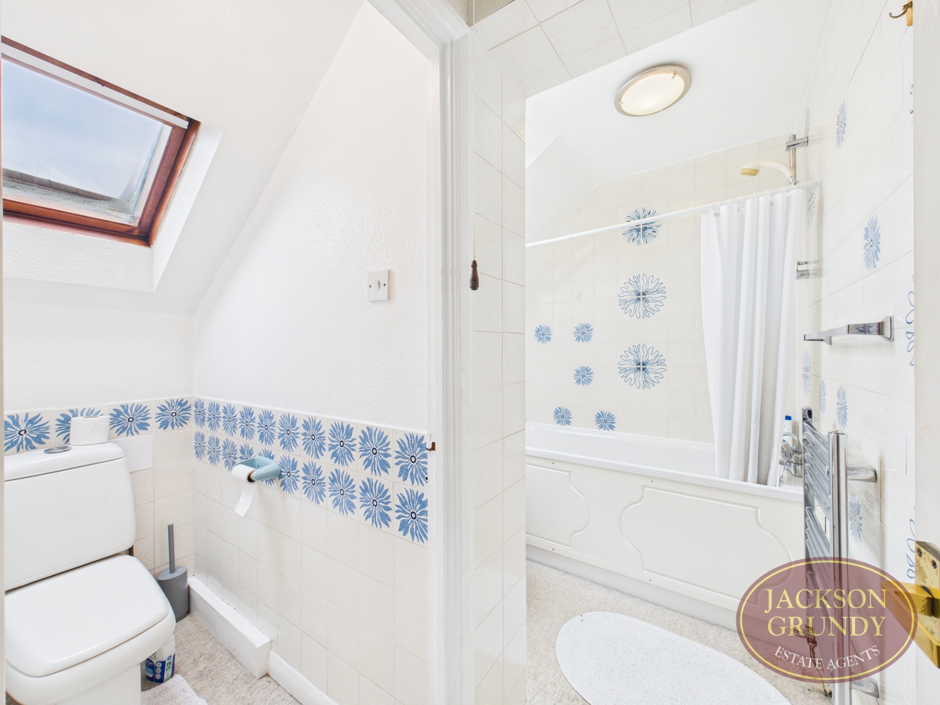 Two Velux windows. Low level WC. Full height tiling. Vinyl floor. Heated towel rail. Bath with shower over. Full height tiling. Pedestal wash hand basin.