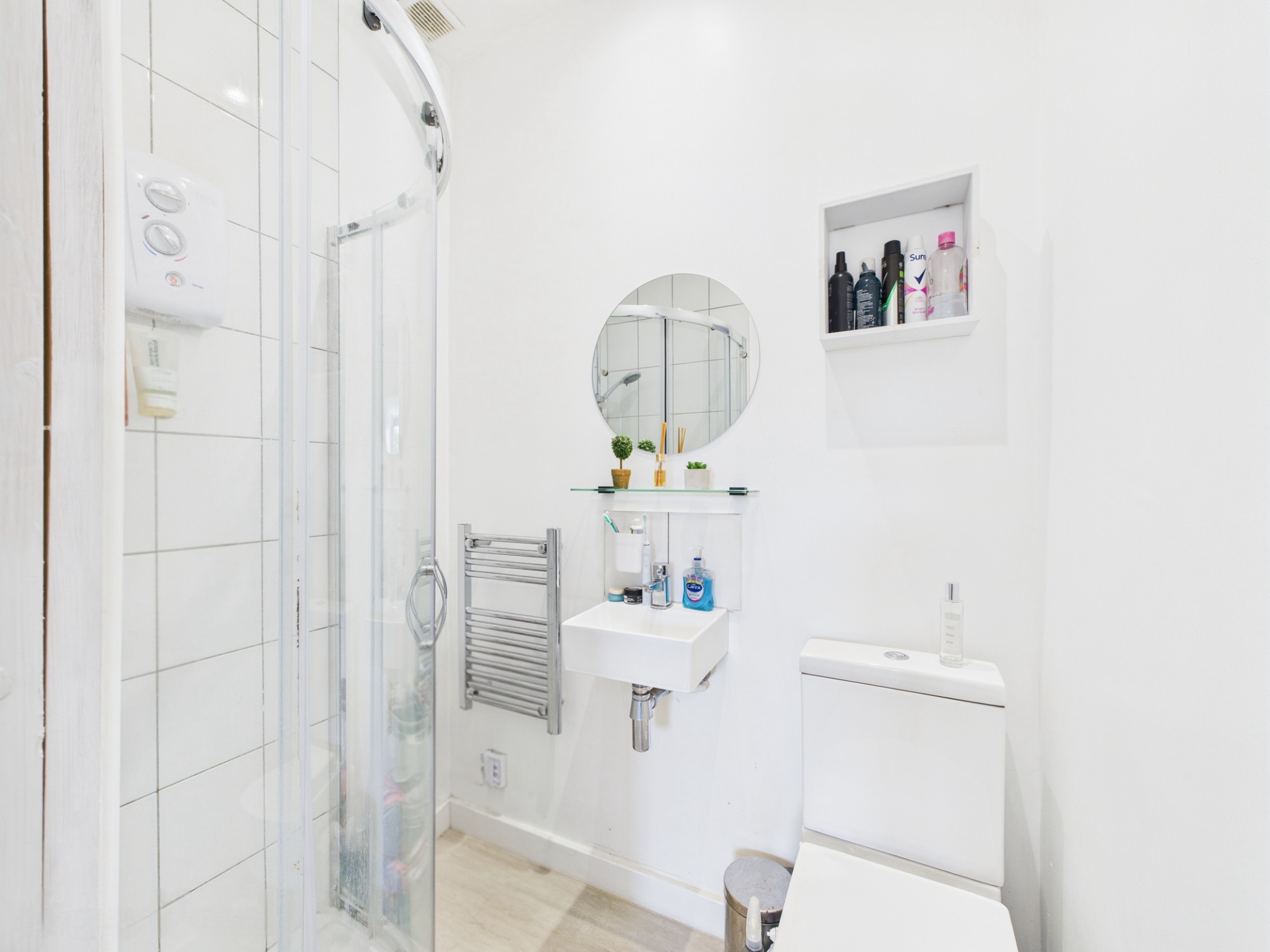 Obscure window to side elevation. Radiator. Suite comprising shower cubicle, large bath and pedestal wash hand basin. Cupboard. Access to loft.