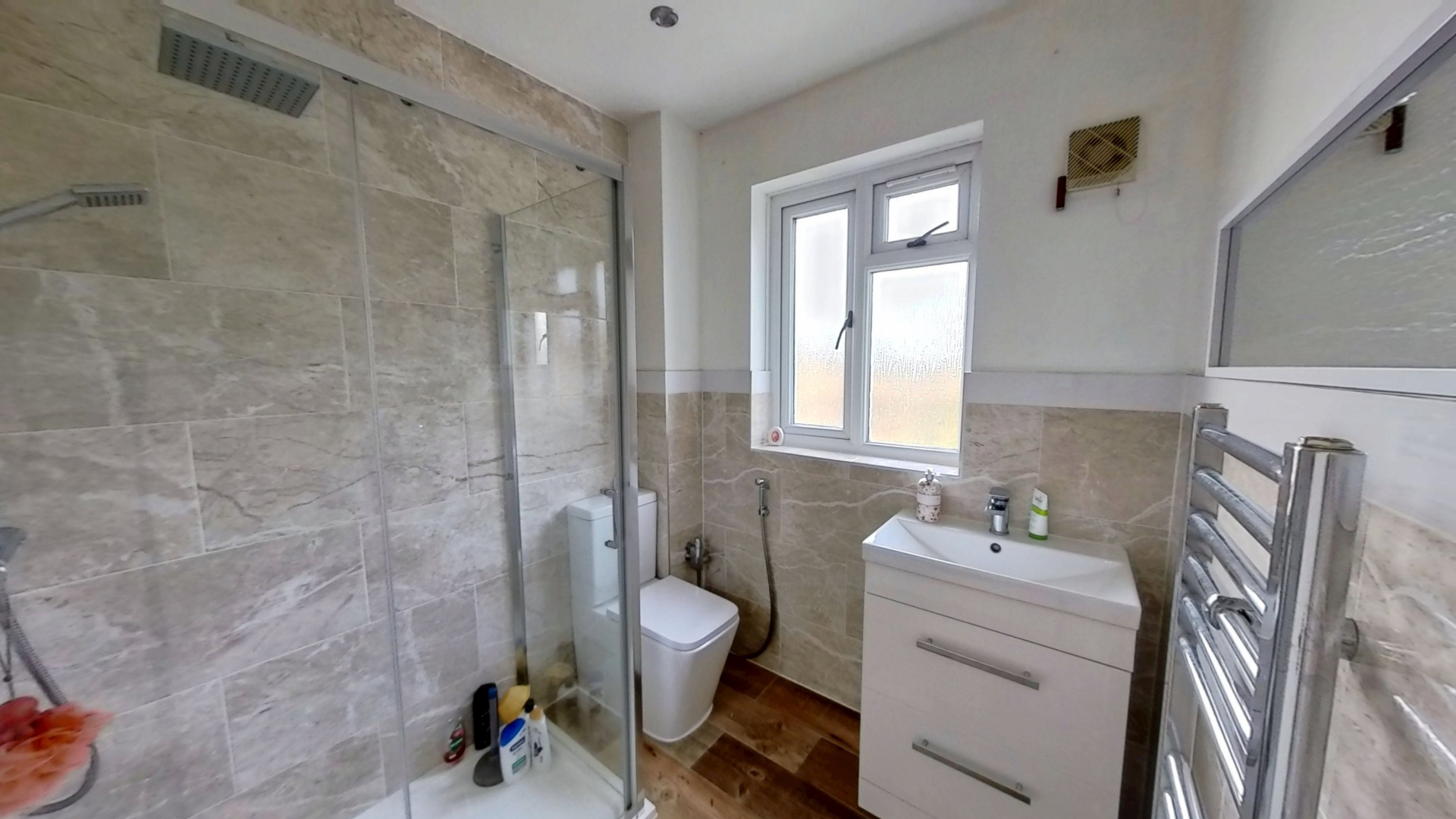Obscured uPVC double glazed window ot rear elevation. Double shower cubicle fully tiled. Half tiled walls. Wash hand basin in vanity unit. Low level flush WC. Heated chrome towel rail.