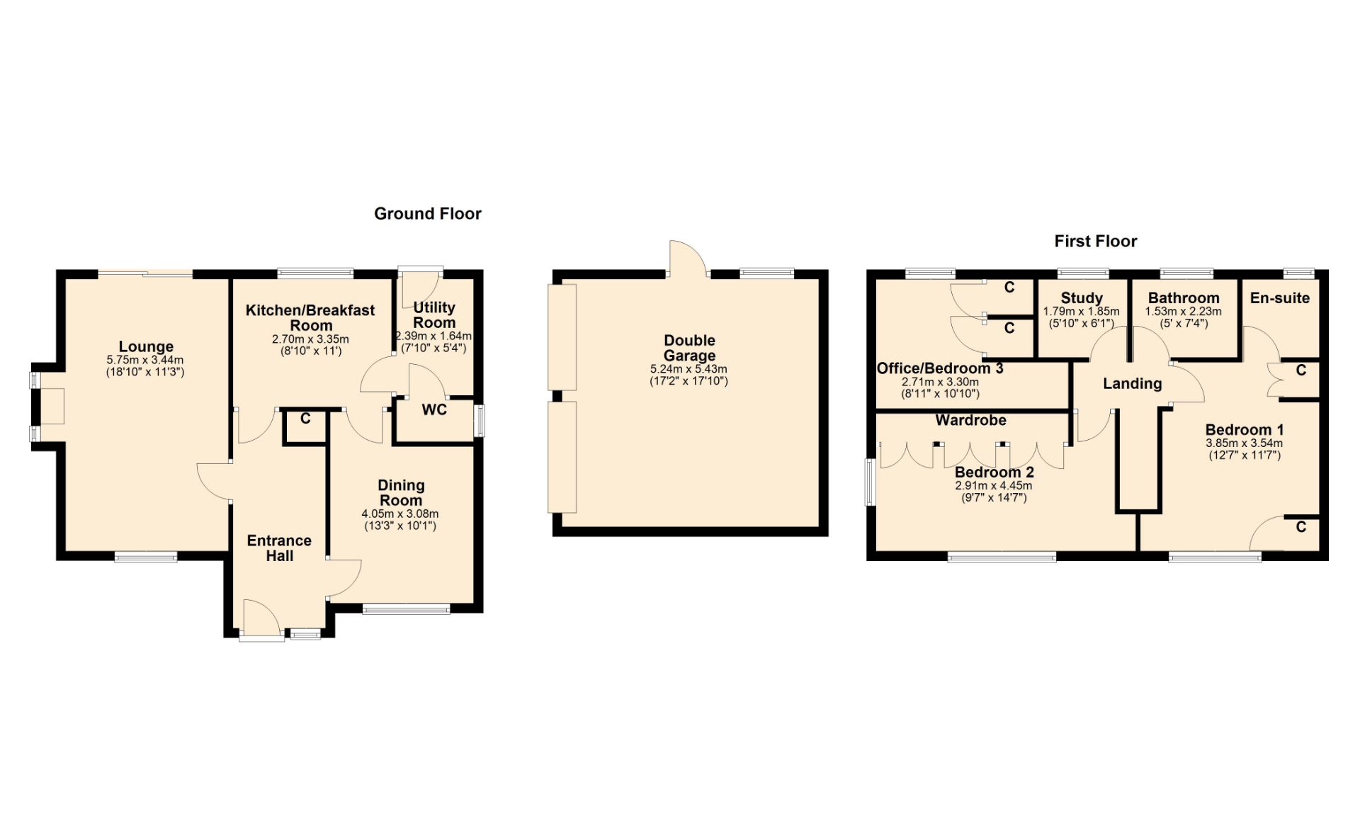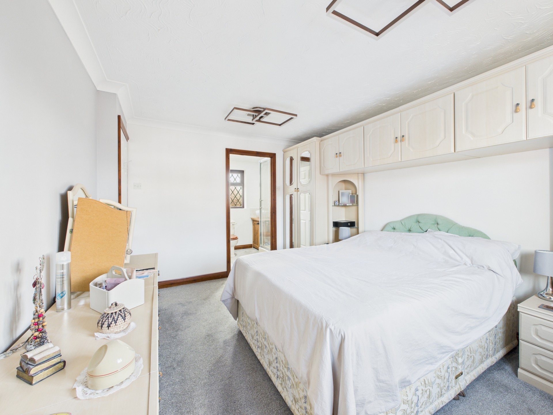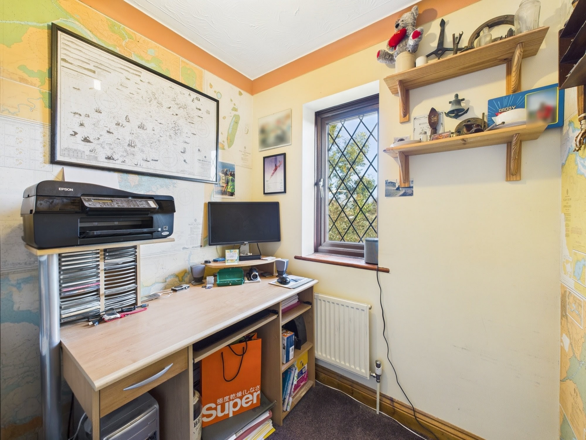 Upstairs, the carpeted landing leads to three well proportioned bedrooms, each benefitting from built-in wardrobes. The main bedroom further enjoys the luxury of an en-suite shower room. The family bathroom is fitted with a panelled bath with shower mixer tap, a low level WC and a pedestal wash basin. A study, positioned to the rear of the property, provides an ideal space for home working or quiet reading. Additional valuable storage can be found in the partly boarded loft, accessed via a pull down ladder and equipped with lighting and power. Externally, the property continues to impress. A double garage with power and lighting connected and generous driveway offering ample off road parking. The private rear garden provides a delightful outdoor retreat, featuring a combination of patio and decking areas perfect for outdoor dining, along with a well kept lawn and mature planting that together create a peaceful and attractive setting.