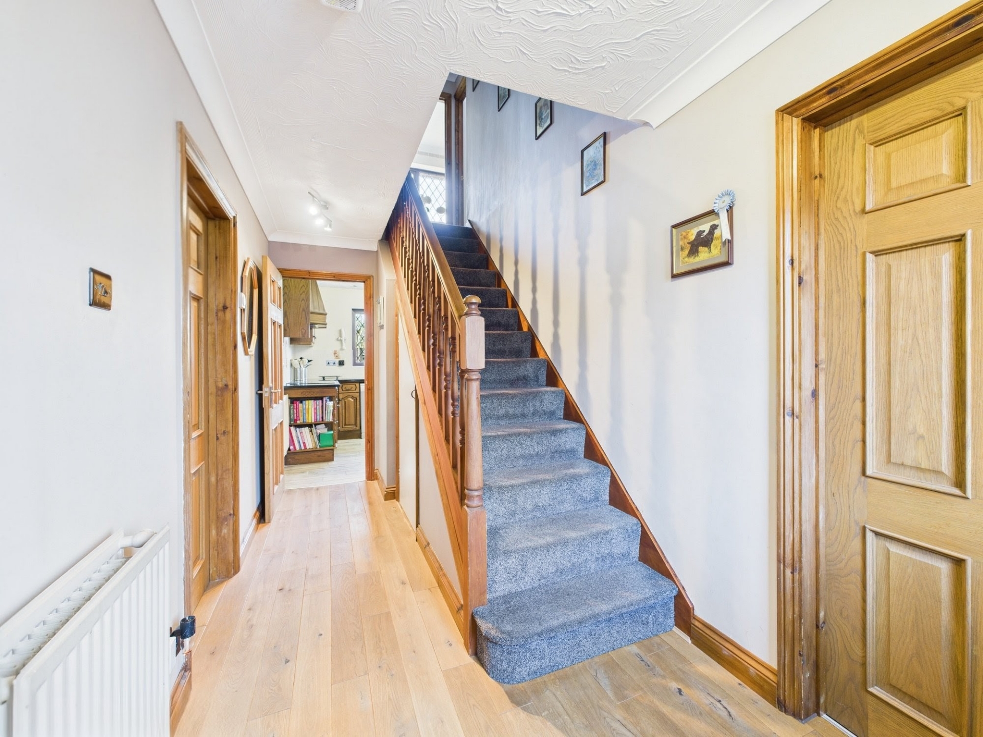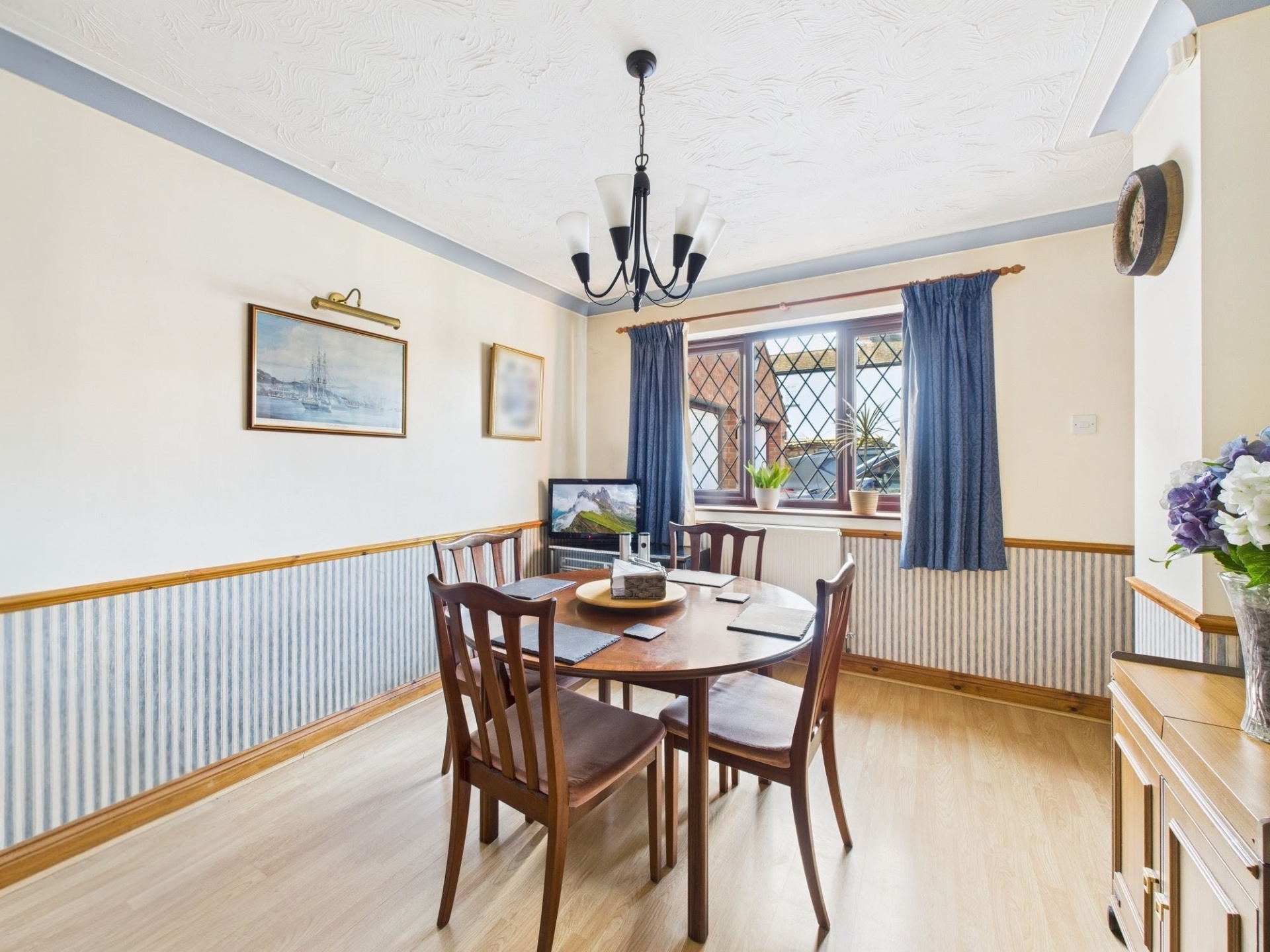 Beautifully maintained and well presented throughout, this spacious home offers versatile accommodation, excellent storage solutions and double glazing throughout. From the moment you enter, the inviting entrance hall creates a warm first impression, enhanced by solid wood flooring that flows seamlessly through the ground floor living spaces. The bright and generously sized sitting room features a charming inglenook fireplace as its focal point, with sliding doors opening directly onto the rear garden, ideal for both relaxing and entertaining. To the opposite side of the entrance hall is the formal dining room, which provides a lovely setting for family meals and gatherings. This room leads effortlessly into the well appointed kitchen, fitted with an excellent range of wall and base units, modern work surfaces, and enjoying pleasant views over the rear garden. A generous utility room offers additional work and storage space, while a convenient cloakroom completes the ground floor layout.