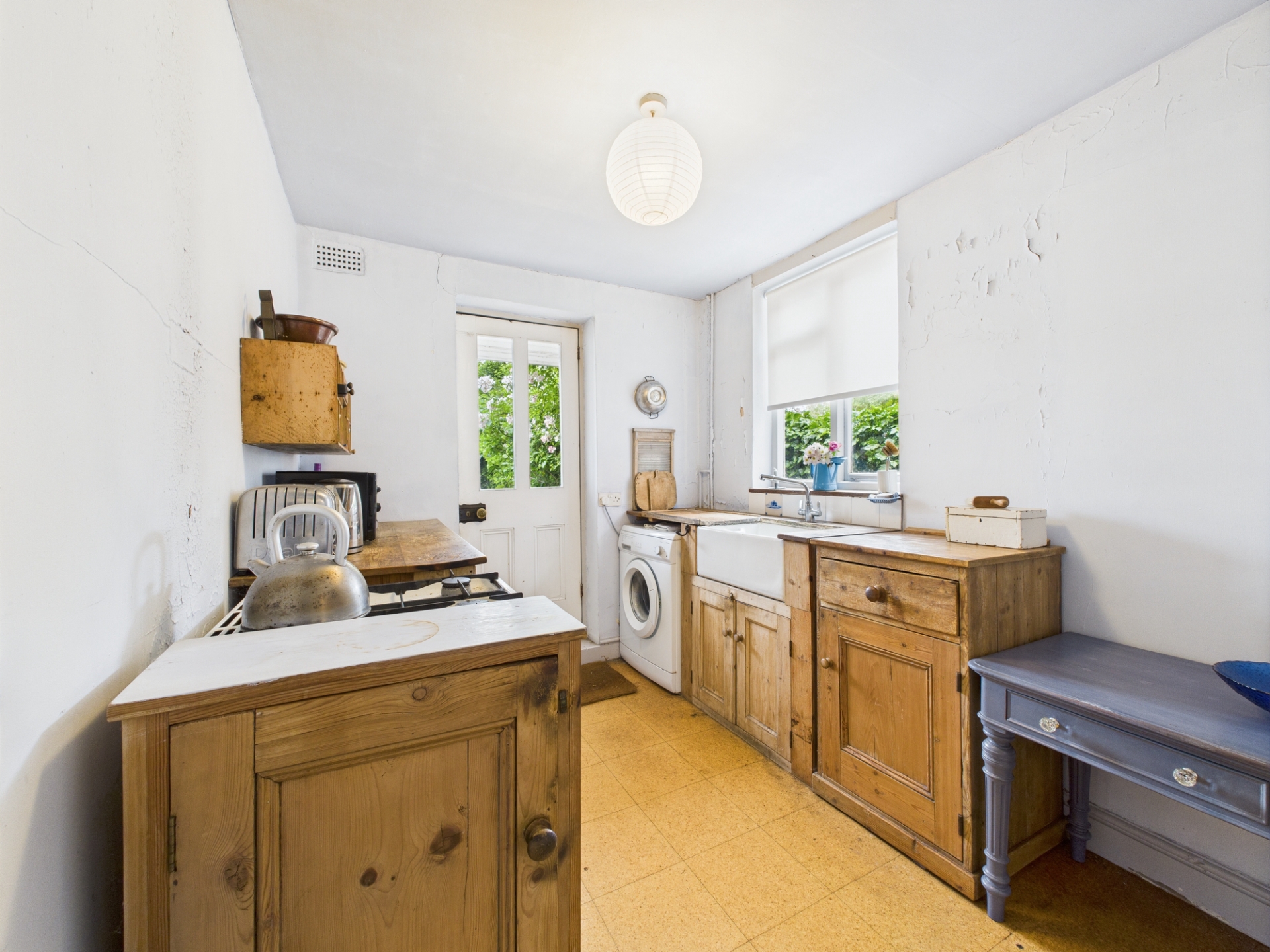 Wooden door to rear elevation, leading to garden. Base units. Sink. Vinyl flooring. Door to cellar.