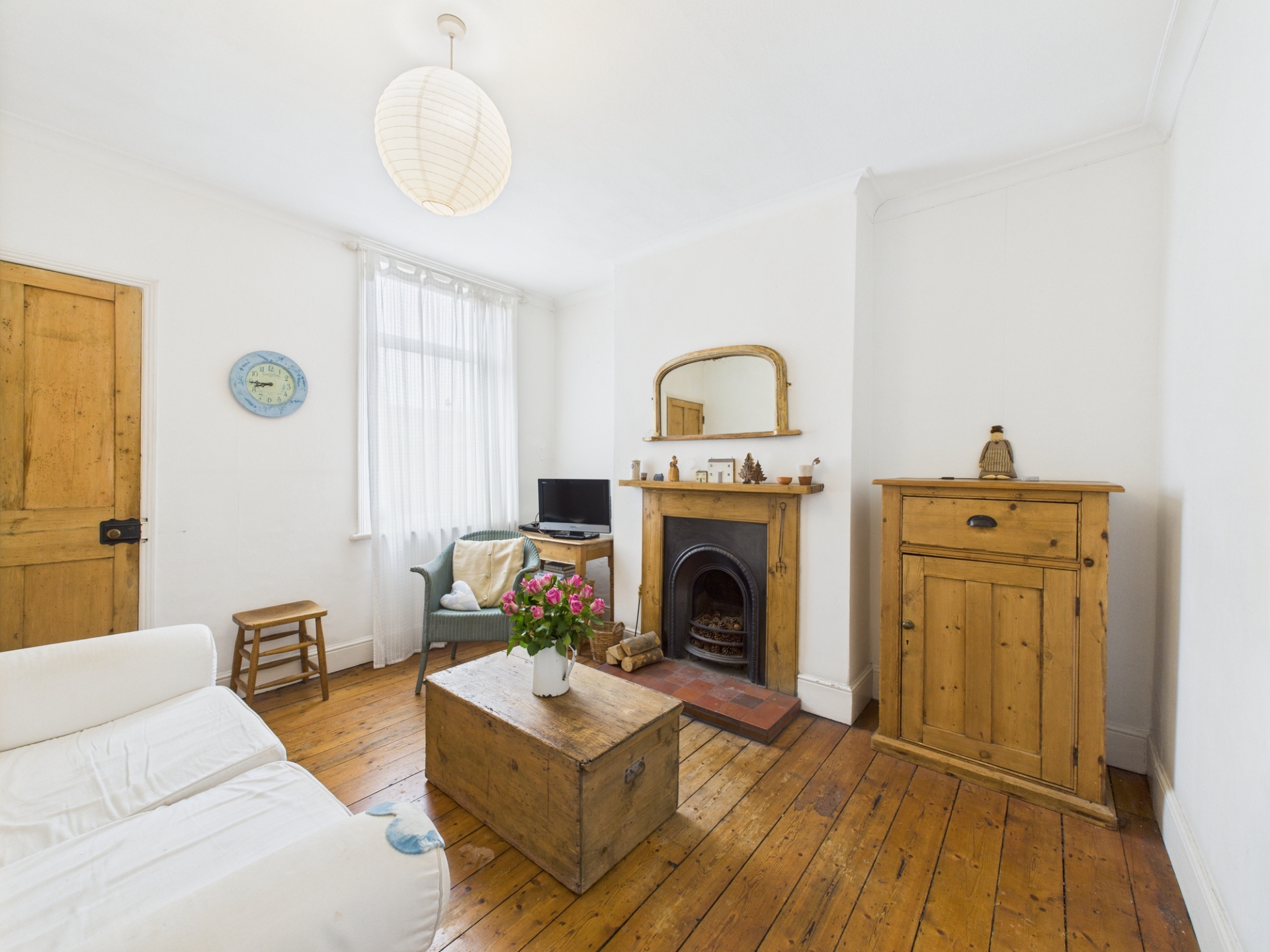 Wooden framed single glazed window to front elevation. Decorative framed open fireplace. Original floorboards.