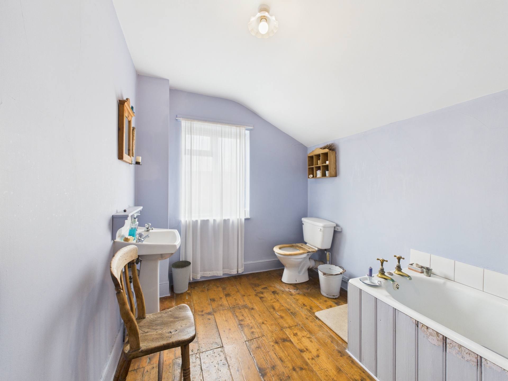 Wooden framed single glazed window to rear elevation. Original floorboards. Three piece suite comprising bath, low level WC and pedestal sink. Airing cupboard.