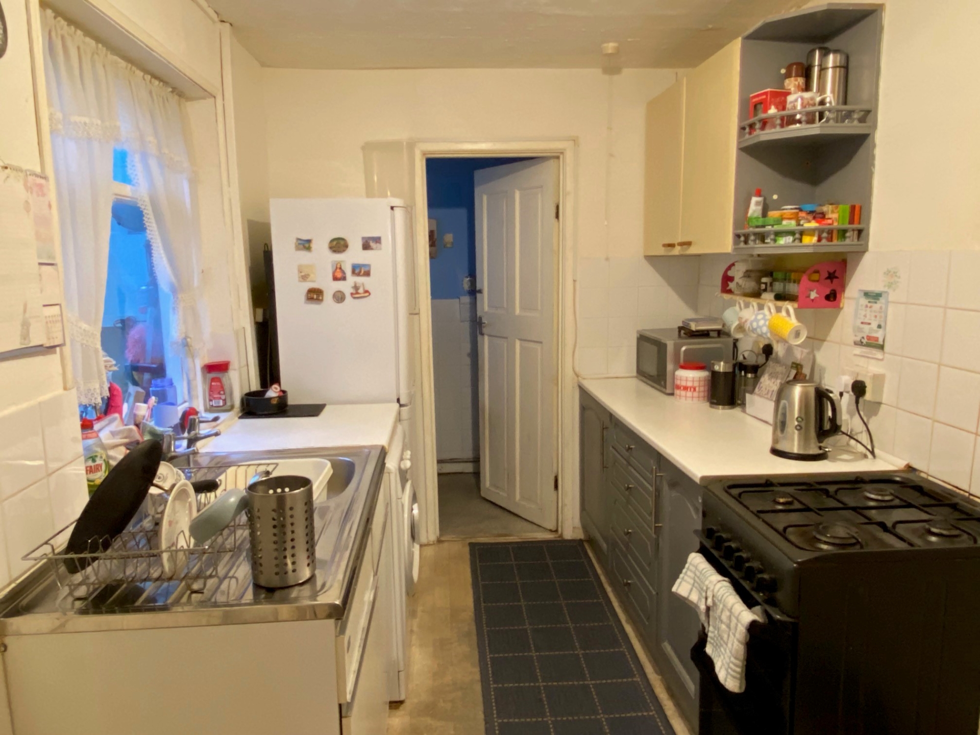 Door and window to side elevation. Door to cellar. Single drainer stainless steel sink unit with cupboard under. Space for appliance. Door to lean to providing undercover storage and door to garden.