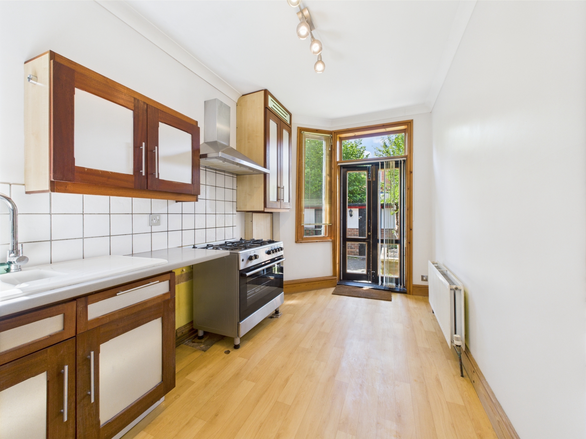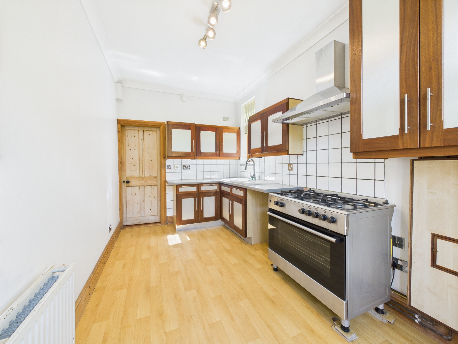 Two uPVC double glazed window to side elevation. Radiator. Wall mounted and base units with work surface over. Double doors to garden. Porcelain sink.