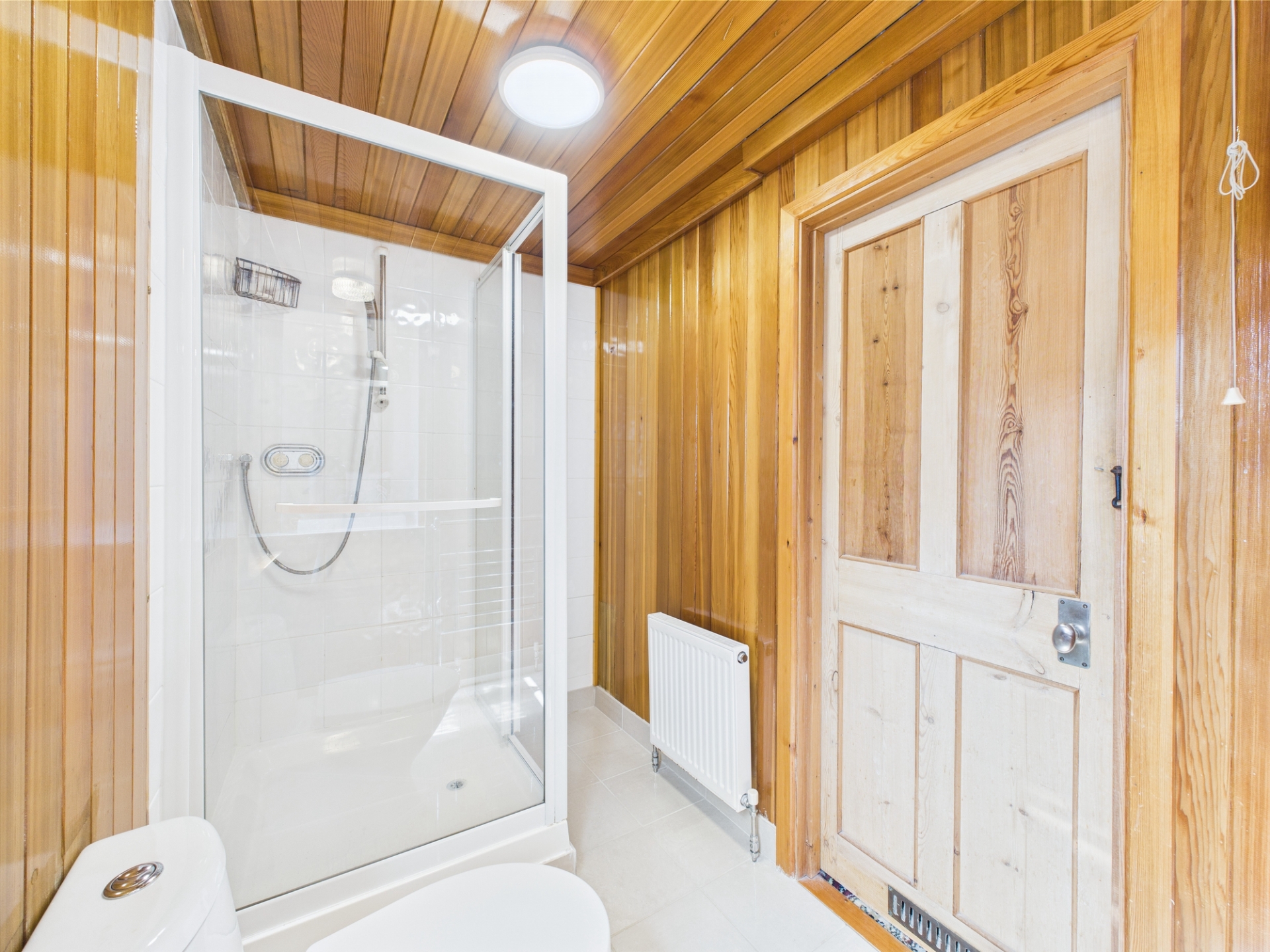 uPVC double glazed window to side elevation. Low level WC. Wash hand basin and walk in shower.