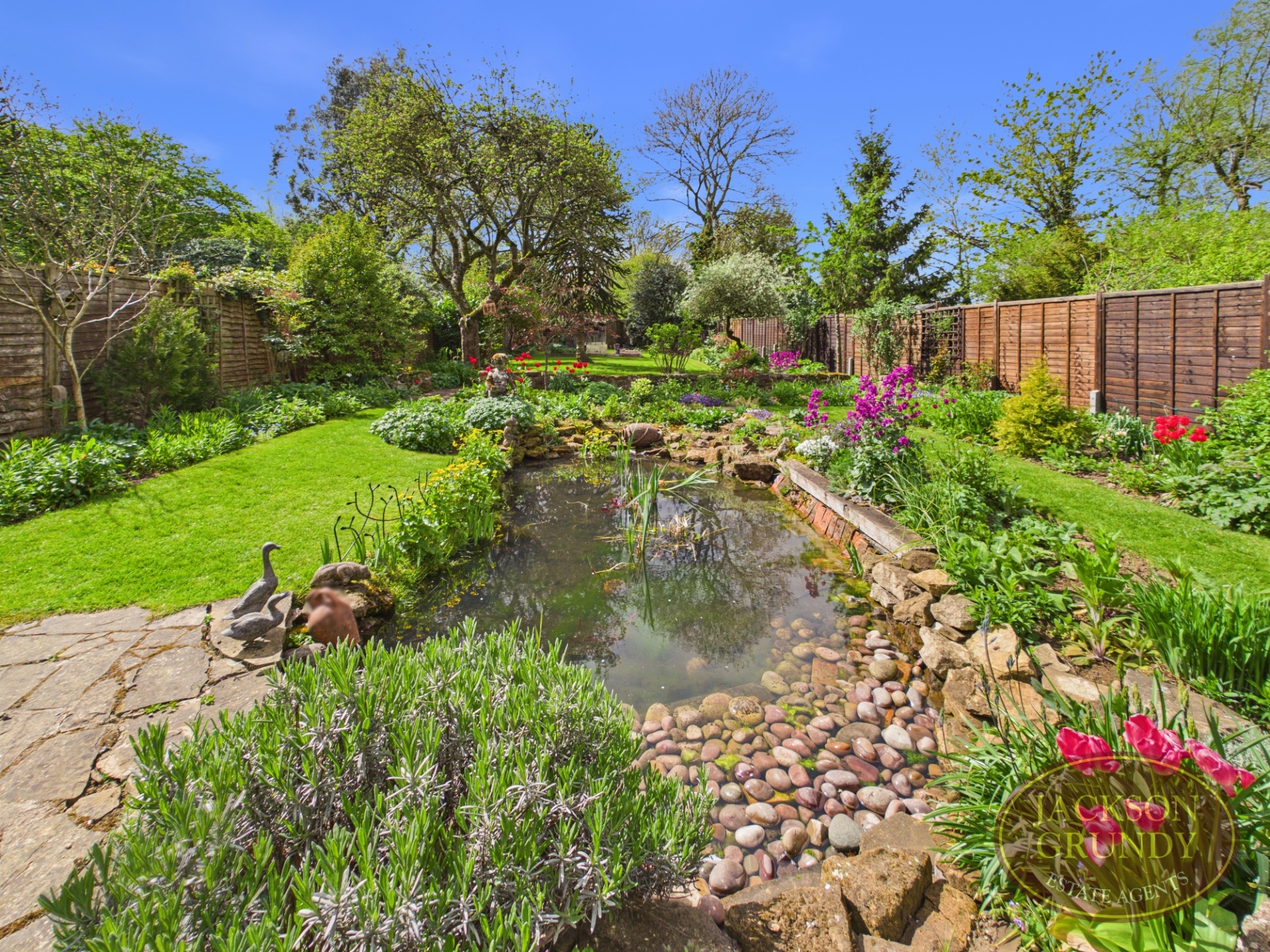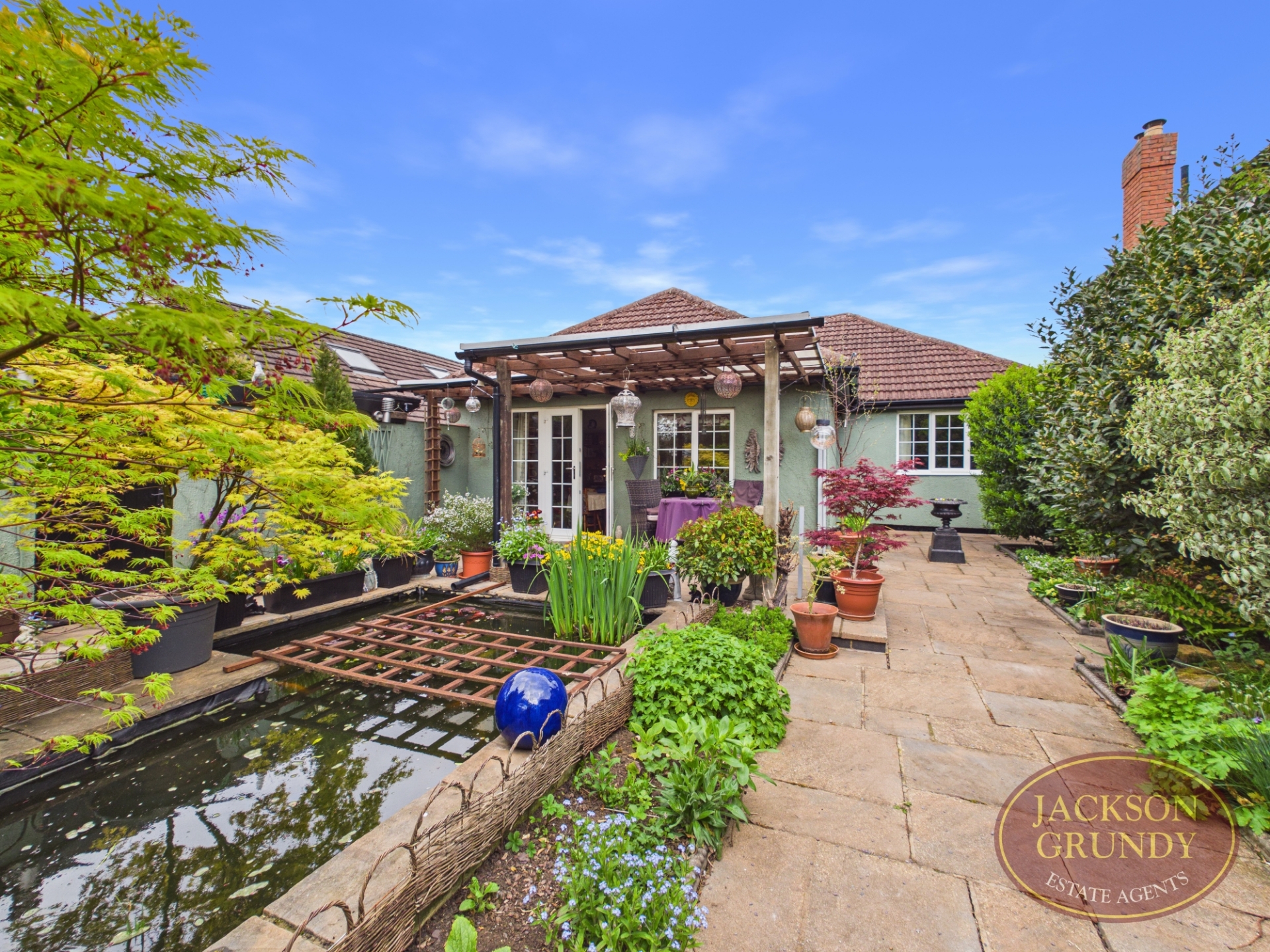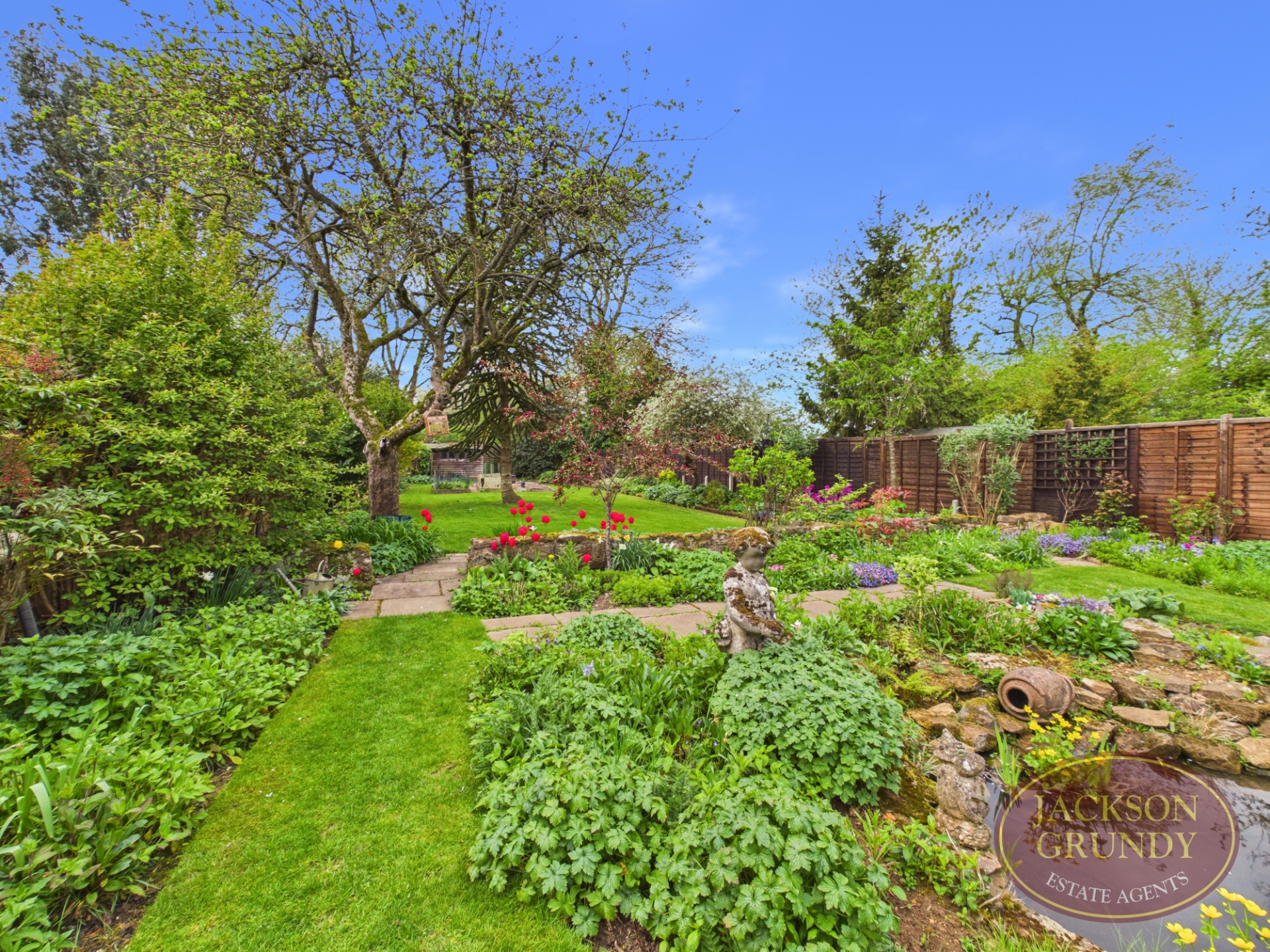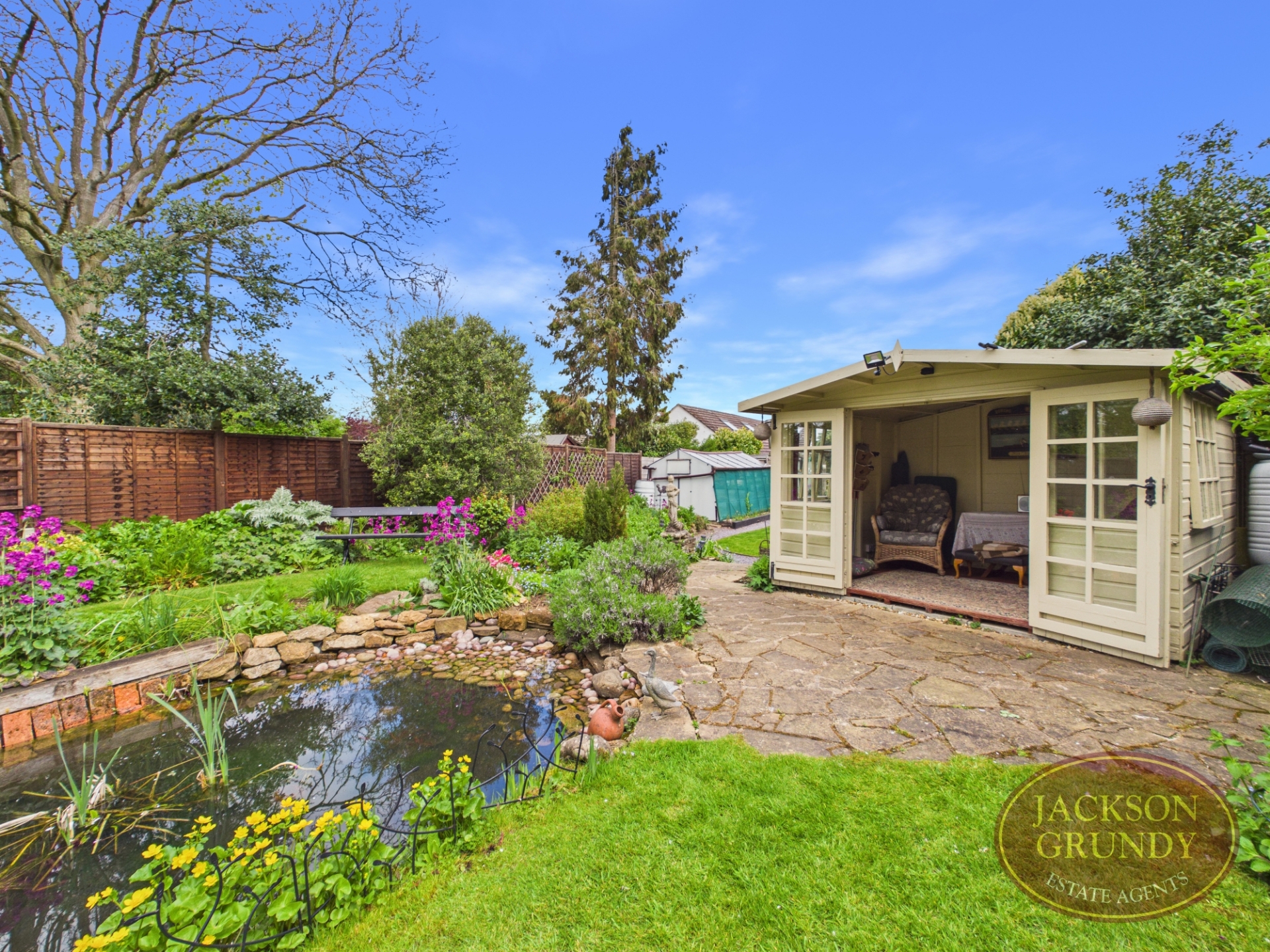 A standout feature is the impressive south west facing rear garden, enjoying a high degree of privacy and thoughtfully landscaped with mature planting, lawned areas, a pond, pergola seating area and a garden room perfect for relaxing or entertaining. To the front, a substantial gravel driveway provides off road parking for multiple vehicles.