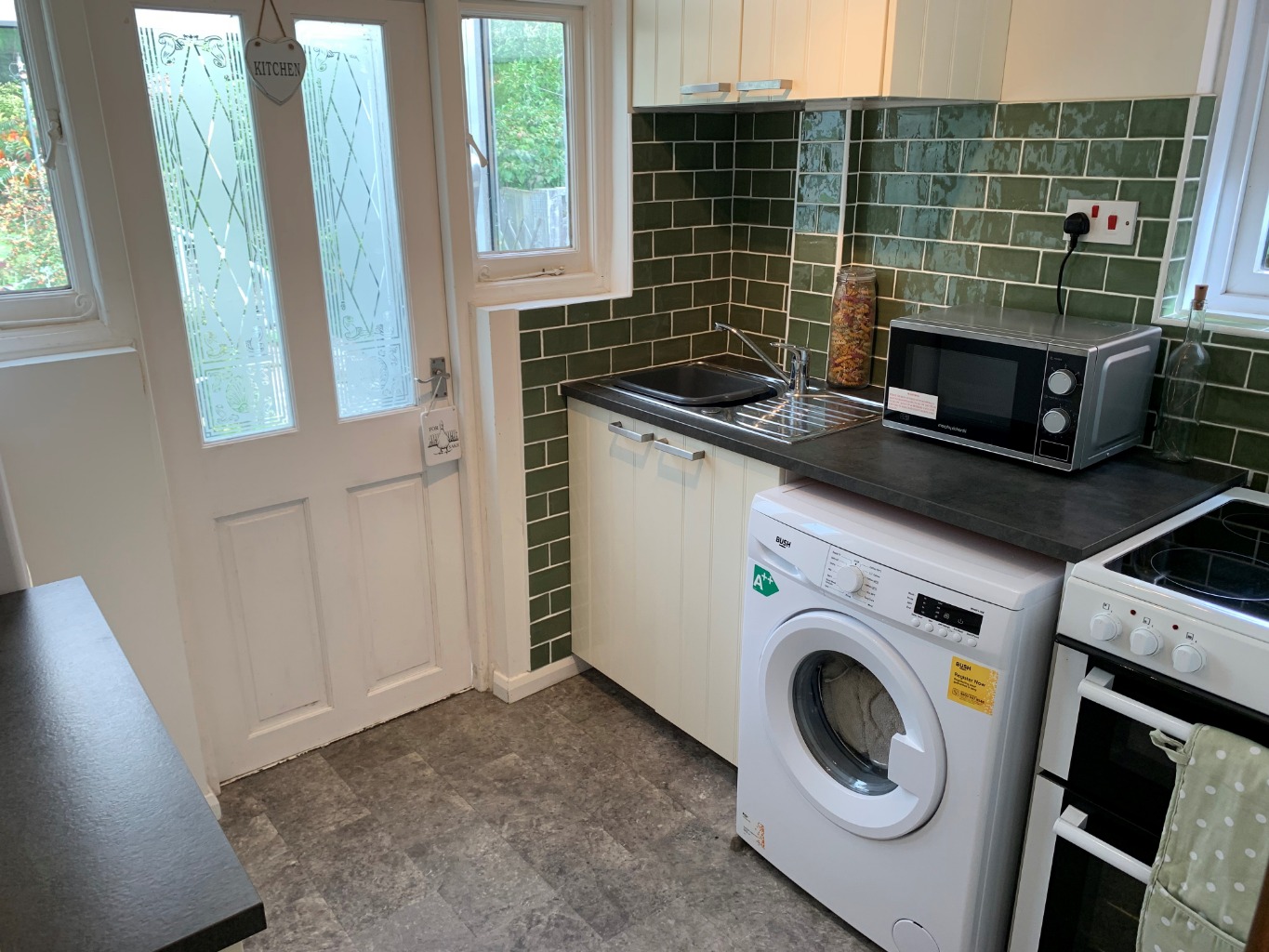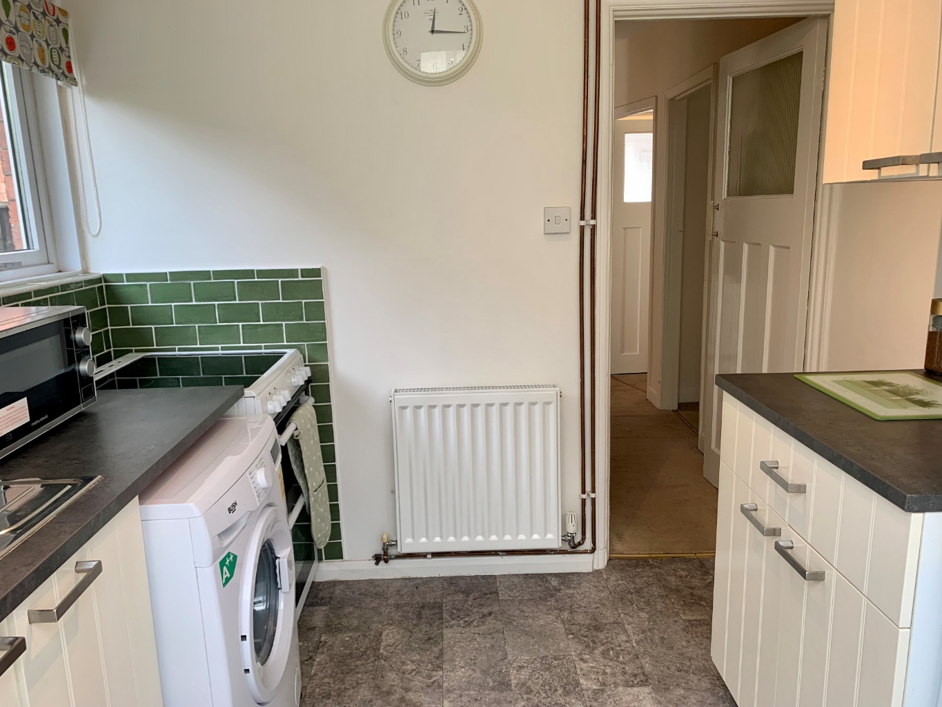 Double glazed window to side elevation. Door to lean to. Wall and base units. Stainless steel sink with mixer tap. Space for washing machine, fridge/freezer and cooker. Radiator. Tiling to splash back areas. Tile effect flooring.