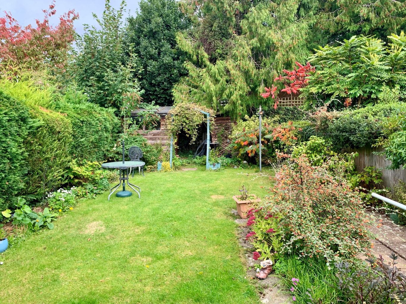 Enclosed by panelled fencing with hedging to sides Central lawn. Shed space to rear. Path to rear.