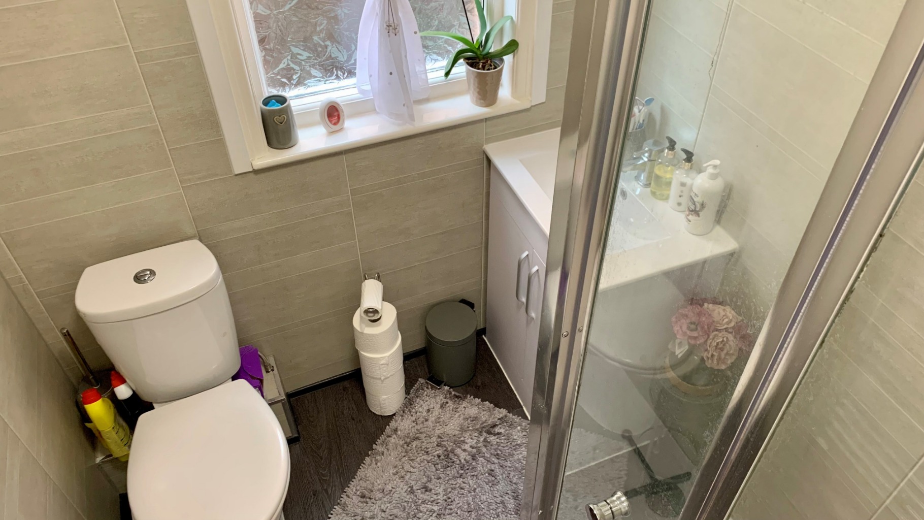 Double glazed window to side elevation. Heated towel rail. Suite comprising low level WC, wash hand basin set in vanity unit and shower cubicle with shower over. Tiling to splash back areas. Wood effect flooring. Heated towel rail.
