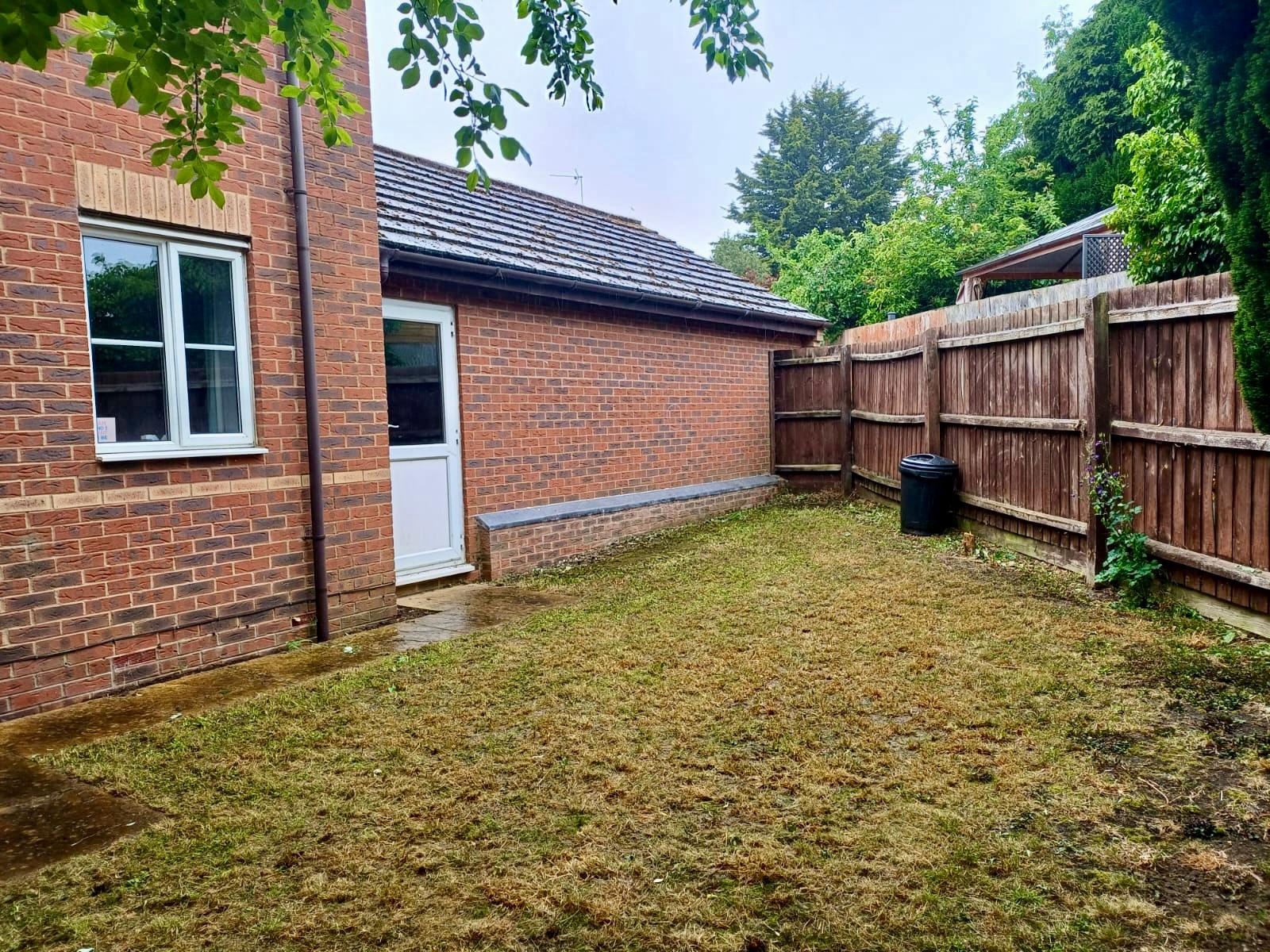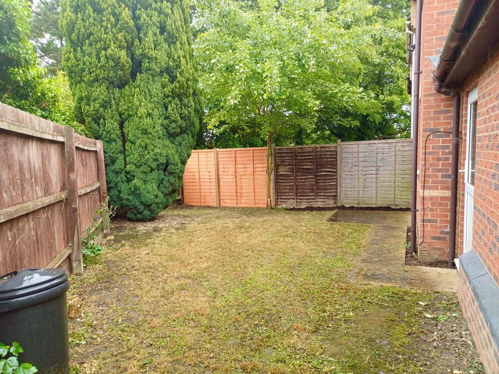 Mainly laid to lawn enclosed by wooden fencing. Patio terrace area. Door to garage,