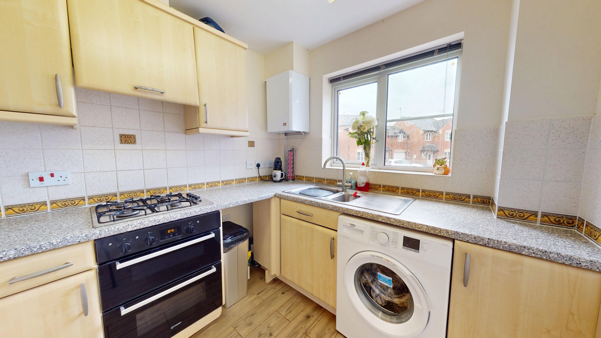 Double glazed window to rear elevation. Fitted with a range of wall mounted and base level cupboards with work surface over. One and half bowl stainless steel sink drainer unit. Tiled splash backs. Integrated appliances to include stainless steel double oven and gas hob with extractor canopy. Space and plumbing for washing machine and fridge/freezer. Wall mounted gas boiler serving domestic central heating and hot water systems.