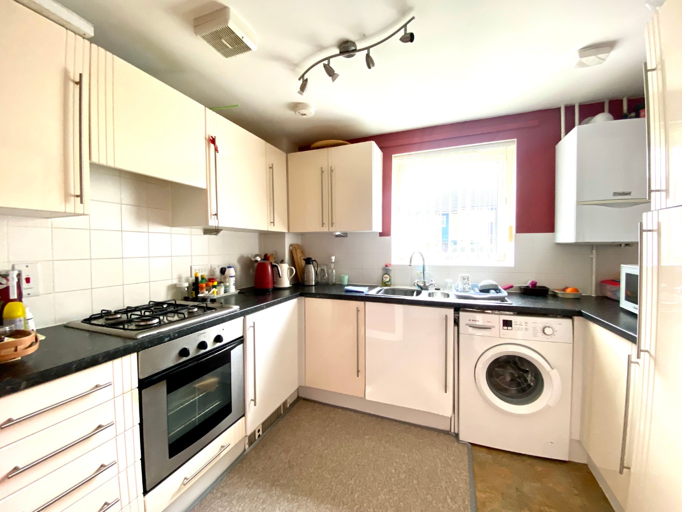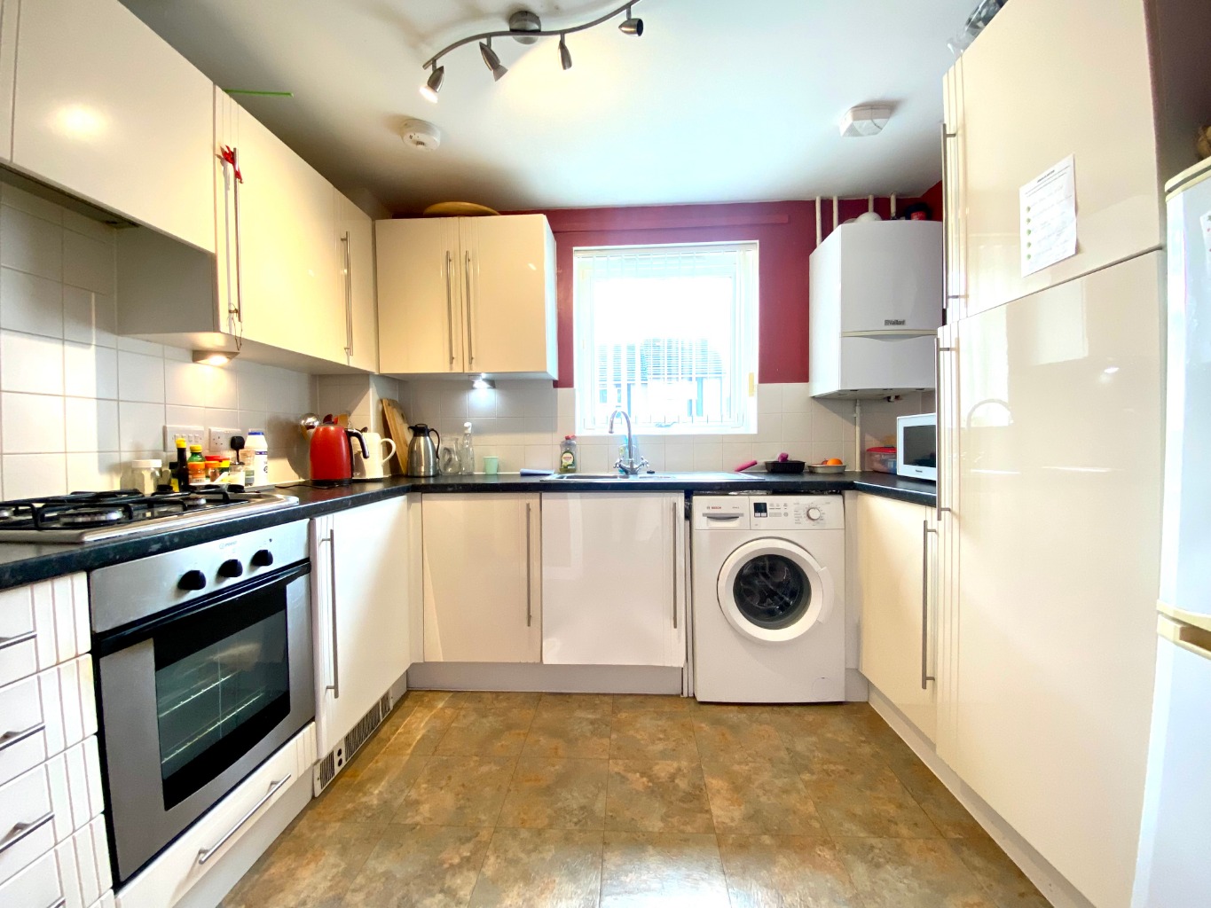 Timber framed double glazed window to front elevation. Wall and base units with square top work surfaces. Stainless steel sink and drainer. Four ring gas hob, electric oven and extractor. Space for white goods. Combination boiler. Tiling to splash back areas.