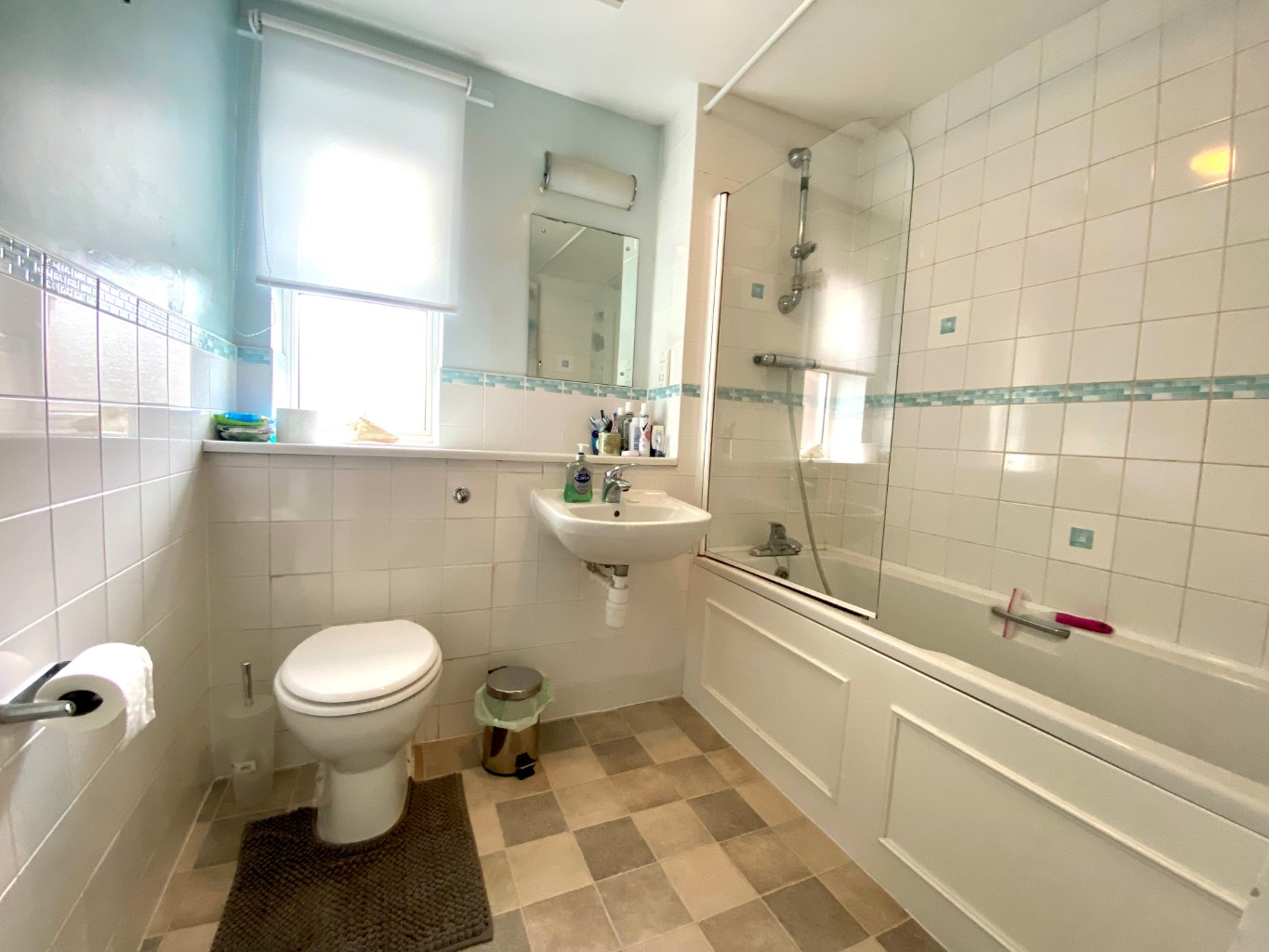 Frosted timber framed window to front elevation. Radiator. Suite comprising low level WC, wall mounted wash hand basin and panelled bath with glass screen and shower over. Tiling to splash back areas. Shaver point. Extractor.