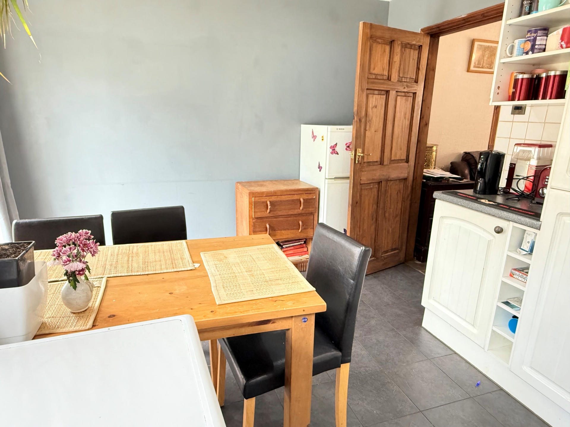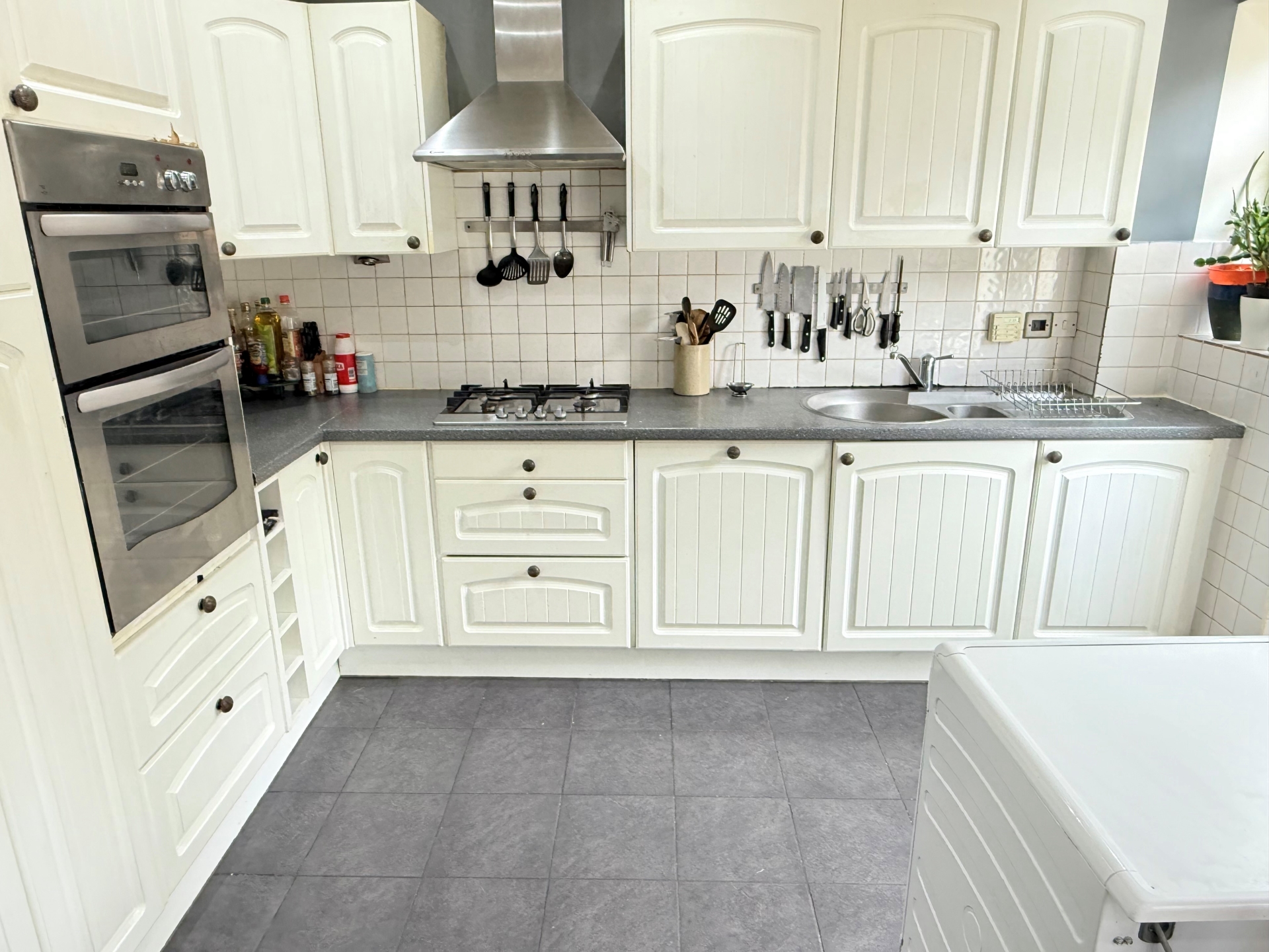 uPVC double glazed French doors to rear elevation. uPVC double glazed door and window to rear elevation. Upright wall mounted radiator. Wall and base units. Gas hob, oven and grill. Stainless steel sink with mixer tap. Integrated dishwasher. Space for washing machine, tumble dryer and fridge/freezer. Spotlights. Wall mounted boiler.