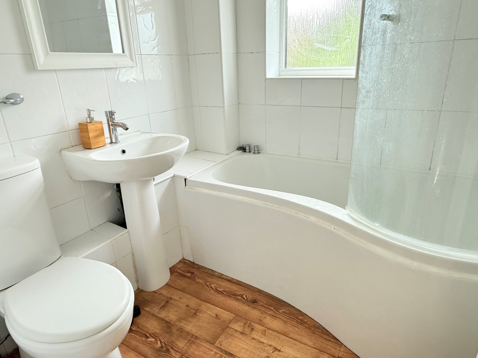 Obscure uPVC double glazed window to rear elevation. Heated towel rail. Suite comprising panelled bath with mixer tap with electric shower, pedestal wash hand basin and low level WC. Tiling to splash back areas. Extractor. Spotlight.